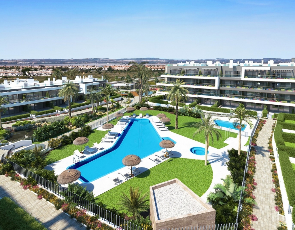 These East or West Facing, Brand New, Three Bedroom, Bungalow style Apartments in La Siesta are located on the edge of the stunning salt lakes, just a 5-minute drive to the Habaneras shopping centre, Carrefour superstore, and a wide choice of café bars and restaurants. Set on the outskirts of Torrevieja, known for its promenade, International Marina and sandy beaches, plus a selection of popular golf courses are all within a 20-minute drive, offering the perfect blend of natural beauty and modern convenience on the Costa Blanca South. This stylish new complex, one of various being built by this exceptional constructor, offers a variety of apartment layouts from 100m2 across ground and top floors — all arranged around a beautifully designed, feature heated communal pool area. Ground floor properties boast private gardens, while top floor units benefit from spacious solariums, perfect for soaking up the Mediterranean sun. Each apartment features a bright, modern, open-plan living area with direct access to a private terrace overlooking the pool, lagoon and landscaped gardens. The fitted kitchen includes a separate utility area for added convenience. There are three double bedroom with built-in wardrobes, master including an en suite shower room and access to the private terrace. There is also a further family shower room. Additional features include, intercom system, and air conditioning throughout. Residents of the complex also enjoy access to an exclusive sport and spa club offering facilities such as a sauna, gym, and jacuzzi — ideal for both relaxation and wellbeing. Whether you’re looking for a permanent home, a stylish holiday getaway, or a solid investment, these brand new homes in La Siesta offer outstanding value in a well-connected location.