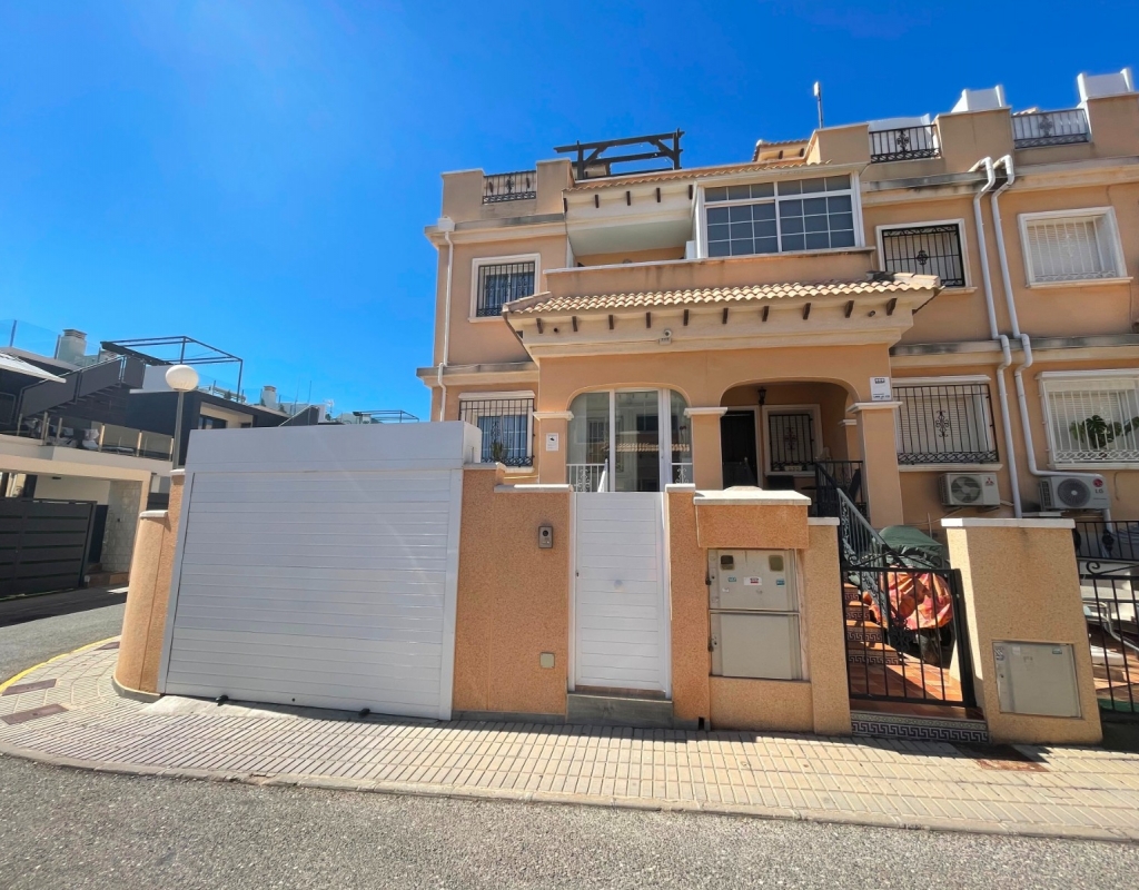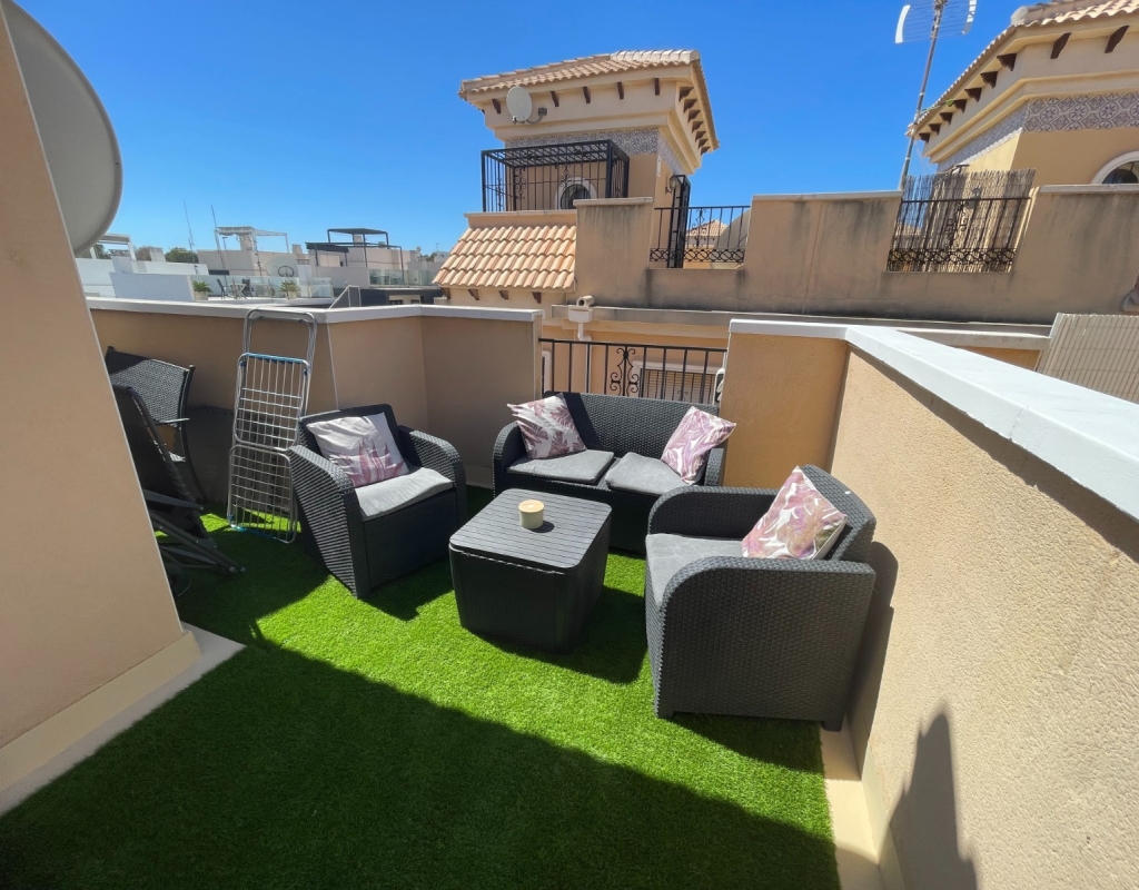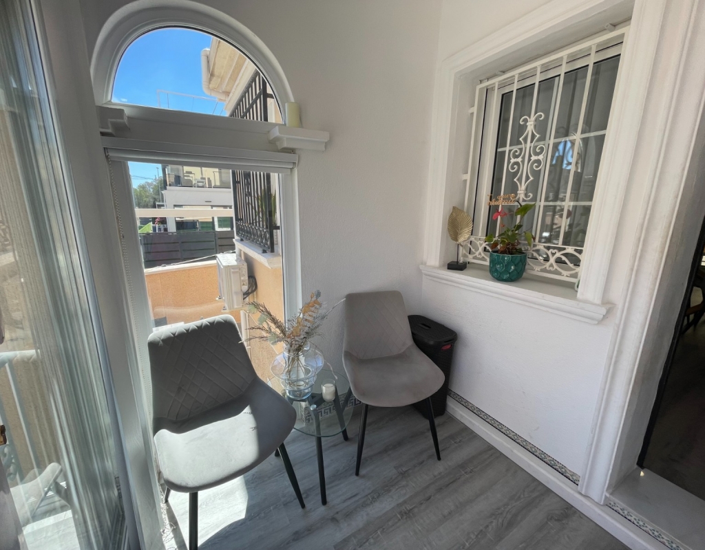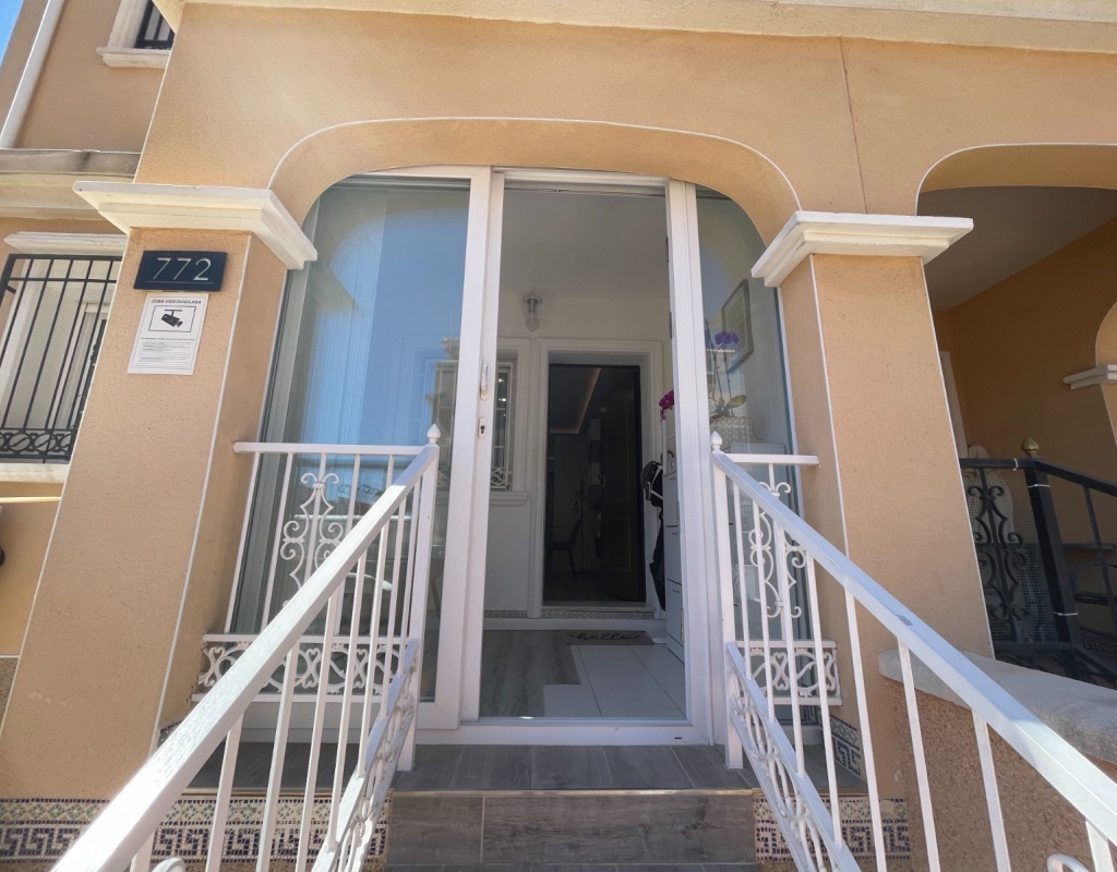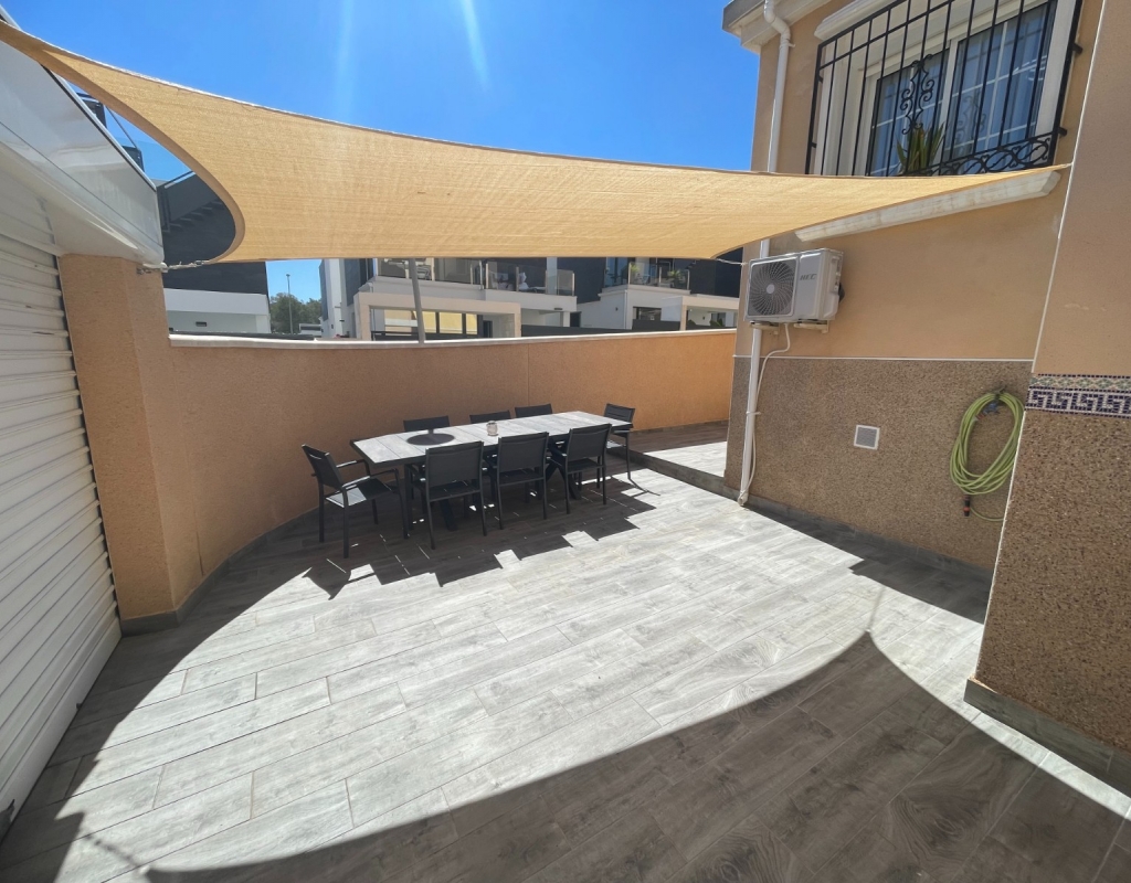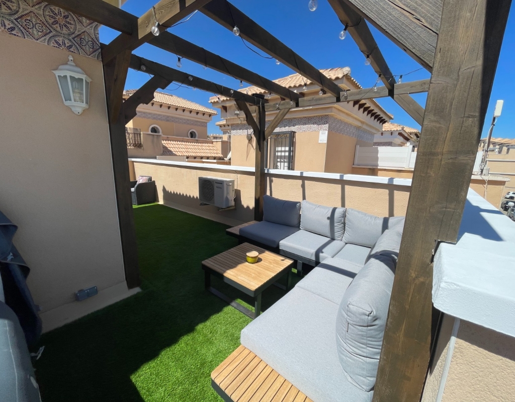 This South East Facing, Three Bedroom, Semi Detached Villa in Villamartin is located in a popular and well-established area of the Costa Blanca South. Just a 10-minute walk to a main chain supermarket, café bar, and the JYSK home store, with a further 15-minute stroll to a commercial centre offering a range of dining options. The renowned Villamartin golf course is only a 5-minute drive away, while the stunning beaches and the ever-popular La Zenia Boulevard shopping centre can be reached within 10 minutes. Situated on a desirable corner plot, this beautifully modernised villa boasts a stylish and light-filled interior. A glazed terrace leads into the open-plan living area, with stairs to the first floor just off the lounge. The stunning fitted kitchen features contemporary finishes and has direct access to a rear covered patio and utility area. A sleek ground-floor shower room adds extra convenience. Upstairs, you'll find three double bedrooms, two of which have built-in wardrobes. The master bedroom includes a ceiling fan, and the third bedroom opens onto a lovely private terrace. A modern shower room serves the upper floor. The exterior offers a low-maintenance, tiled garden with a clean, modern design, as well as off-road parking. The property also includes air con in the living room and two bedrooms, access to a communal pool and a handy store room. A private solarium completes this fantastic home, offering sunny spots to relax and dine. This is a fantastic opportunity to own a stylish home in the heart of Villamartin — ideal for holidays, rental investment, or permanent living on the Costa Blanca South.