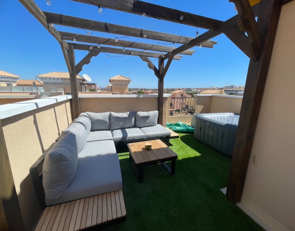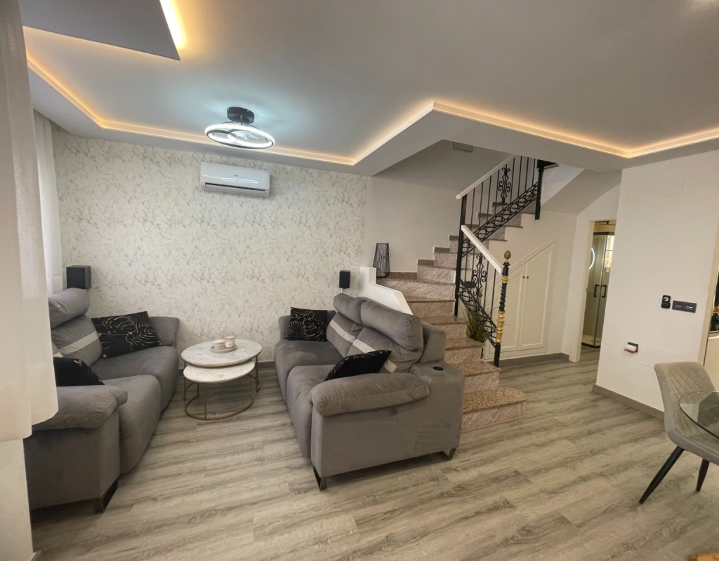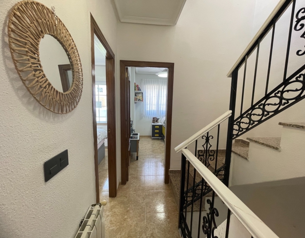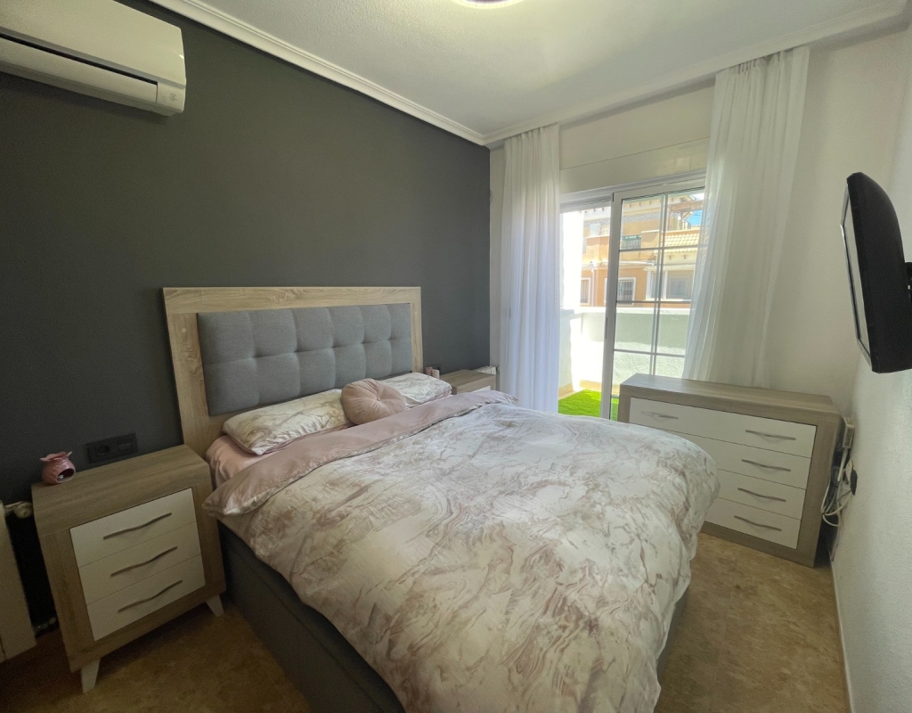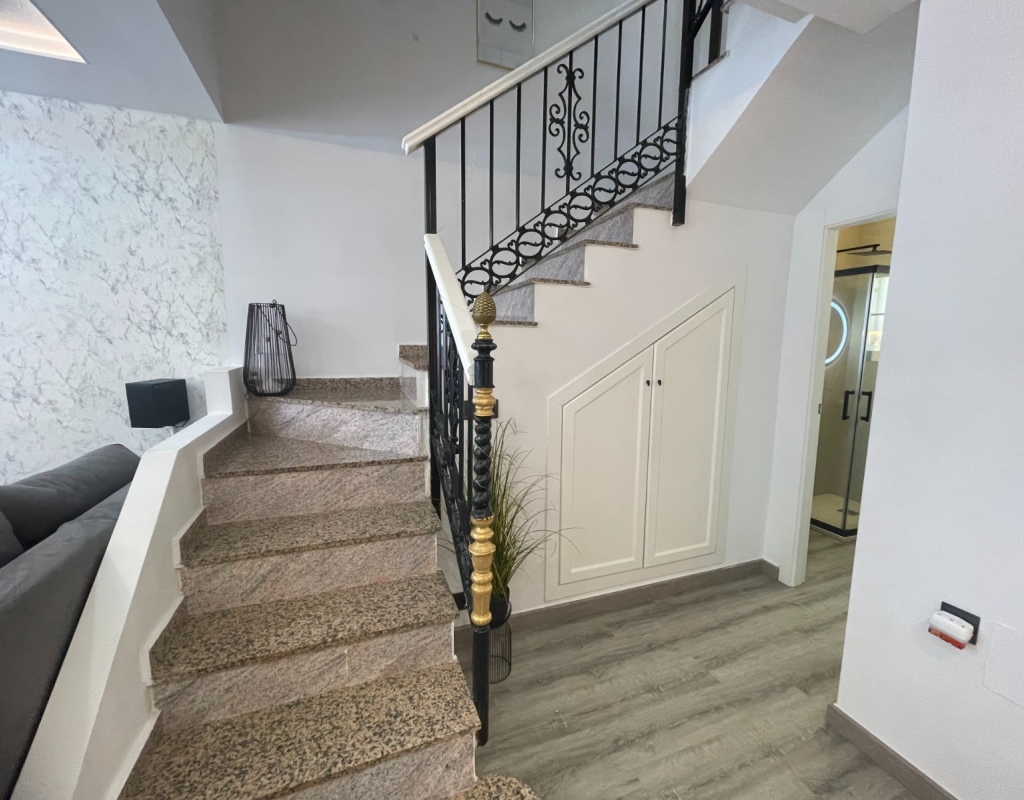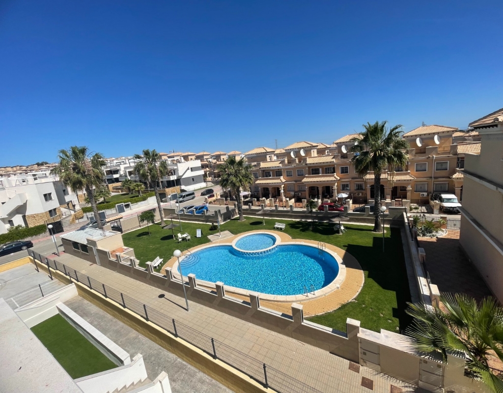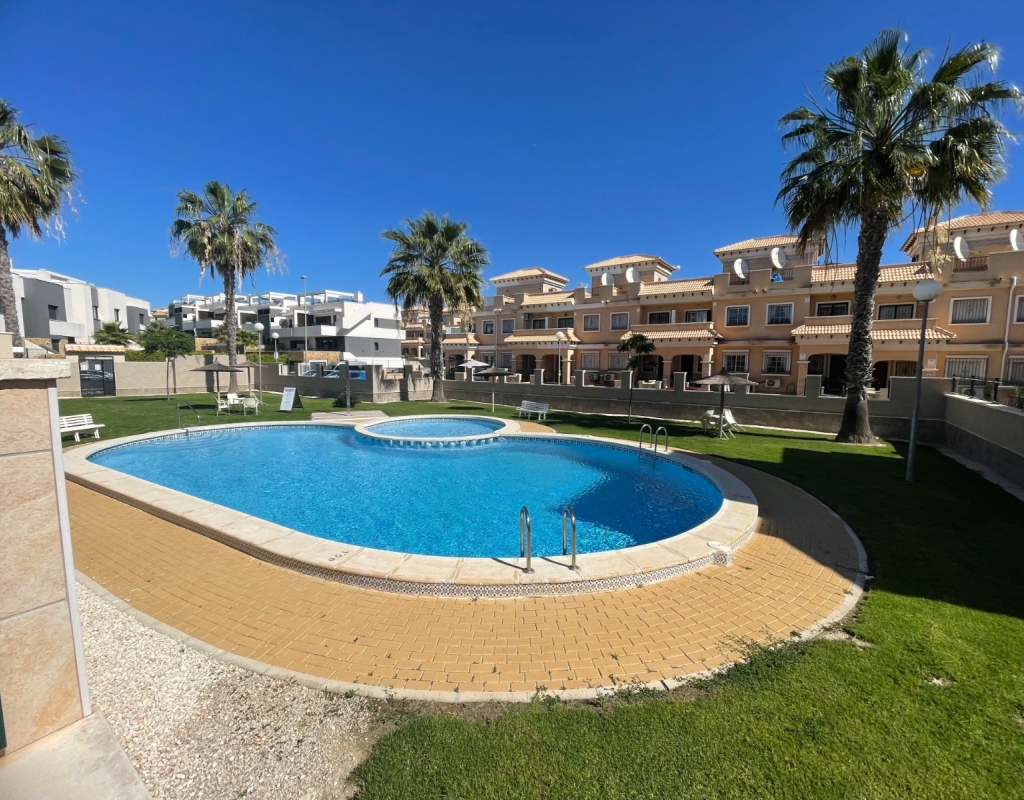 This South East Facing, Three Bedroom, Semi Detached Villa in Villamartin is located in a popular and well-established area of the Costa Blanca South. Just a 10-minute walk to a main chain supermarket, café bar, and the JYSK home store, with a further 15-minute stroll to a commercial centre offering a range of dining options. The renowned Villamartin golf course is only a 5-minute drive away, while the stunning beaches and the ever-popular La Zenia Boulevard shopping centre can be reached within 10 minutes. Situated on a desirable corner plot, this beautifully modernised villa boasts a stylish and light-filled interior. A glazed terrace leads into the open-plan living area, with stairs to the first floor just off the lounge. The stunning fitted kitchen features contemporary finishes and has direct access to a rear covered patio and utility area. A sleek ground-floor shower room adds extra convenience. Upstairs, you'll find three double bedrooms, two of which have built-in wardrobes. The master bedroom includes a ceiling fan, and the third bedroom opens onto a lovely private terrace. A modern shower room serves the upper floor. The exterior offers a low-maintenance, tiled garden with a clean, modern design, as well as off-road parking. The property also includes air con in the living room and two bedrooms, access to a communal pool and a handy store room. A private solarium completes this fantastic home, offering sunny spots to relax and dine. This is a fantastic opportunity to own a stylish home in the heart of Villamartin — ideal for holidays, rental investment, or permanent living on the Costa Blanca South.