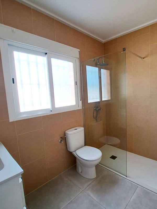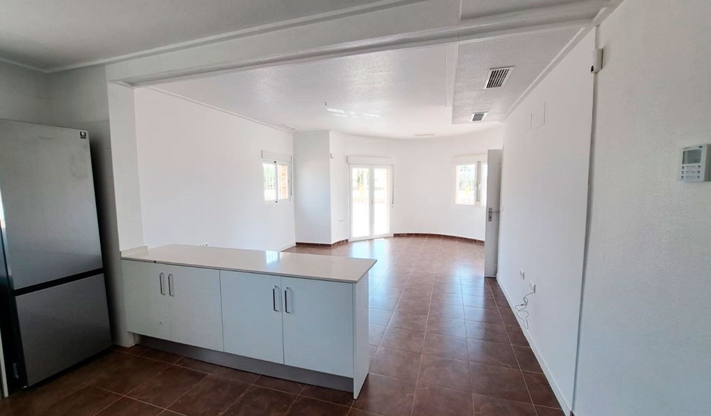 This South Facing, Three Bedroom, Detached Villa in Catral is located in the peaceful countryside, just a 5-minute drive from the amenities of both Catral and Dolores. Ideally situated, the beautiful beaches of the Costa Blanca South can be reached in just 15 minutes, with a range of excellent golf courses around a 20-minute drive away. This key ready, single-level villa offers a generous 139m² build on a spacious 2,300m² fully walled plot. A charming circular covered entrance terrace welcomes you into the bright open-plan living area, which features double-opening doors that allow natural light to flood the space. The modern, open-plan fitted kitchen includes a breakfast bar and a door leading directly out to the garden. There are three double bedrooms, all with built-in wardrobes, and two stylish shower rooms, including an en suite to the master bedroom. The home also benefits from pre-installed air conditioning and is equipped with 3 solar panels for improved energy efficiency. External stairs lead to a private solarium offering lovely mountain and countryside views — an ideal spot for relaxing in the sun. The low-maintenance gravelled plot offers ample off-road parking and plenty of space to add a private pool if desired. This is a fantastic opportunity to enjoy peaceful rural living with modern comfort and easy access to all amenities on the Costa Blanca South.