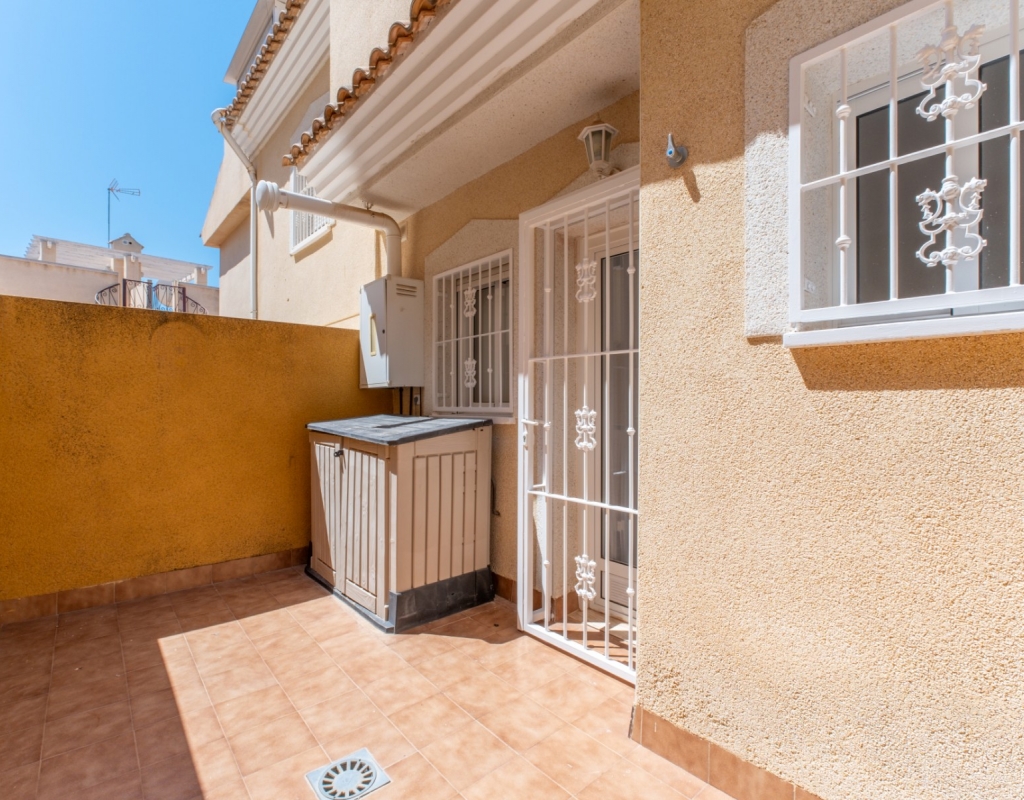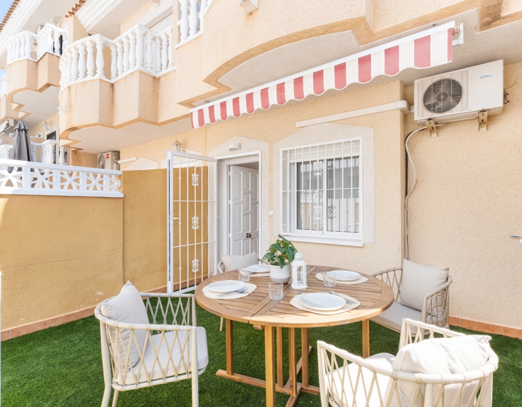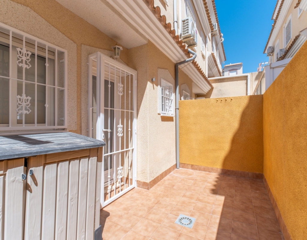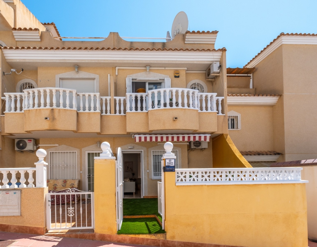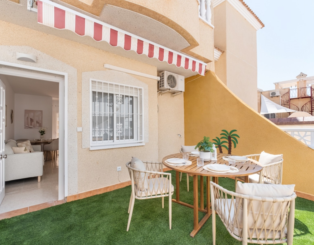 This West Facing, Two Bedroom, Townhouse in Villamartin is located within a 10-minute walk of various cafe bars, eating places, and a main chain supermarket. The La Fuente commercial centre is just a couple of minutes' drive away, and there's a choice of three golf courses within a 5-minute drive. For retail therapy, La Zenia Boulevard shopping centre is 10 minutes away, and the coast can be reached in 10 minutes. This beautifully presented, reformed property boasts an 80m² build. The living room features stairs leading up to the first floor and air conditioning. There's an open-plan fitted kitchen with a utility area and a door leading out to a rear patio. A convenient cloakroom completes the ground floor. On the first floor, you'll find two double bedrooms with built-in wardrobes. The master bedroom benefits from air conditioning and access to a terrace. A modern shower room serves both bedrooms. The solarium, measuring 17m², is accessed via the master bedroom. Outside, the front garden features artificial grass and off-road parking. There's also a useful 14m² storeroom. Residents have access to a communal pool. This property is situated in Costa Blanca South.