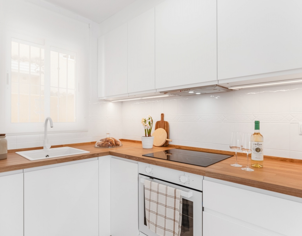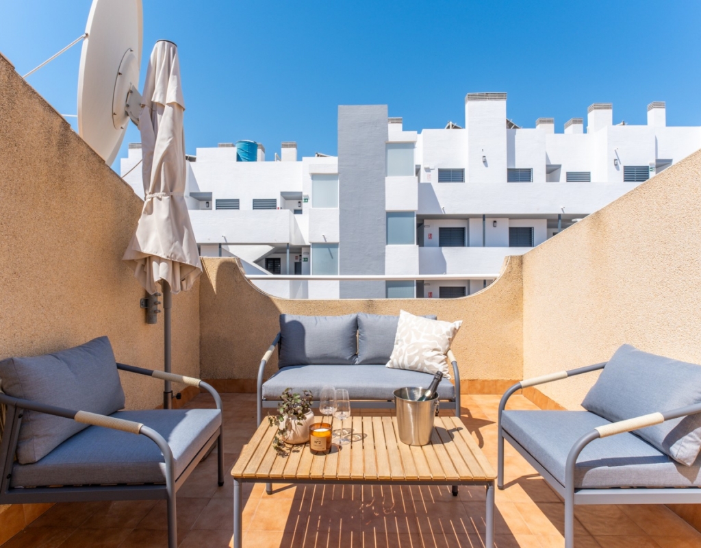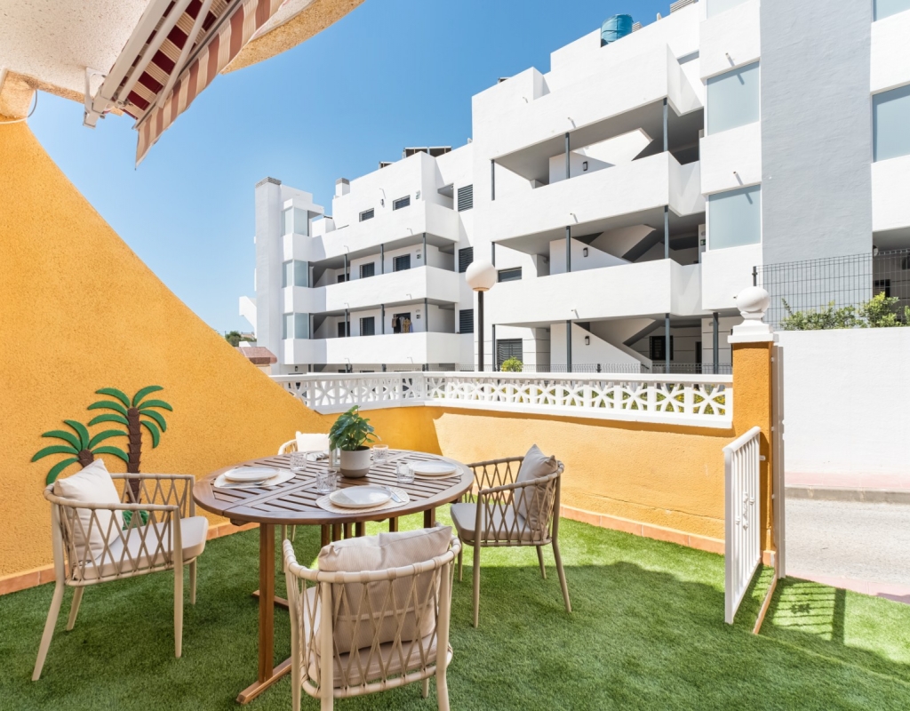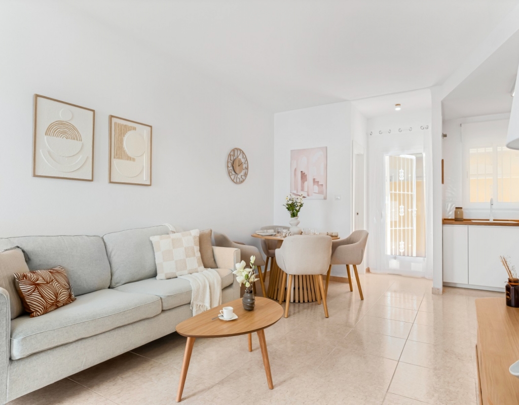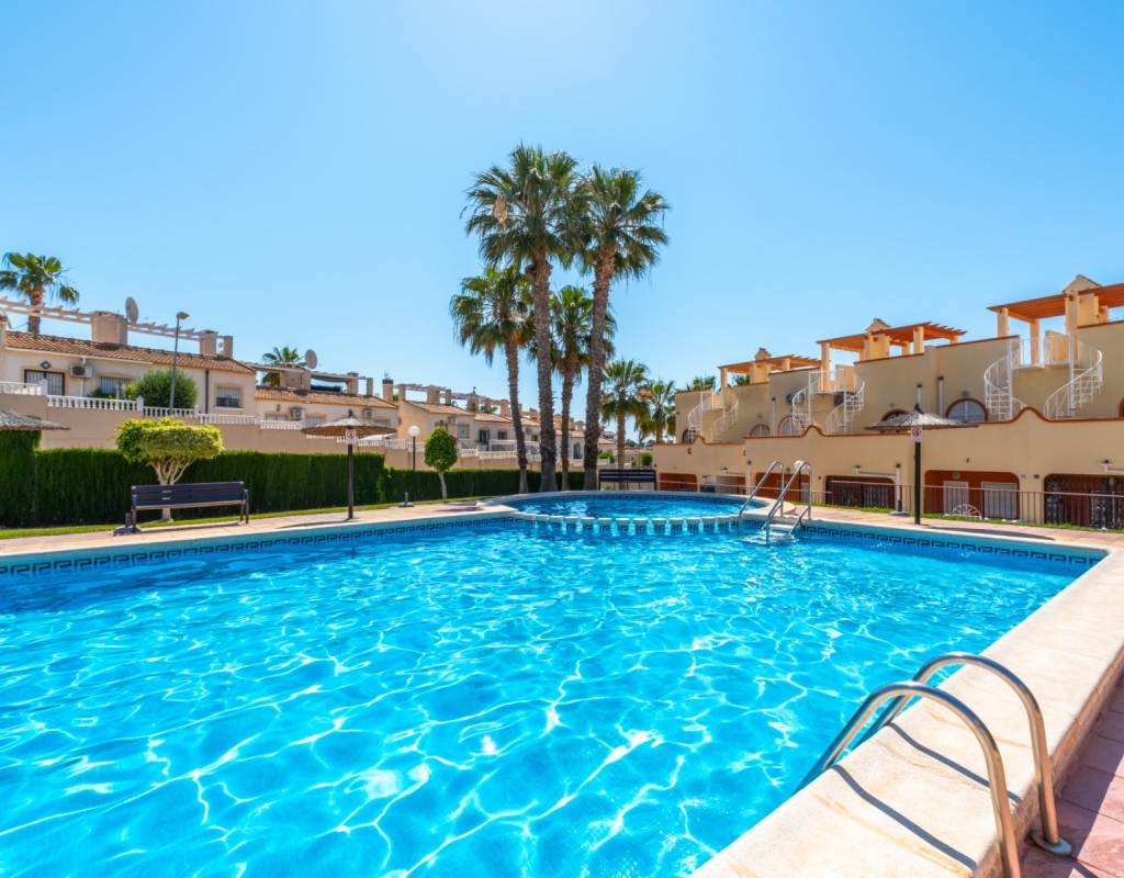 This West Facing, Two Bedroom, Townhouse in Villamartin is located within a 10-minute walk of various cafe bars, eating places, and a main chain supermarket. The La Fuente commercial centre is just a couple of minutes' drive away, and there's a choice of three golf courses within a 5-minute drive. For retail therapy, La Zenia Boulevard shopping centre is 10 minutes away, and the coast can be reached in 10 minutes. This beautifully presented, reformed property boasts an 80m² build. The living room features stairs leading up to the first floor and air conditioning. There's an open-plan fitted kitchen with a utility area and a door leading out to a rear patio. A convenient cloakroom completes the ground floor. On the first floor, you'll find two double bedrooms with built-in wardrobes. The master bedroom benefits from air conditioning and access to a terrace. A modern shower room serves both bedrooms. The solarium, measuring 17m², is accessed via the master bedroom. Outside, the front garden features artificial grass and off-road parking. There's also a useful 14m² storeroom. Residents have access to a communal pool. This property is situated in Costa Blanca South.