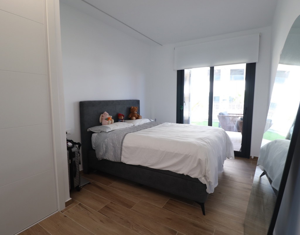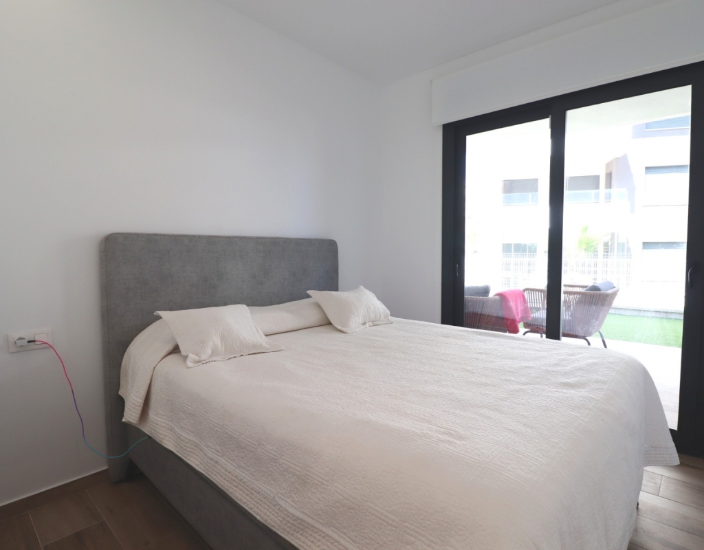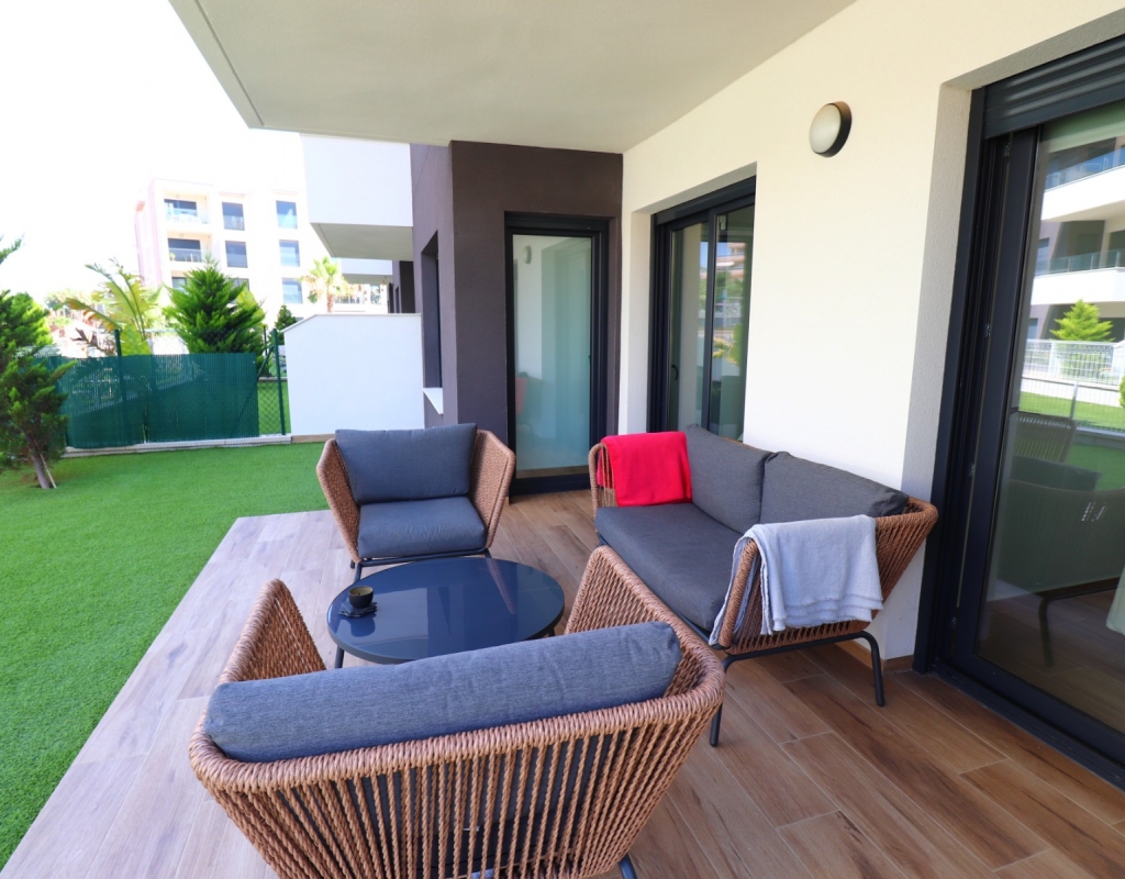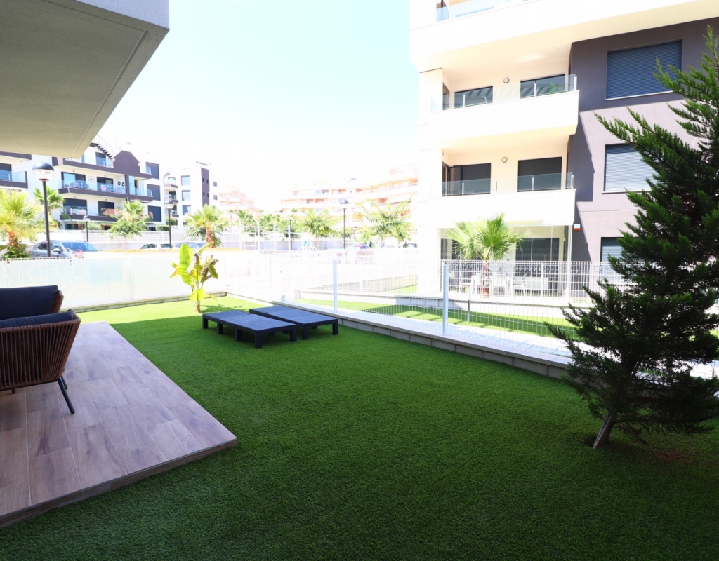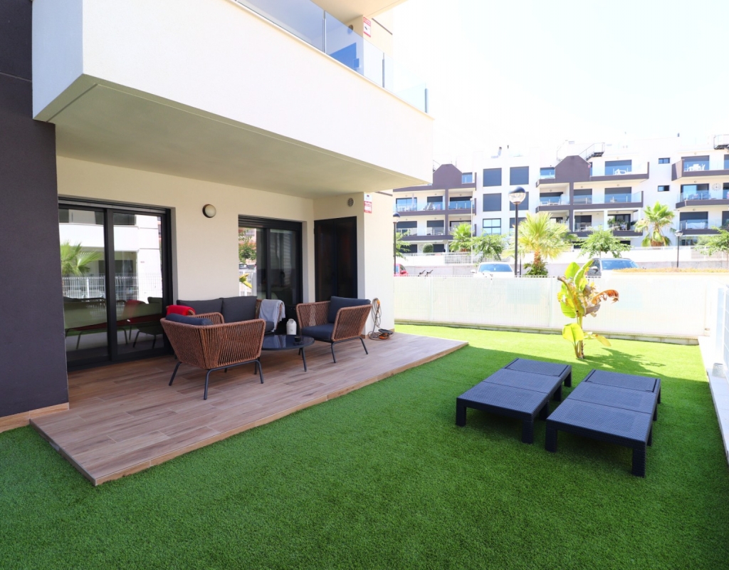 This Modern, Two Bedroom, Ground Floor Corner Apartment in Villamartin is located within a highly sought-after, beautifully maintained gated community, just a 10–15 minute walk to a variety of bars, restaurants, and Greenlands Mini Golf. Villamartin Golf Course is only a few minutes’ drive away, with the popular La Zenia Boulevard shopping centre reachable in 10 minutes and the stunning beaches of the Orihuela Costa in 10 minutes also. This stylish apartment features a bright, open-plan living space with a fitted, modern and classy kitchen, complemented by a separate utility area. Both double bedrooms have access to the terrace and built-in storage, with two sleek shower rooms, including one en suite to the master. The property also boasts a private garden area laid with low-maintenance astro turf, ideal for relaxing or entertaining. Additional features include ducted air conditioning throughout, an allocated parking space, and access to a lovely communal pool — all located in the heart of Costa Blanca South.