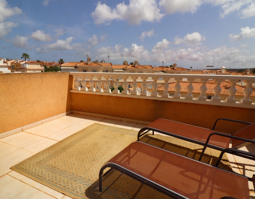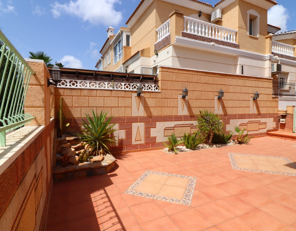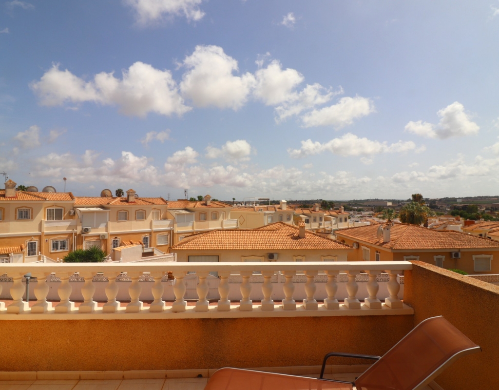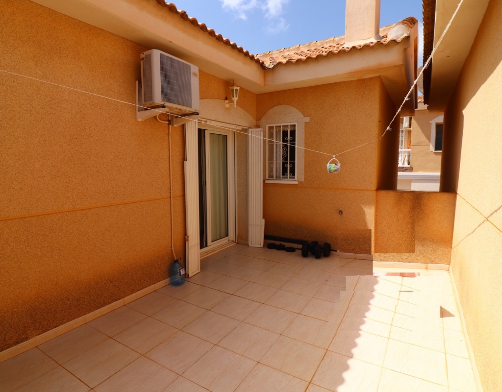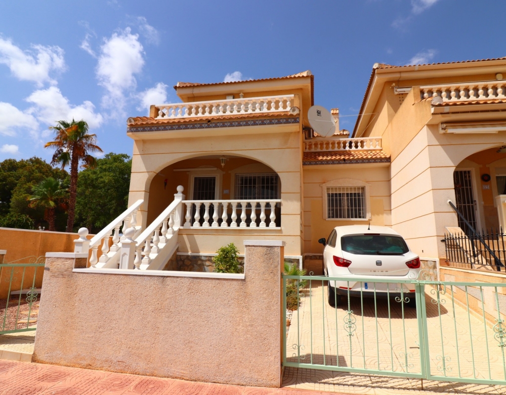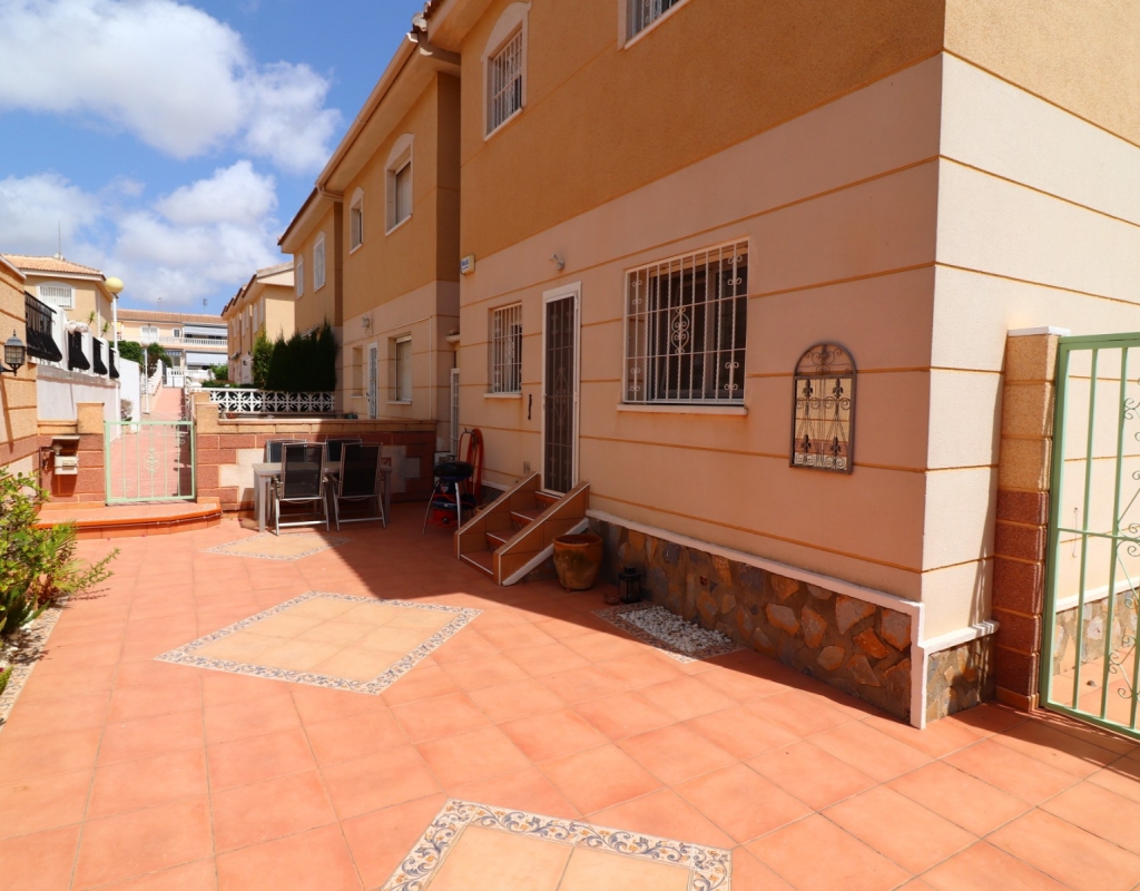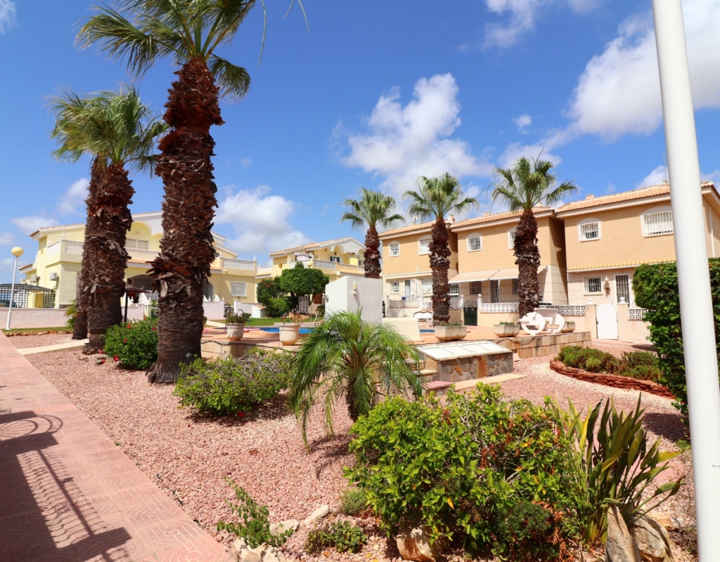 This South Facing, Three Bedroom, End Townhouse in Monte Azul is located on a well-established urbanisation, with a bar and restaurant on-site. Ideally positioned, it's only a 5-minute drive to the popular towns of Quesada and Benijofar, with both La Finca and La Marquesa golf courses reachable in 5 to 10 minutes. The beautiful beaches of the Costa Blanca South are approximately 15 minutes away by car. This beautifully presented property boasts a generous 136m² build and sits beside a charming gravelled and planted park area, adding a sense of openness and greenery. The covered front terrace leads into a bright and welcoming lounge, with stairs to the first floor and a wide archway through to the dining area. The separate fitted kitchen is well-equipped and includes a utility room and access out to the garden. Also on the ground floor is a shower room and a double bedroom — ideal for guests or ground-floor living. Upstairs, you’ll find two further double bedrooms, both with access to private terraces, and a spacious family bathroom featuring a corner bath and separate shower cubicle. Internal stairs provide access to the private rooftop solarium, offering plenty of space for relaxing and enjoying the sunshine. The garden has been thoughtfully designed for low maintenance with a mix of tiled patio, pebbled areas, and attractive planting. There's also off-road parking available. The property includes built-in wardrobes, air conditioning, and access to a lovely communal pool area surrounded by palm trees and landscaped garden area — perfect for enjoying the Mediterranean lifestyle. A fantastic home in a peaceful setting, with great access to amenities, golf, and the coast.