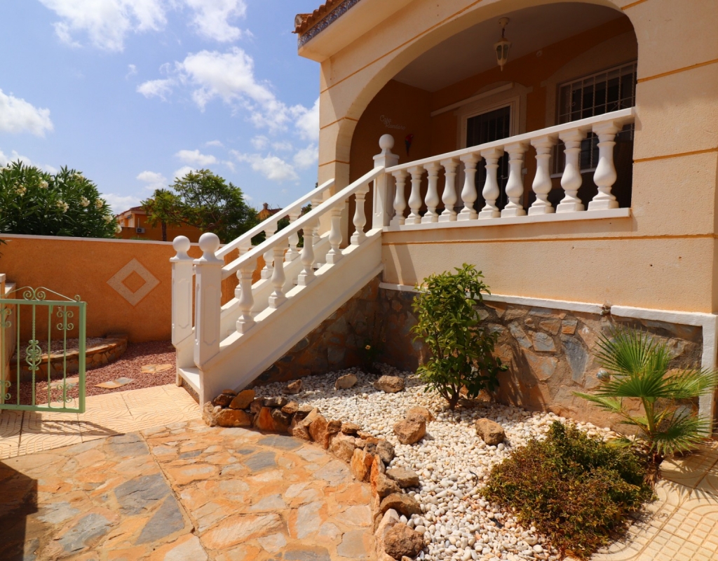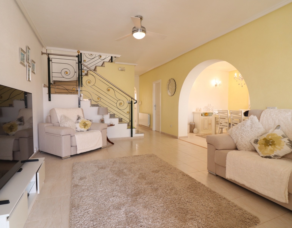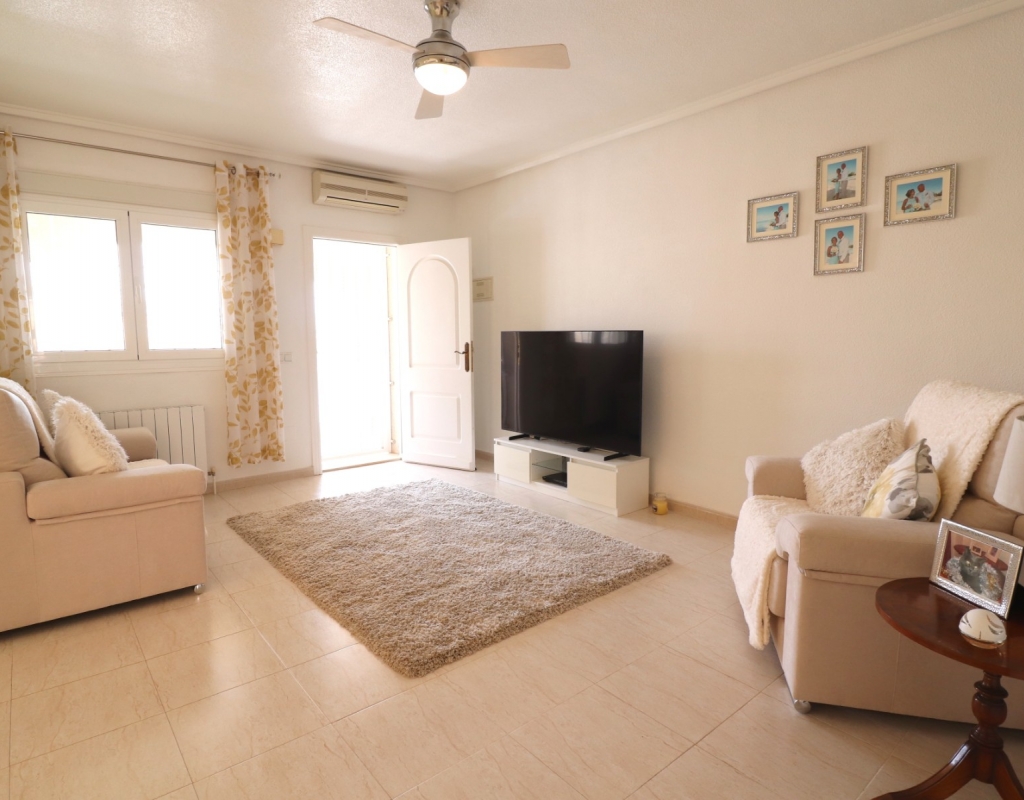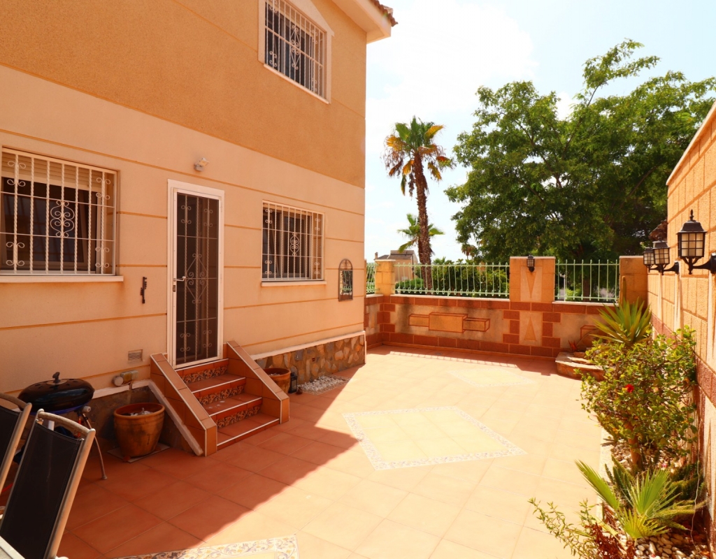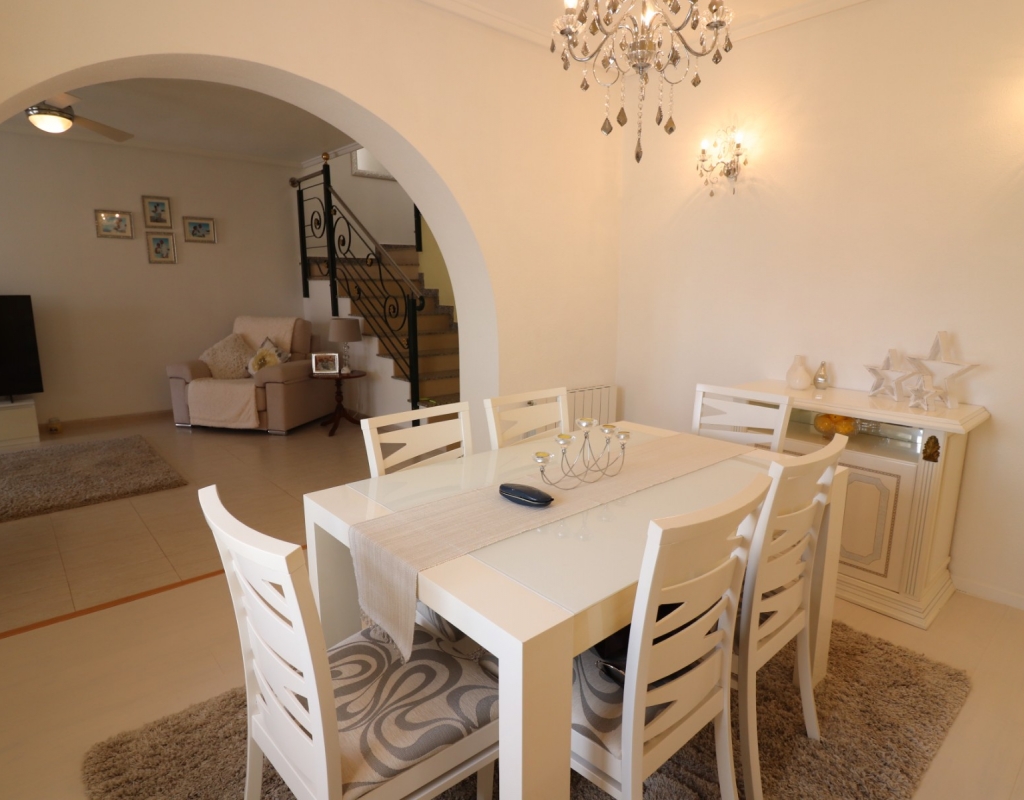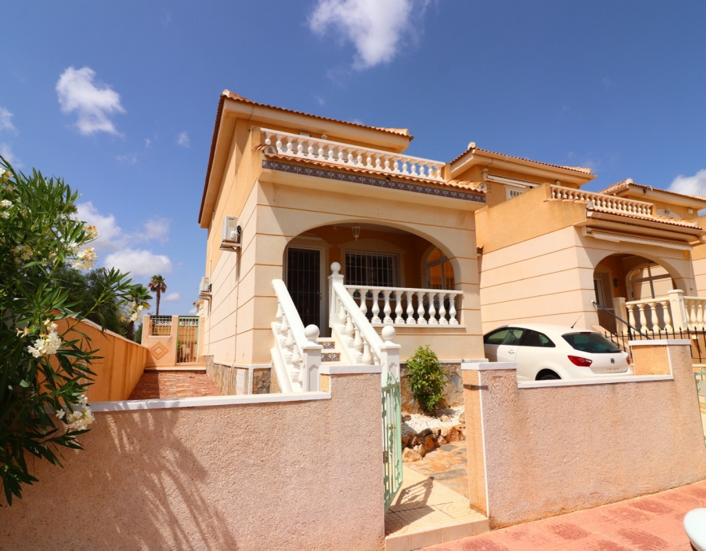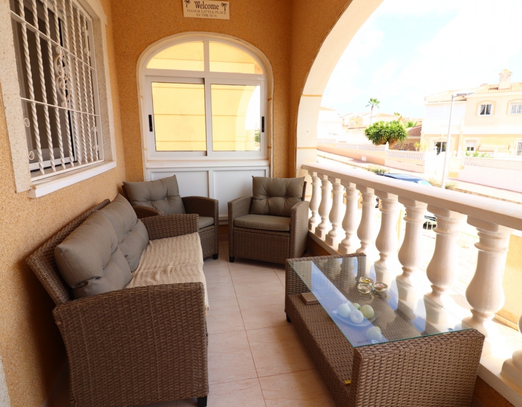 This South Facing, Three Bedroom, End Townhouse in Monte Azul is located on a well-established urbanisation, with a bar and restaurant on-site. Ideally positioned, it's only a 5-minute drive to the popular towns of Quesada and Benijofar, with both La Finca and La Marquesa golf courses reachable in 5 to 10 minutes. The beautiful beaches of the Costa Blanca South are approximately 15 minutes away by car. This beautifully presented property boasts a generous 136m² build and sits beside a charming gravelled and planted park area, adding a sense of openness and greenery. The covered front terrace leads into a bright and welcoming lounge, with stairs to the first floor and a wide archway through to the dining area. The separate fitted kitchen is well-equipped and includes a utility room and access out to the garden. Also on the ground floor is a shower room and a double bedroom — ideal for guests or ground-floor living. Upstairs, you’ll find two further double bedrooms, both with access to private terraces, and a spacious family bathroom featuring a corner bath and separate shower cubicle. Internal stairs provide access to the private rooftop solarium, offering plenty of space for relaxing and enjoying the sunshine. The garden has been thoughtfully designed for low maintenance with a mix of tiled patio, pebbled areas, and attractive planting. There's also off-road parking available. The property includes built-in wardrobes, air conditioning, and access to a lovely communal pool area surrounded by palm trees and landscaped garden area — perfect for enjoying the Mediterranean lifestyle. A fantastic home in a peaceful setting, with great access to amenities, golf, and the coast.