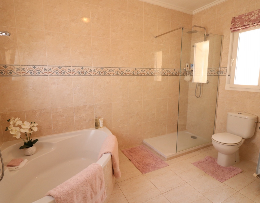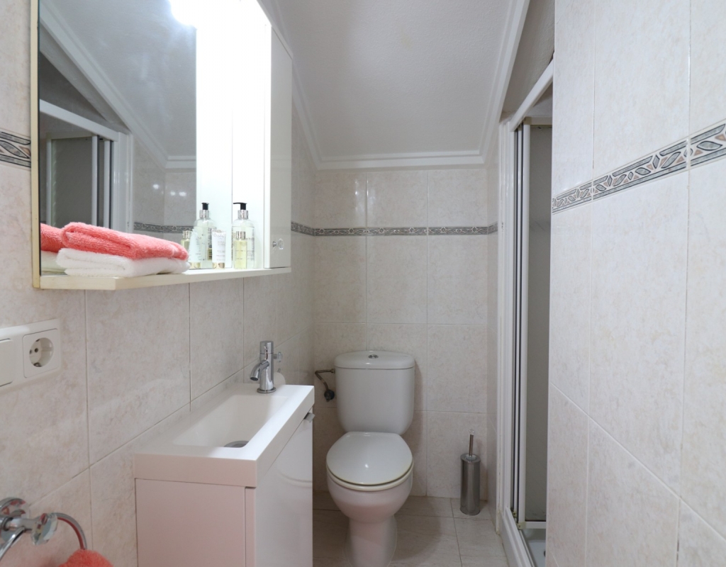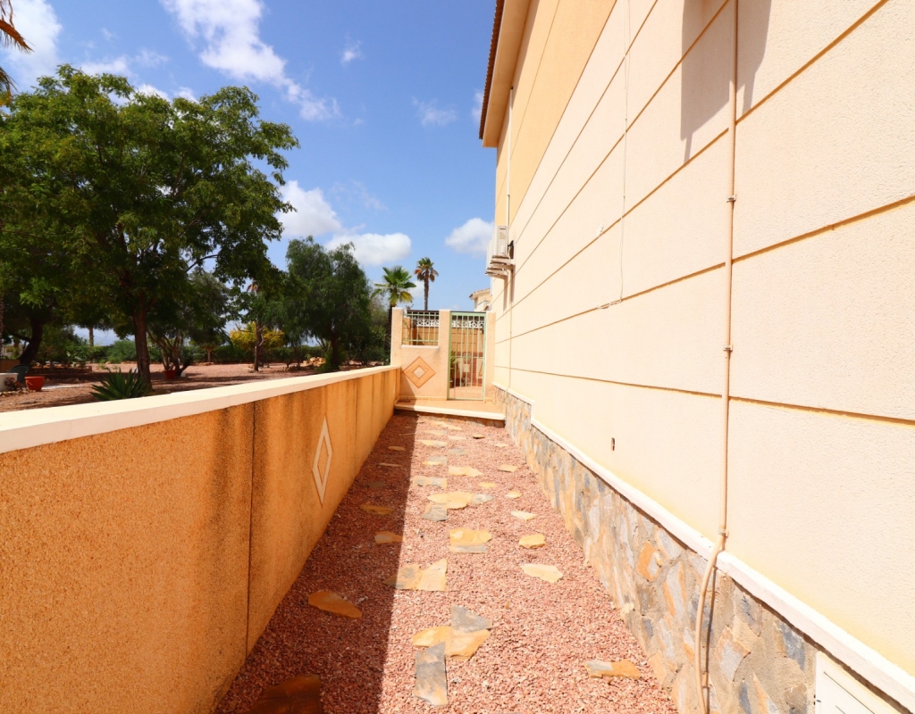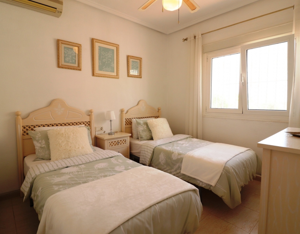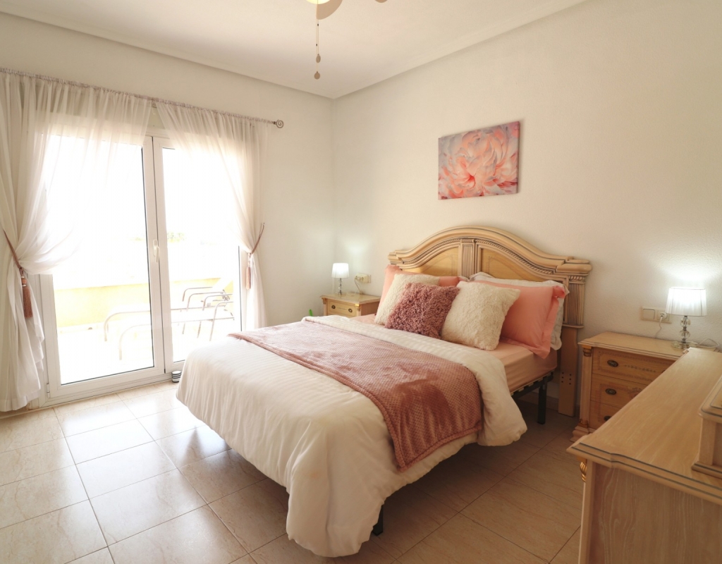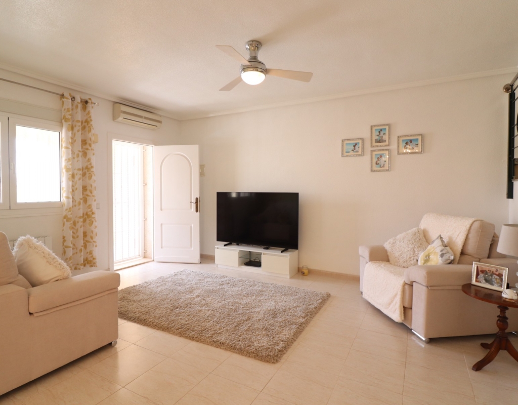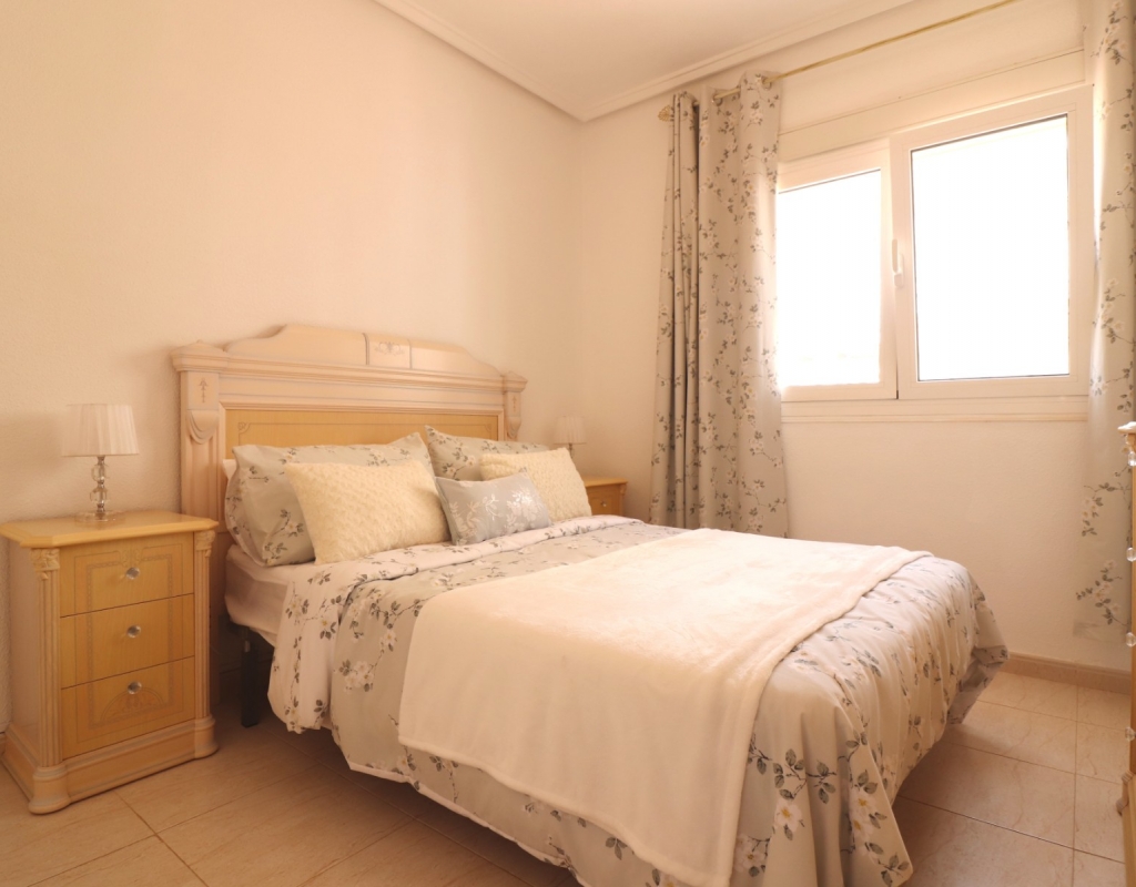 This South Facing, Three Bedroom, End Townhouse in Monte Azul is located on a well-established urbanisation, with a bar and restaurant on-site. Ideally positioned, it's only a 5-minute drive to the popular towns of Quesada and Benijofar, with both La Finca and La Marquesa golf courses reachable in 5 to 10 minutes. The beautiful beaches of the Costa Blanca South are approximately 15 minutes away by car. This beautifully presented property boasts a generous 136m² build and sits beside a charming gravelled and planted park area, adding a sense of openness and greenery. The covered front terrace leads into a bright and welcoming lounge, with stairs to the first floor and a wide archway through to the dining area. The separate fitted kitchen is well-equipped and includes a utility room and access out to the garden. Also on the ground floor is a shower room and a double bedroom — ideal for guests or ground-floor living. Upstairs, you’ll find two further double bedrooms, both with access to private terraces, and a spacious family bathroom featuring a corner bath and separate shower cubicle. Internal stairs provide access to the private rooftop solarium, offering plenty of space for relaxing and enjoying the sunshine. The garden has been thoughtfully designed for low maintenance with a mix of tiled patio, pebbled areas, and attractive planting. There's also off-road parking available. The property includes built-in wardrobes, air conditioning, and access to a lovely communal pool area surrounded by palm trees and landscaped garden area — perfect for enjoying the Mediterranean lifestyle. A fantastic home in a peaceful setting, with great access to amenities, golf, and the coast.
