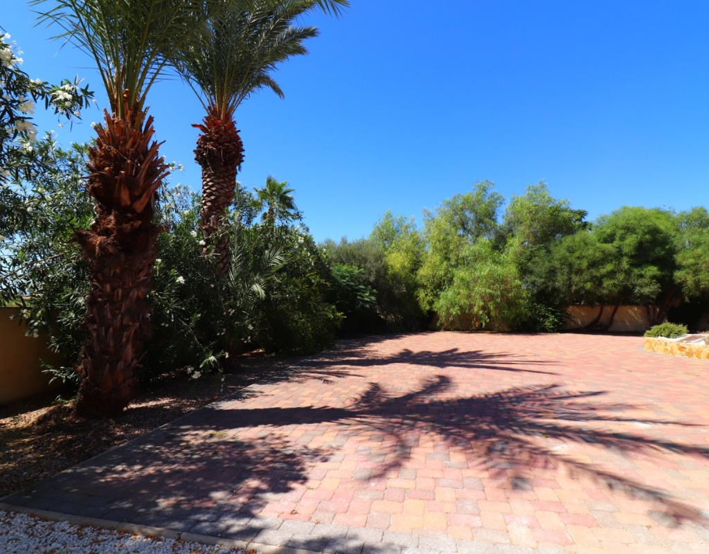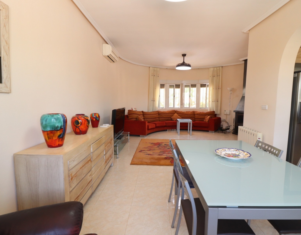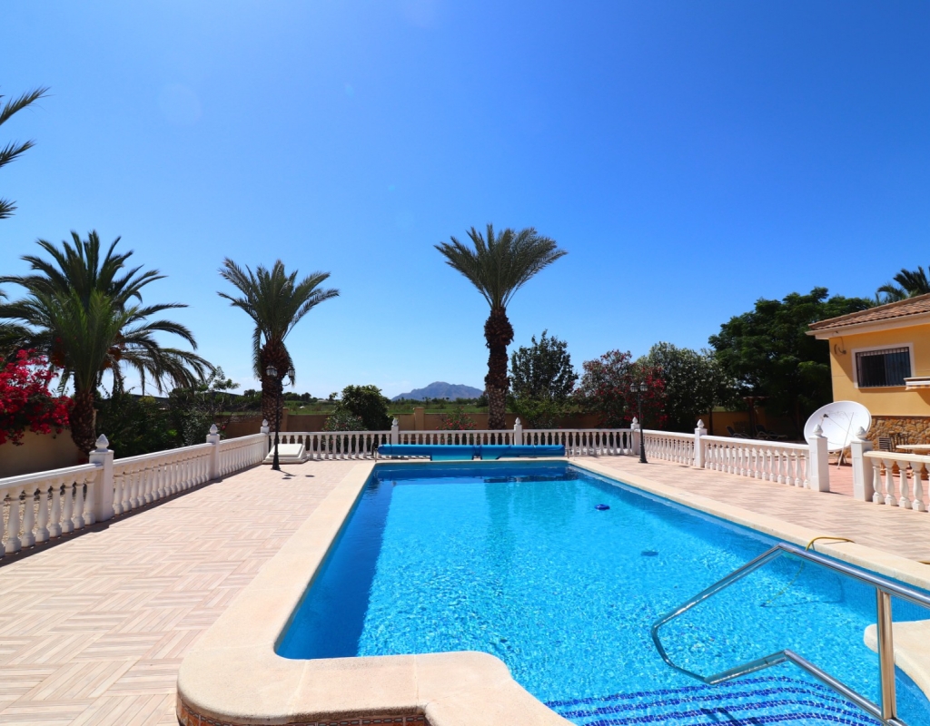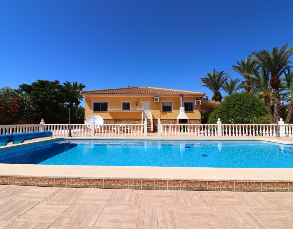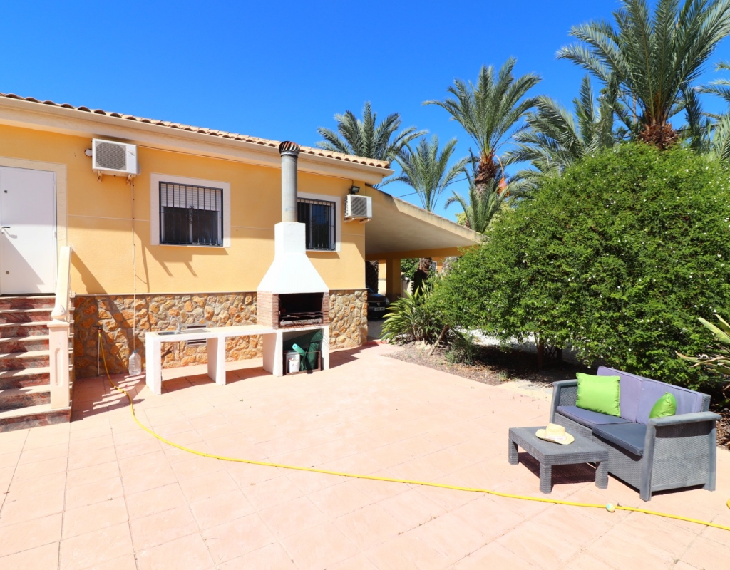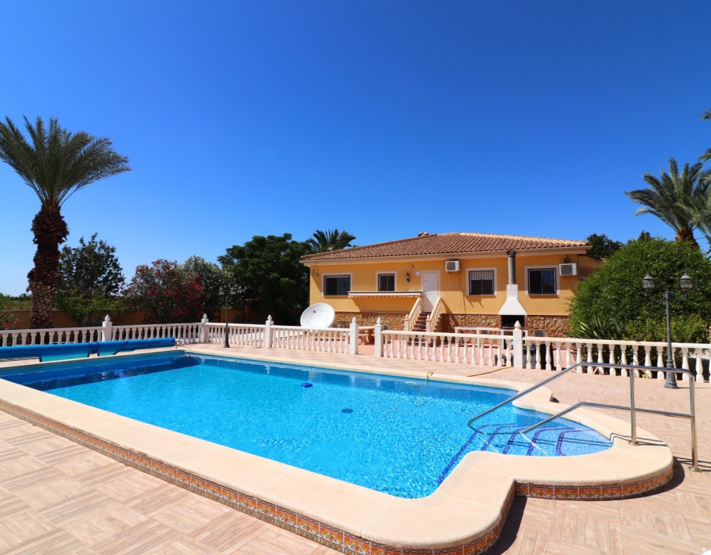 This South Facing, Three Bedroom, Country Villa in Catral is located in the beautiful open countryside, enjoying mountain views yet only a 5 minute drive to the amenities of Catral town. The golf courses of La Finca and La Marquesa can be reached in around 20 minutes, while the stunning beaches of the Costa Blanca are just 15 minutes away. Set on one level, the spacious 235m2 build sits on a private 2400m2 plot. The villa comprises a covered entrance terrace leading into the entrance hall, a curved lounge with log burner, dining area, and a wide archway through to a well-fitted kitchen with utility room and door leading outside. There are three double bedrooms, all with remote control ceiling fans, a family bathroom and an en suite shower room to the master. The landscaped walled garden is designed for easy maintenance and outdoor living, with off-road parking, a car port, central feature fountain, mature trees and palms, BBQ area, irrigation system and a 10 x 5 private pool to the rear, enjoying tranquil open views. Extras include air conditioning and a newly installed septic tank. An ideal family home or retreat in the countryside, yet close to the coast and amenities, on the Costa Blanca South.