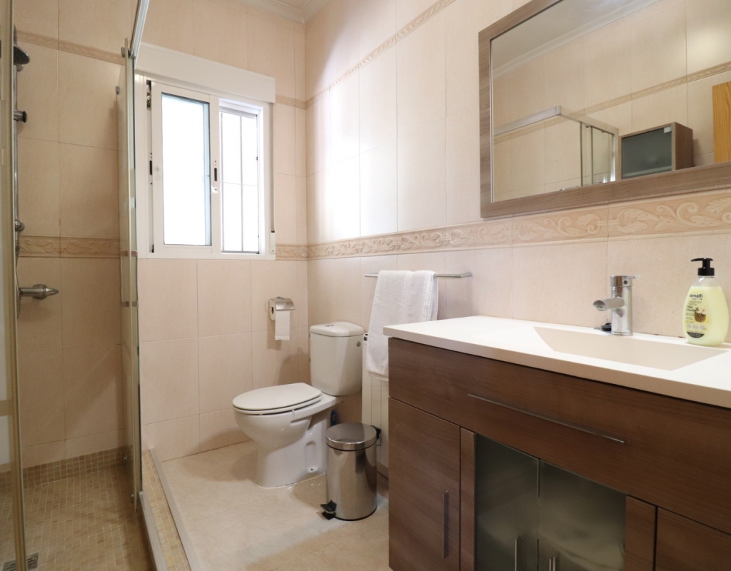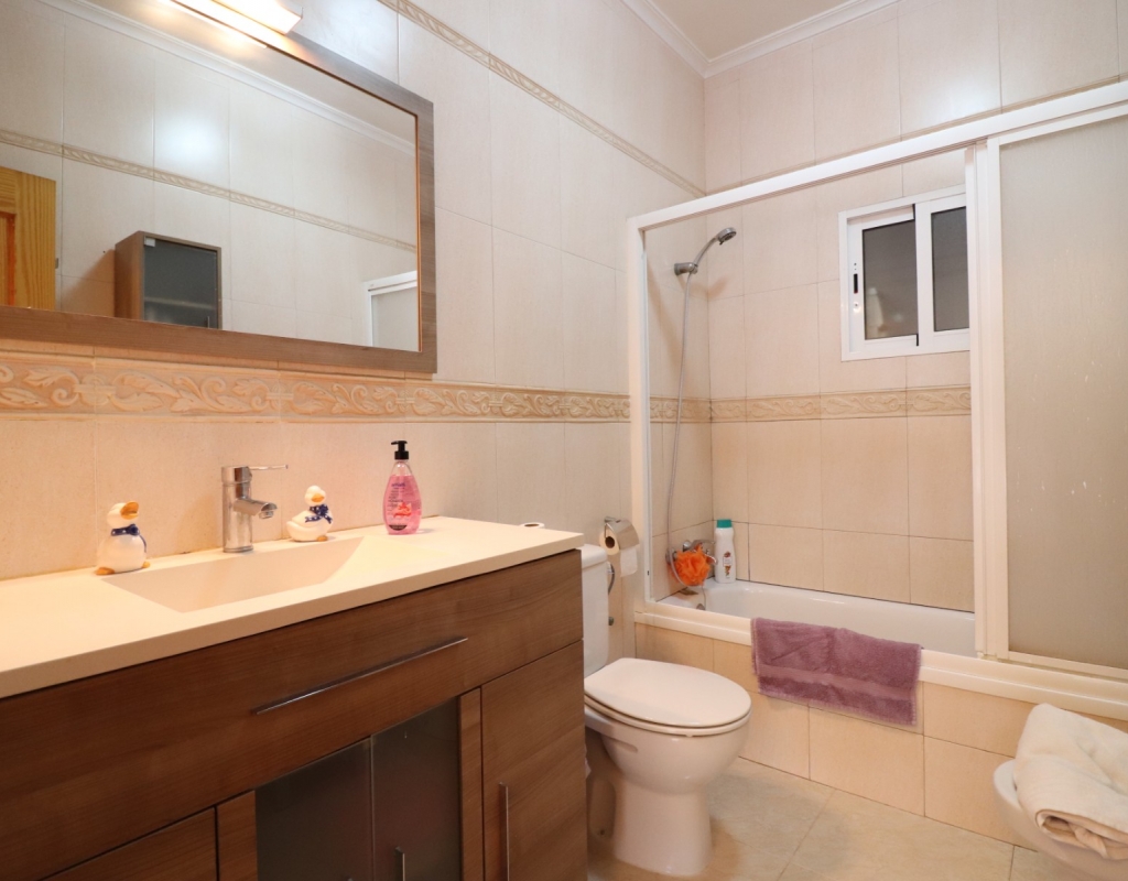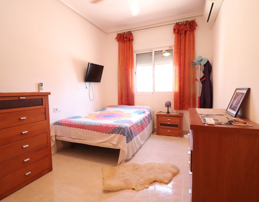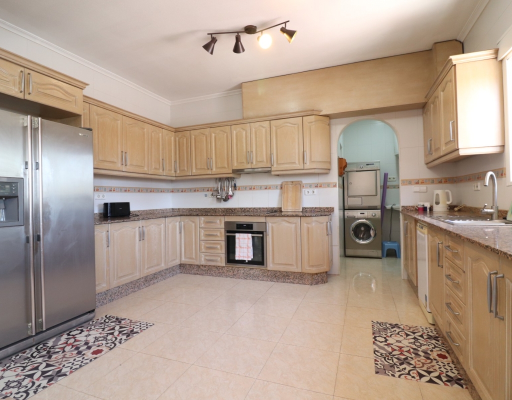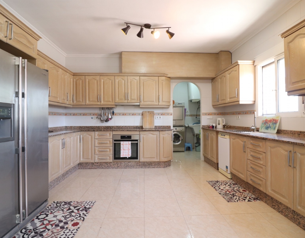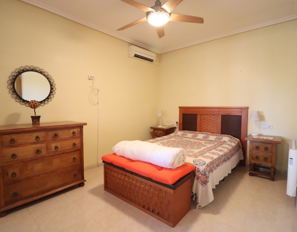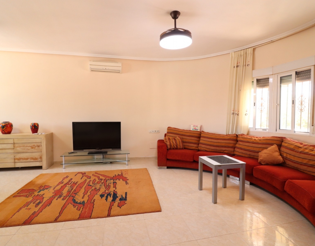 This South Facing, Three Bedroom, Country Villa in Catral is located in the beautiful open countryside, enjoying mountain views yet only a 5 minute drive to the amenities of Catral town. The golf courses of La Finca and La Marquesa can be reached in around 20 minutes, while the stunning beaches of the Costa Blanca are just 15 minutes away. Set on one level, the spacious 235m2 build sits on a private 2400m2 plot. The villa comprises a covered entrance terrace leading into the entrance hall, a curved lounge with log burner, dining area, and a wide archway through to a well-fitted kitchen with utility room and door leading outside. There are three double bedrooms, all with remote control ceiling fans, a family bathroom and an en suite shower room to the master. The landscaped walled garden is designed for easy maintenance and outdoor living, with off-road parking, a car port, central feature fountain, mature trees and palms, BBQ area, irrigation system and a 10 x 5 private pool to the rear, enjoying tranquil open views. Extras include air conditioning and a newly installed septic tank. An ideal family home or retreat in the countryside, yet close to the coast and amenities, on the Costa Blanca South.