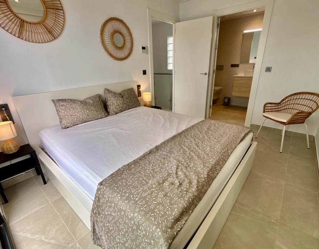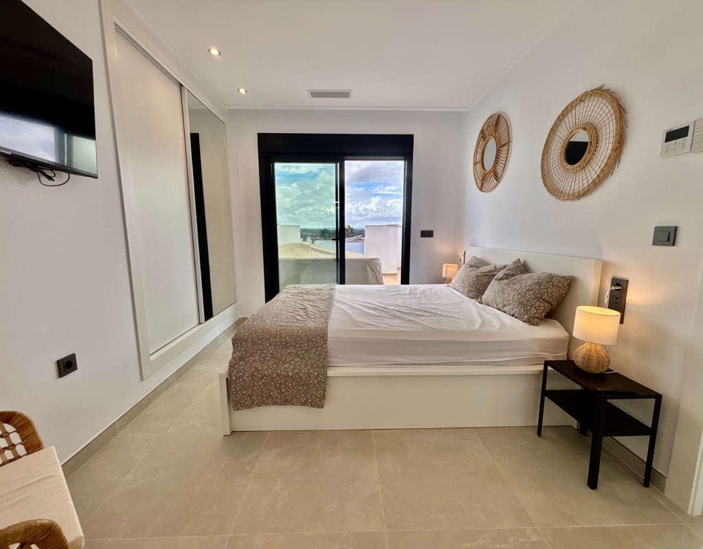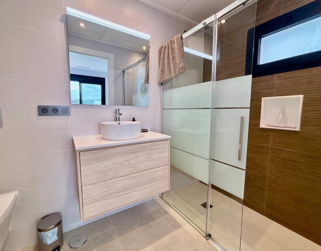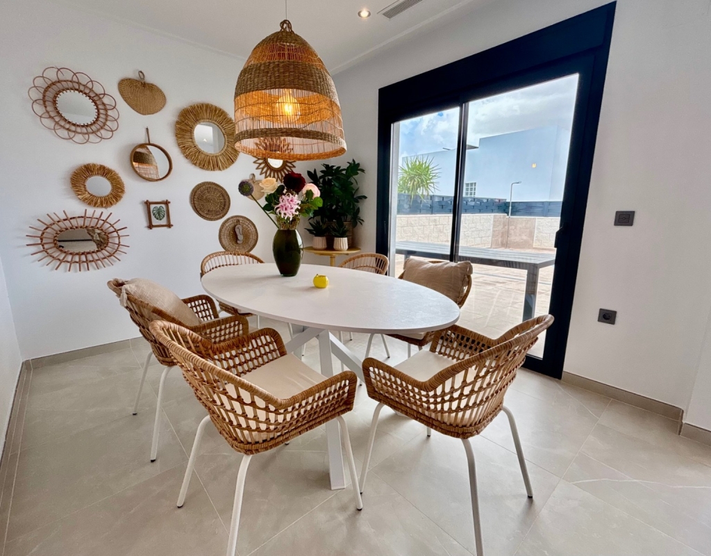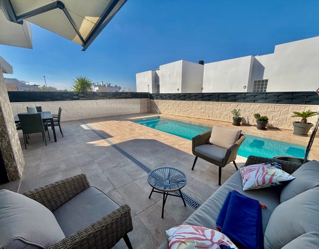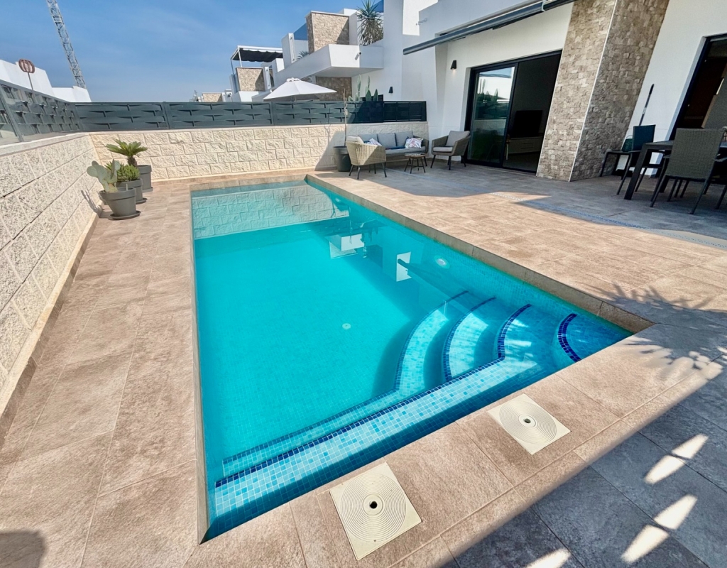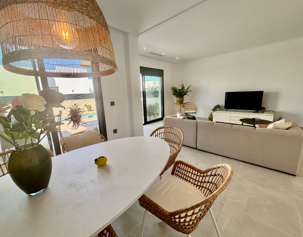 This Modern, East and West Facing, Two Bedroom Detached Villa in Benijofar is located within a highly sought-after area on the Costa Blanca South, just a 2 minute walk to many local amenities and facilities, with supermarkets close by and only a 12 minute drive to the nearest beautiful beaches. This stylish and contemporary property features a fully fitted open plan kitchen with a breakfast bar, a bright and light lounge/dining room with access out to the front tiled garden and terrace. The dining area on the ground floor can easily be converted back into the third bedroom as it originally was. There are two double bedrooms — one on the ground floor and the other on the first floor with an en-suite shower room & solarium — both benefitting from fitted wardrobes. The property also includes two modern, stylish walk-in shower rooms, offering comfort and practicality throughout. Air conditioning is installed in the lounge and all bedrooms, ensuring year-round comfort. The private solarium boasts an outdoor kitchen, ideal for entertaining, while enjoying open views across the surrounding area, countryside, mountains, and those spectacular sunsets. Outside, the villa offers a private swimming pool with a built-in seating area, off road parking, and a useful storeroom in the front garden. This beautiful modern villa perfectly combines elegant design with everyday convenience, providing a superb opportunity for full-time living or as a luxurious holiday home on the Costa Blanca South.