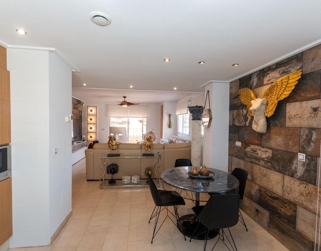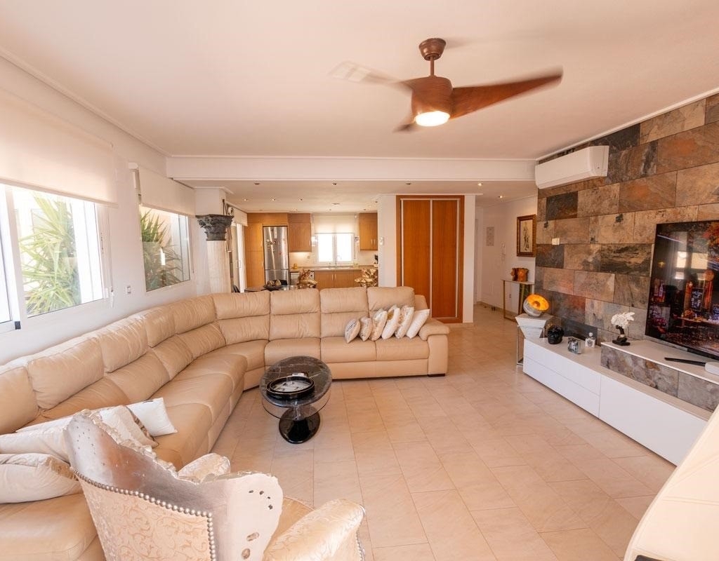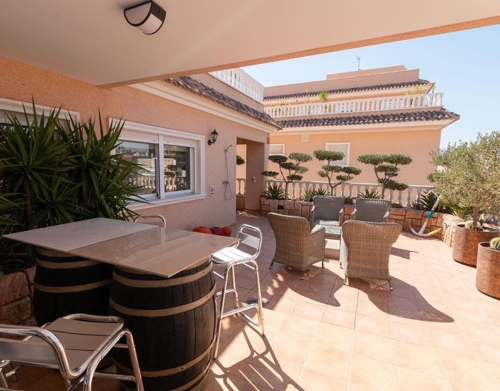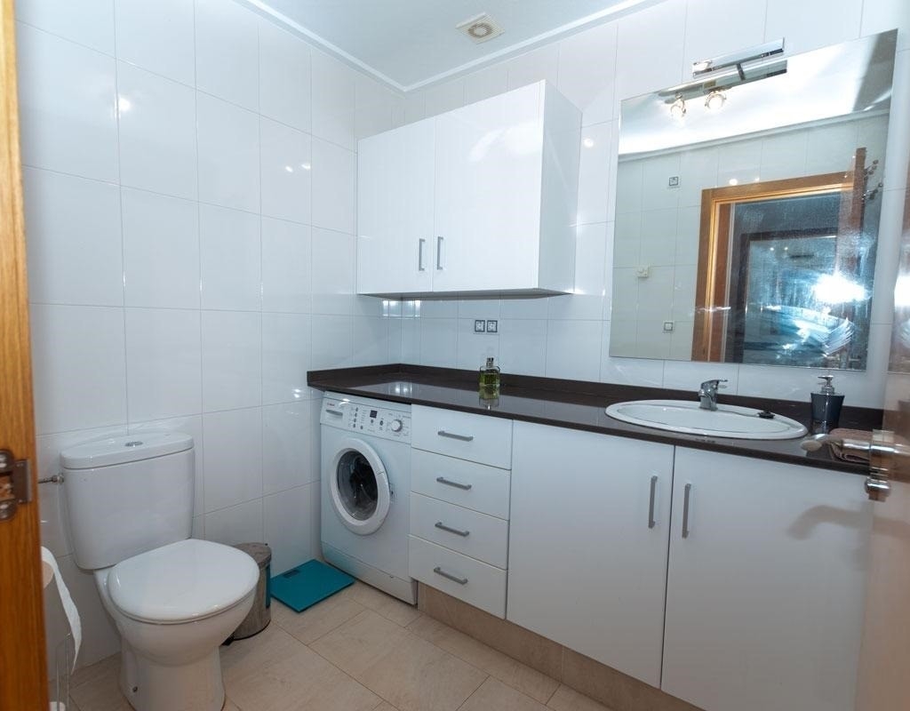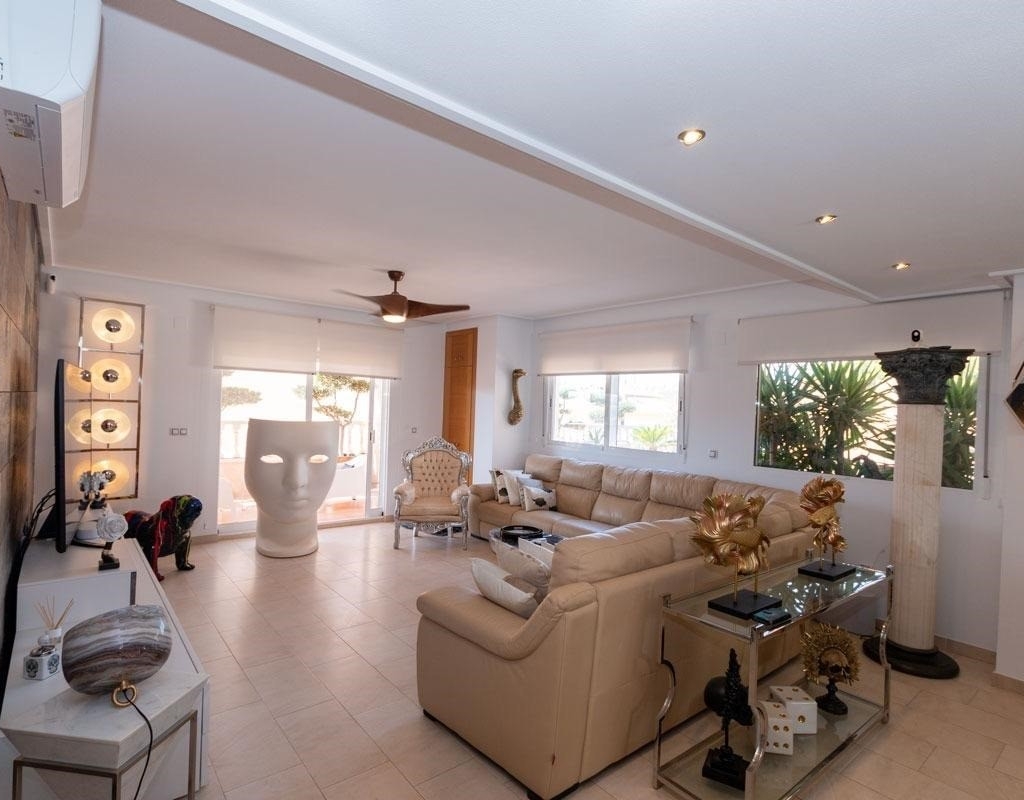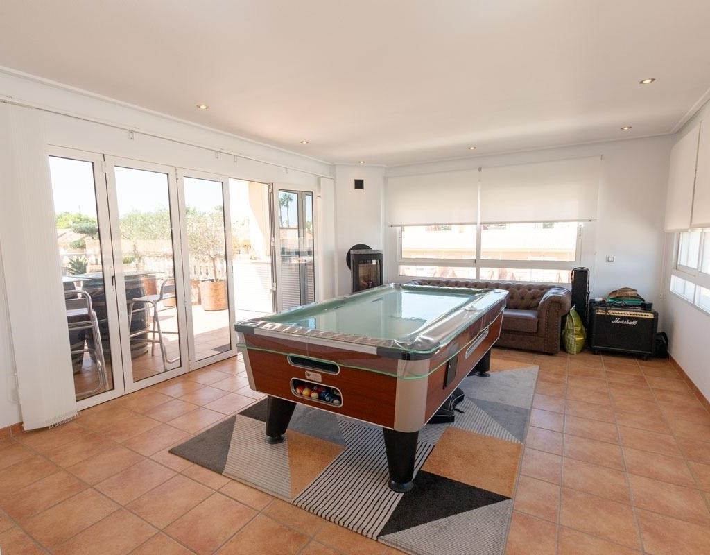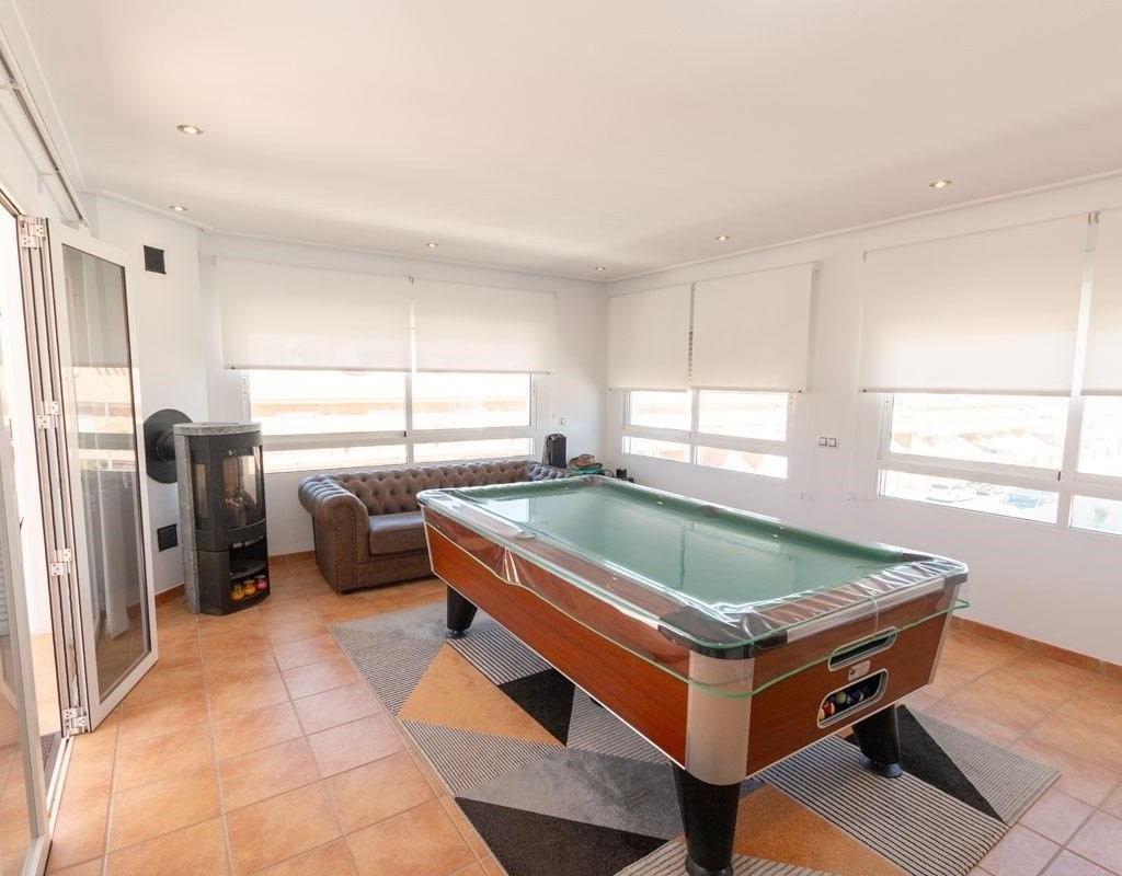 This South-East Facing, Three Bedroom, 2nd Floor Apartment in Los Dolses, Villamartin, is located in a desirable area of the Orihuela Costa, just a 4 minute drive to a great selection of supermarkets, bars, and restaurants and less than a 10 minute drive to the beautiful sandy beaches of the Costa Blanca South. This contemporary apartment features an open plan, fully fitted kitchen and a spacious lounge/dining area with air conditioning, leading out through patio doors to a huge corner terrace — ideal for relaxing or entertaining. There are three double bedrooms, all with air conditioning and fitted wardrobes, including a master bedroom with en suite shower room. A second contemporary shower room serves the rest of the property. An additional lounge area, complete with a pellet burner and pool table, offers a wonderful extra space for leisure and socialising, and also provides access to the large terrace. The terrace itself includes an outdoor sink and a handy storeroom, perfect for practical outdoor living. Residents benefit from excellent communal facilities, including two swimming pools (one heated), a sauna, gym and a children’s play park. The apartment also boasts underfloor heating throughout, a basement car parking space and access to beautifully maintained communal areas. A truly impressive property offering modern comfort, style, and convenience in a highly sought-after location on the Costa Blanca South.