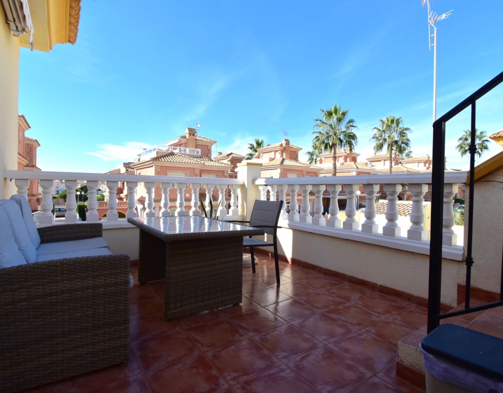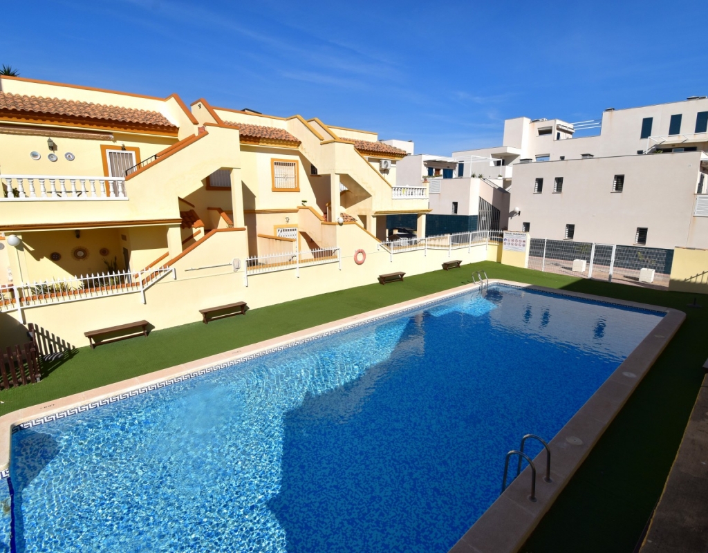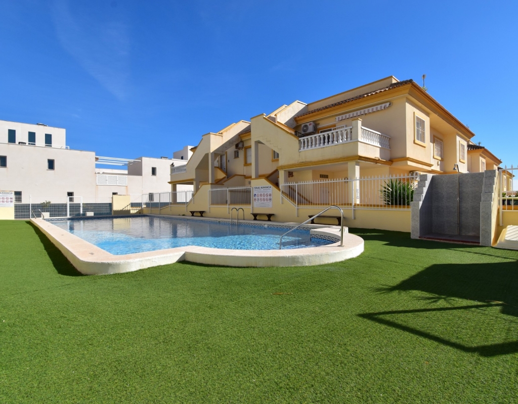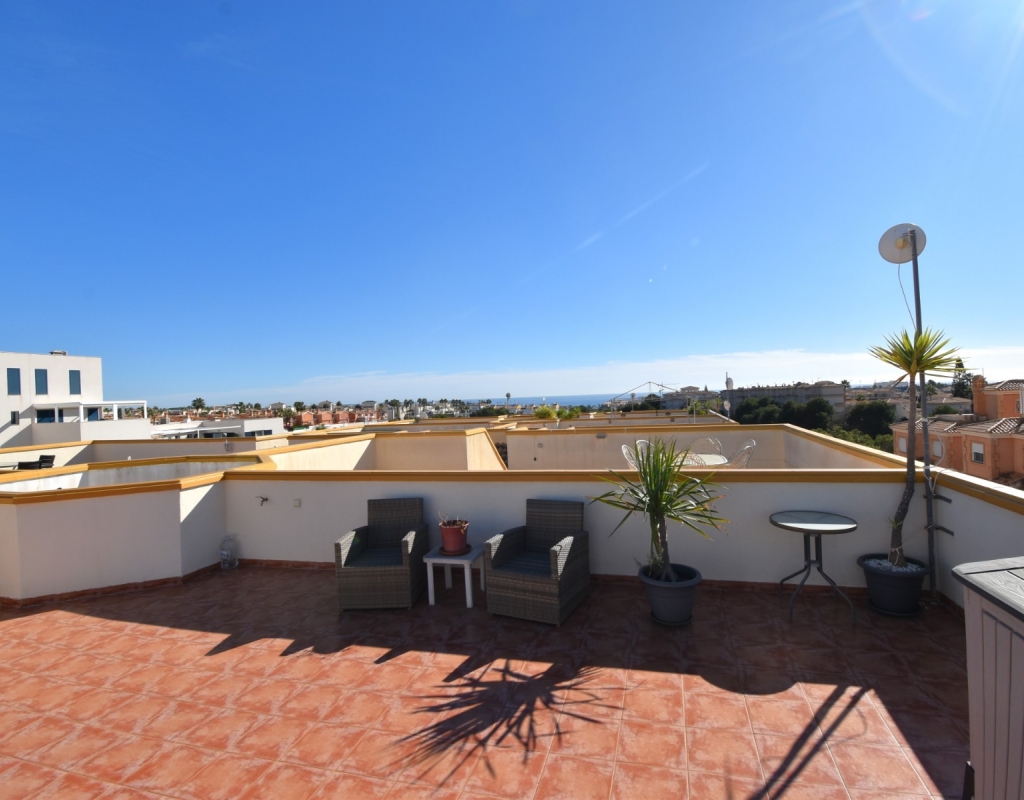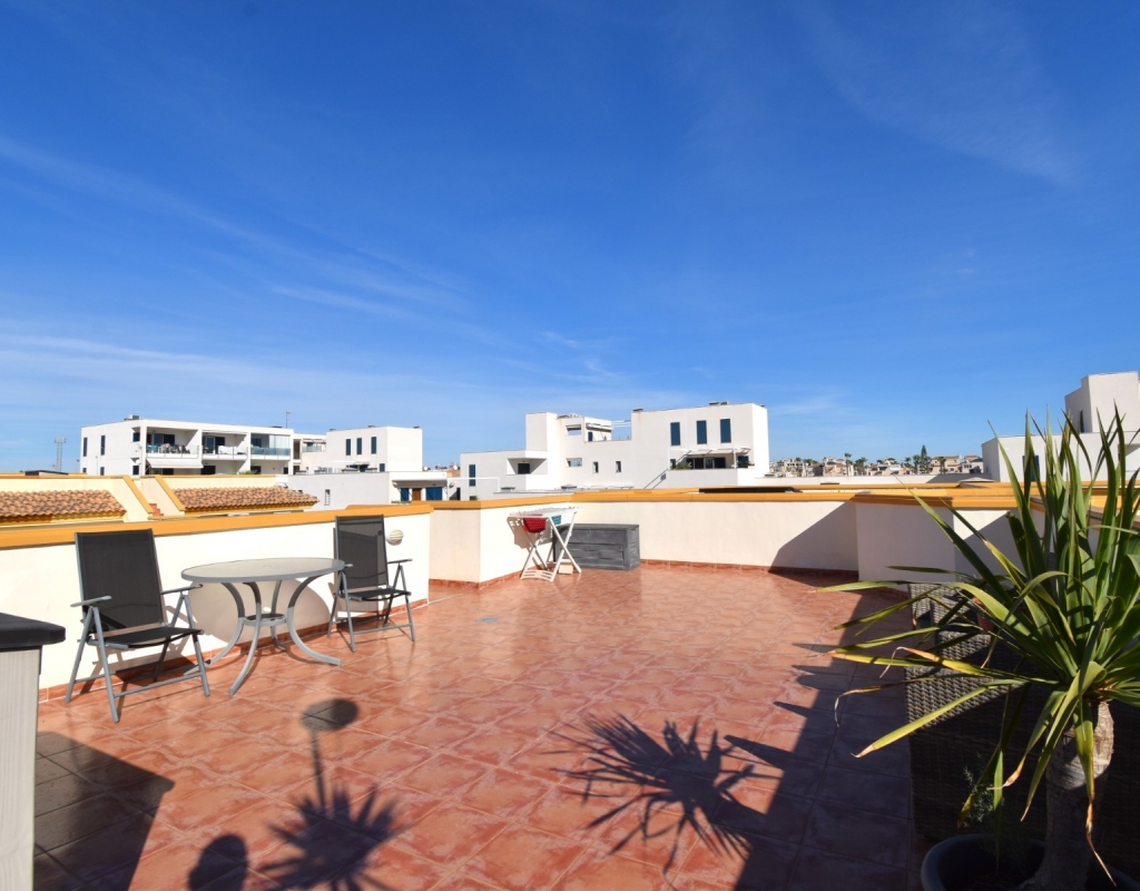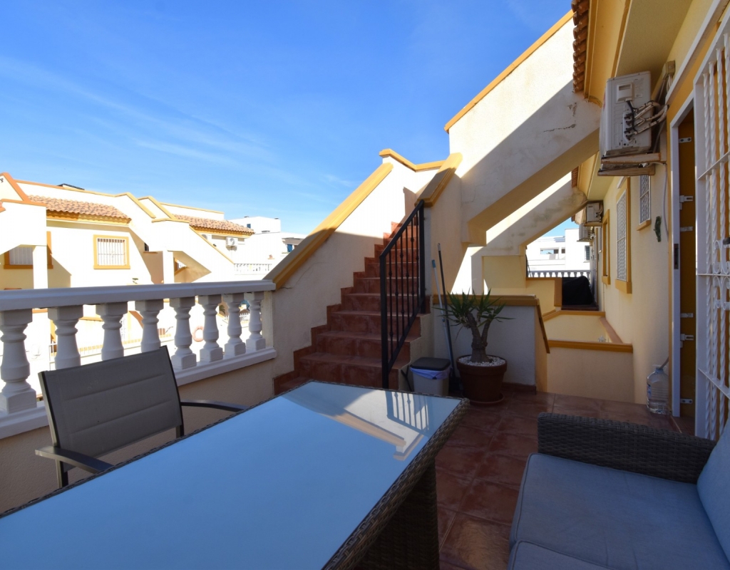 This South Facing, Two Bedroom, Top Floor Apartment in Playa Flamenca, is located in the heart of Orihuela Costa, just a 5 minute walk to café bars and restaurants, 15 minutes to La Zenia Boulevard shopping centre, and only a 5 minute drive to the beautiful beaches of the area. A selection of golf courses can be reached within 5–10 minutes, and there is excellent access to both the AP-7 and N-332 coastal road — an ideal position on the Costa Blanca South. The property benefits from a spacious entrance terrace leading into the bright living area, complete with an American-style, well-fitted kitchen. There are two double bedrooms, both with built-in wardrobes and air conditioning, along with a modern family shower room featuring a walk-in shower. An external staircase leads to the private solarium, which offers a view towards the sea — perfect for relaxing or entertaining. Although a top-floor apartment, it uniquely includes off-road parking, a garden area and a store room on the ground level. The communal pool, surrounded by artificial grass, provides a great space for enjoying the sunshine. A superb “lock up and leave” property, very easy to maintain and ideally located on the Costa Blanca South.