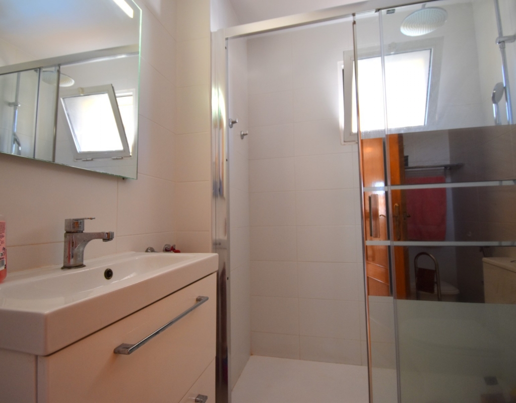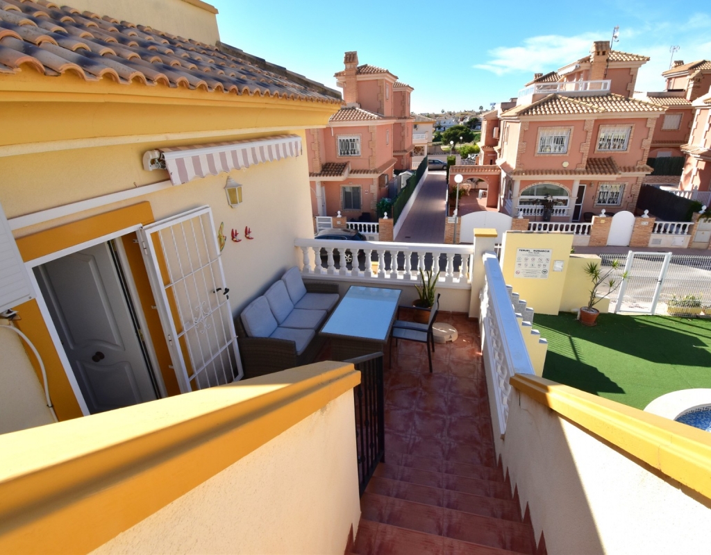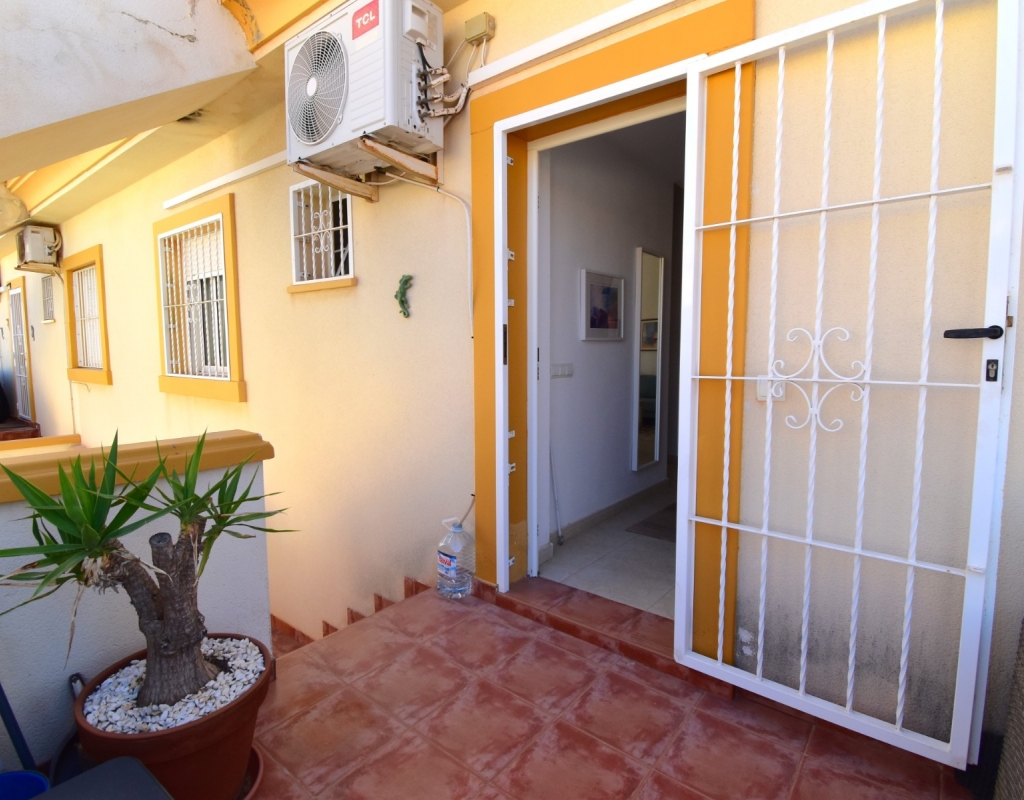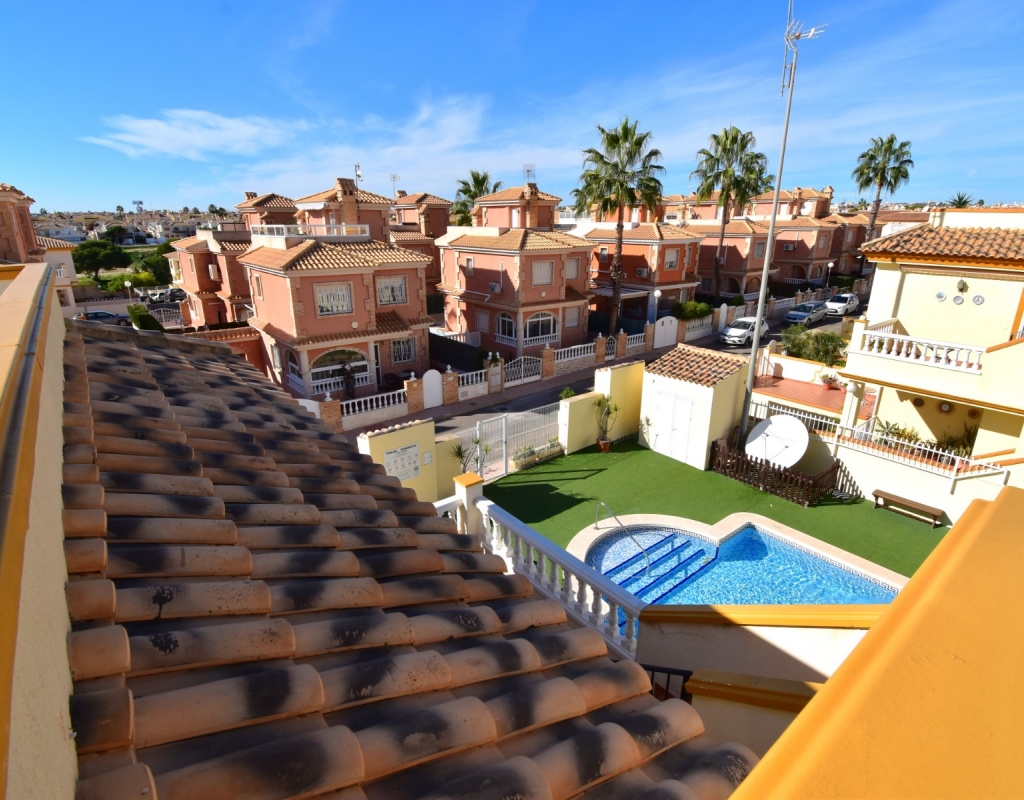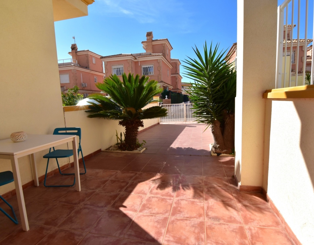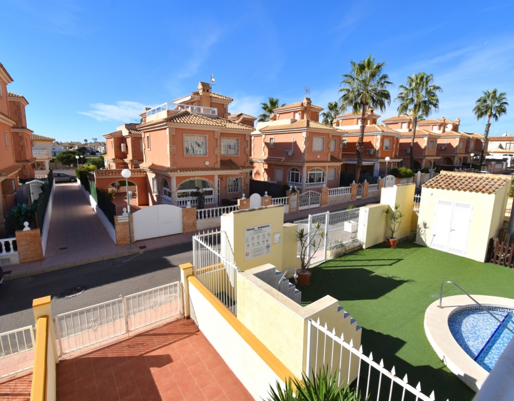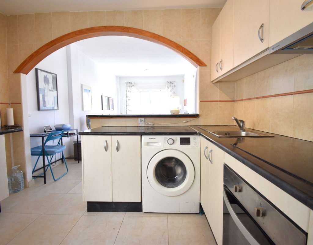 This South Facing, Two Bedroom, Top Floor Apartment in Playa Flamenca, is located in the heart of Orihuela Costa, just a 5 minute walk to café bars and restaurants, 15 minutes to La Zenia Boulevard shopping centre, and only a 5 minute drive to the beautiful beaches of the area. A selection of golf courses can be reached within 5–10 minutes, and there is excellent access to both the AP-7 and N-332 coastal road — an ideal position on the Costa Blanca South. The property benefits from a spacious entrance terrace leading into the bright living area, complete with an American-style, well-fitted kitchen. There are two double bedrooms, both with built-in wardrobes and air conditioning, along with a modern family shower room featuring a walk-in shower. An external staircase leads to the private solarium, which offers a view towards the sea — perfect for relaxing or entertaining. Although a top-floor apartment, it uniquely includes off-road parking, a garden area and a store room on the ground level. The communal pool, surrounded by artificial grass, provides a great space for enjoying the sunshine. A superb “lock up and leave” property, very easy to maintain and ideally located on the Costa Blanca South.