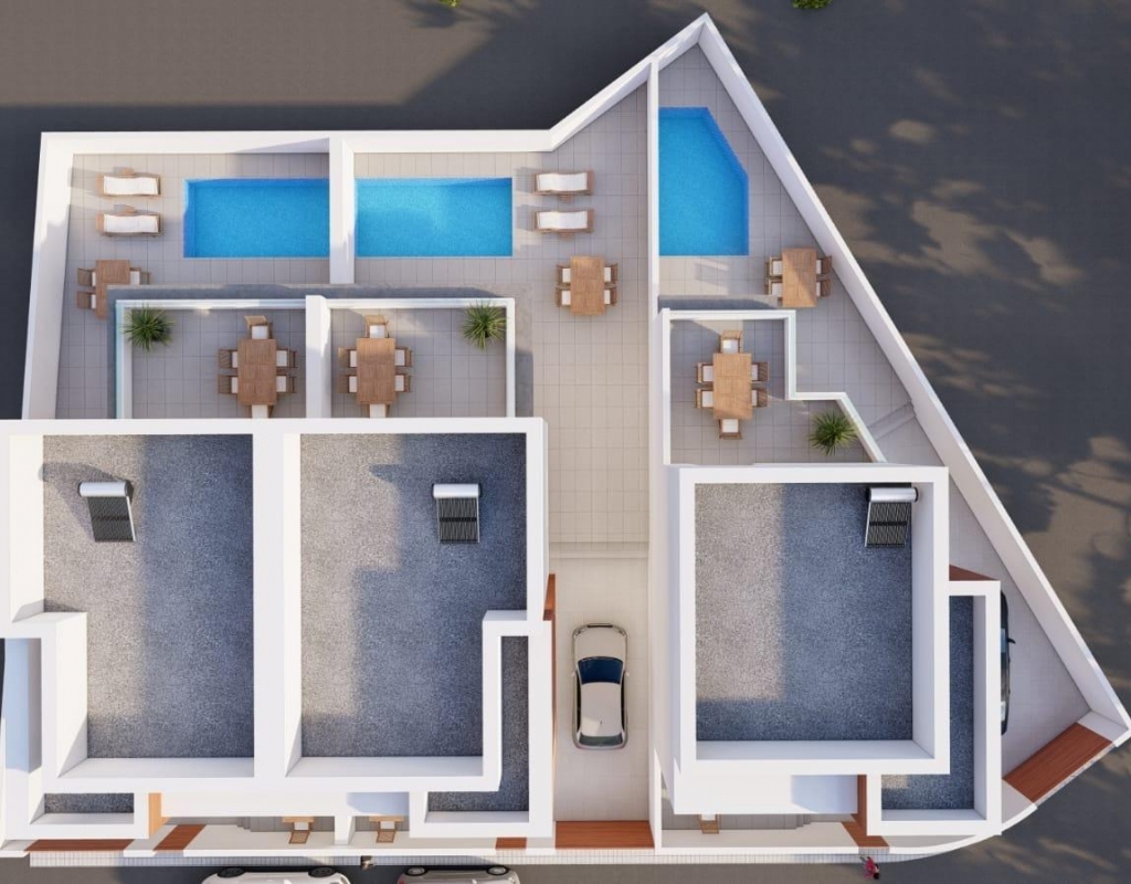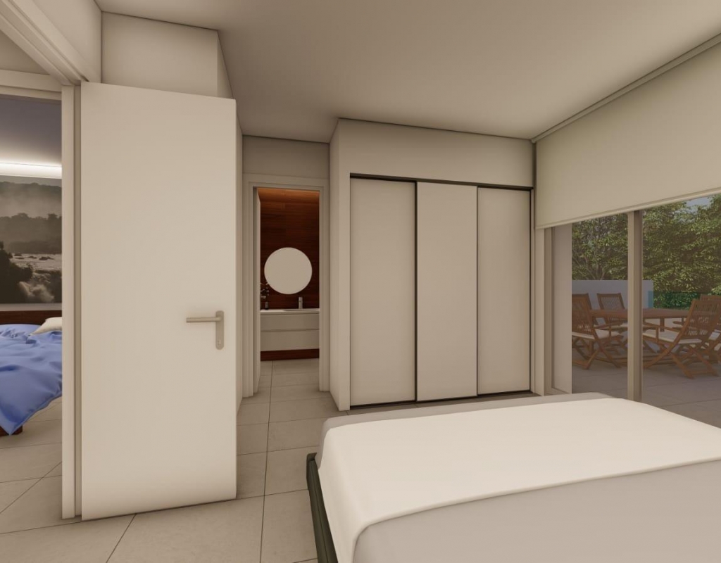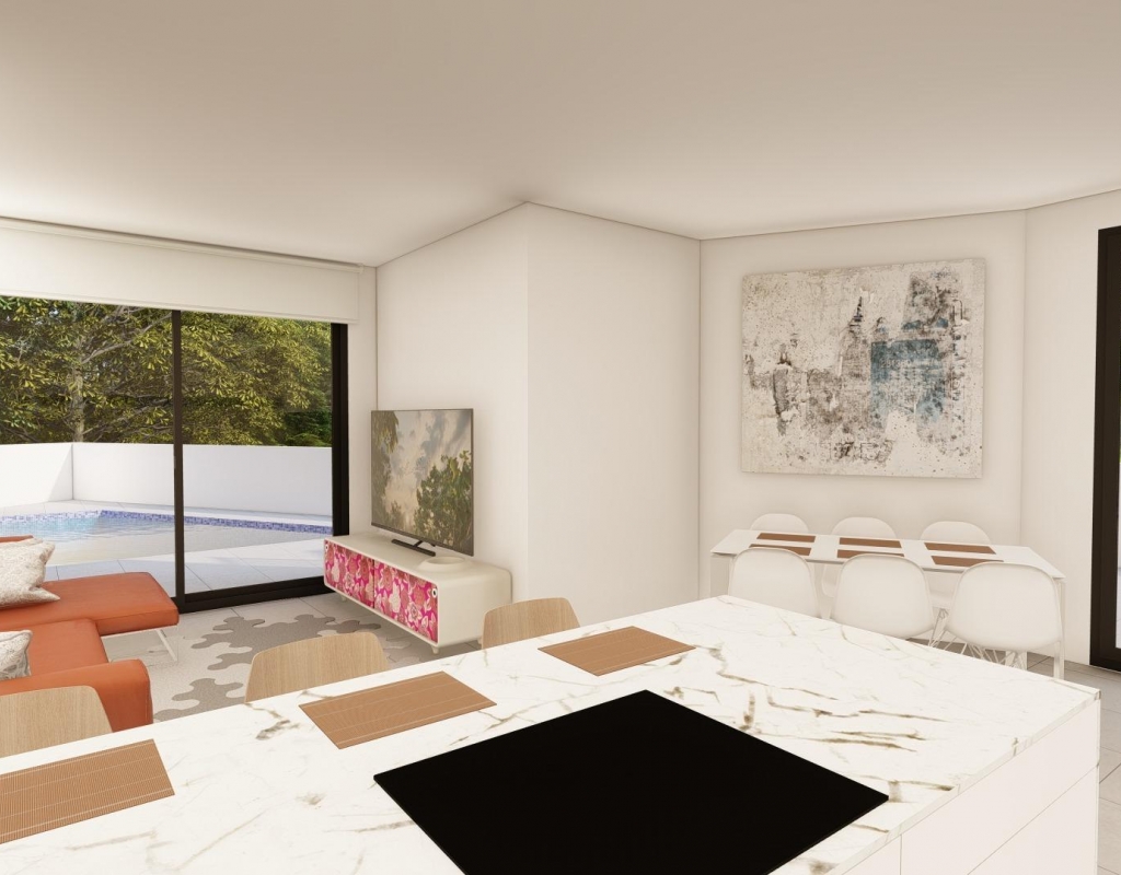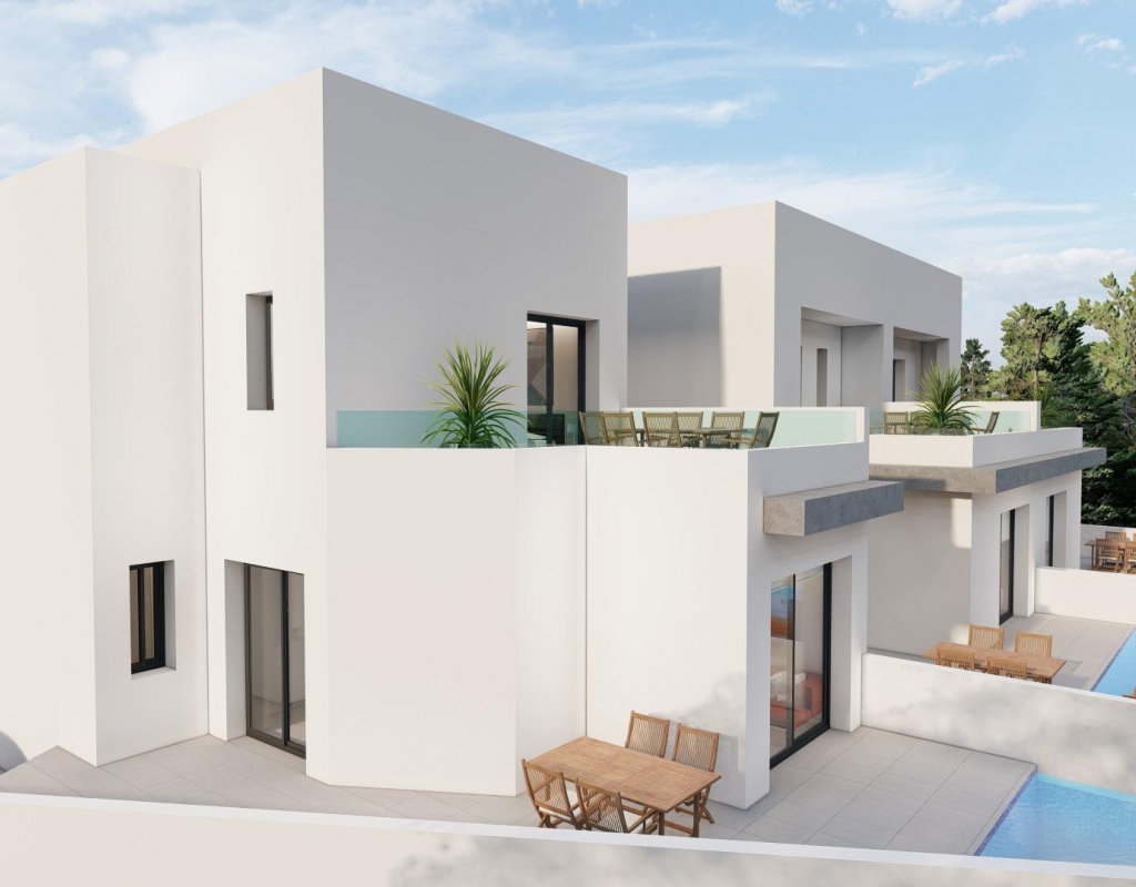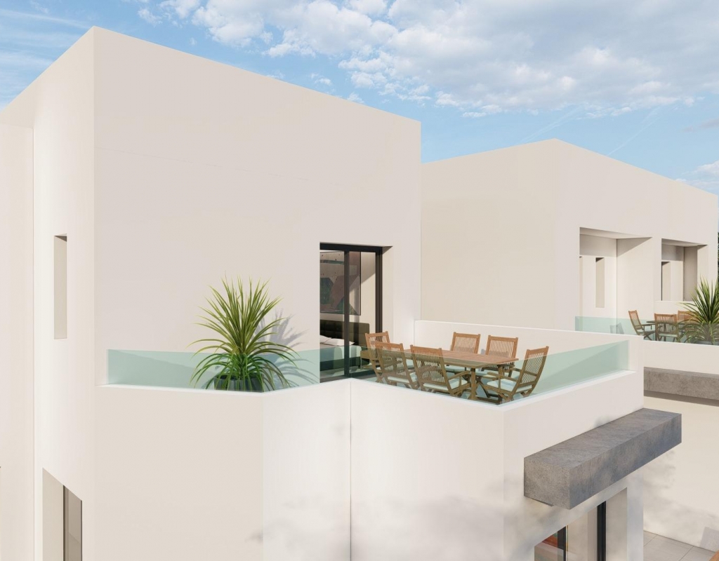 The exteriors of these homes in Daya Nueva are designed to enjoy the Mediterranean climate. Each property features a private pool, perfect for cooling off during the warm summer days. Additionally, the terraces offer an ideal space for outdoor relaxation, hosting dinners, or simply enjoying the surrounding views. The solarium is another attraction, providing an additional place for sunbathing or enjoying starry nights. The exterior architecture combines modernity and functionality, creating a harmonious environment with the natural surroundings.