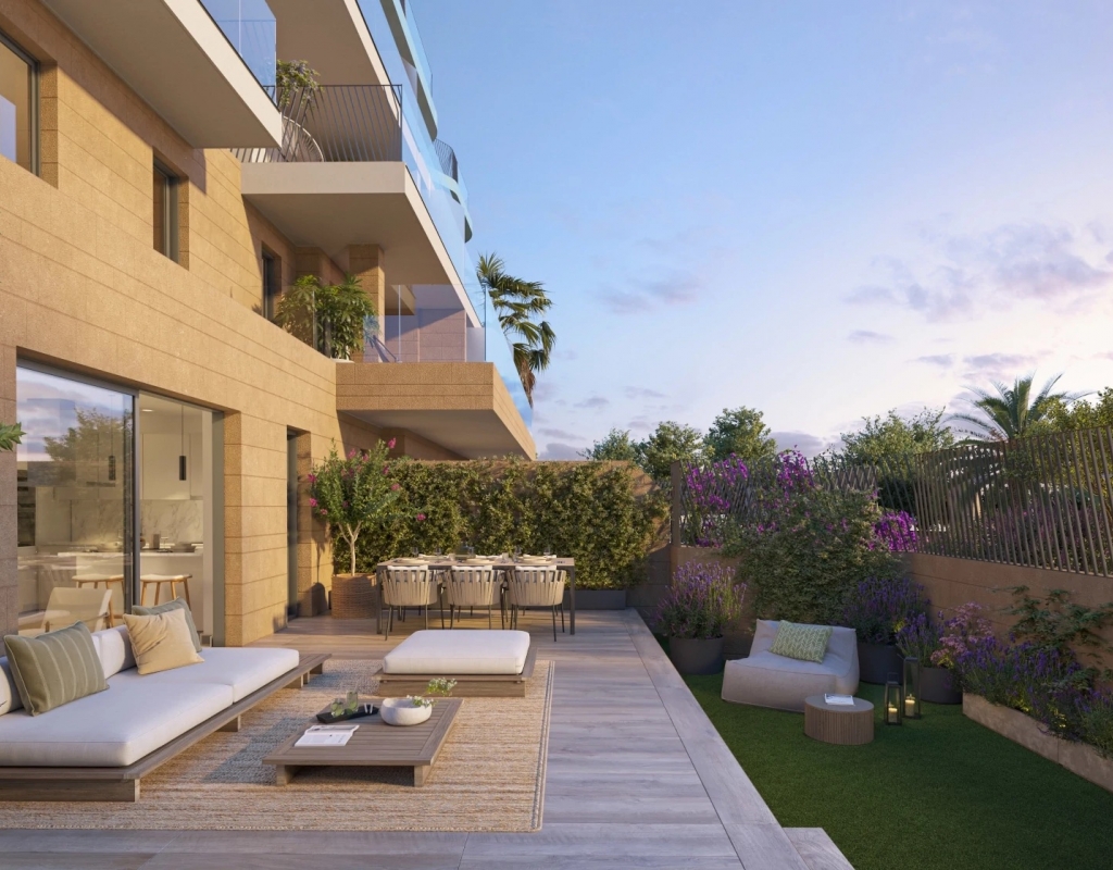 The outdoor spaces of these homes are designed to maximize enjoyment of the Mediterranean climate. Each property features private terraces, perfect for relaxing outdoors and enjoying sea views. Additionally, some types include a solarium, offering extra space for outdoor leisure. The ground floors have private gardens, providing a personal green space for each resident. The proximity to the sea, just 200 meters, allows for beach enjoyment at any time of the day. Access to a private garage ensures convenience and security for vehicles, including the option for electric car charging.