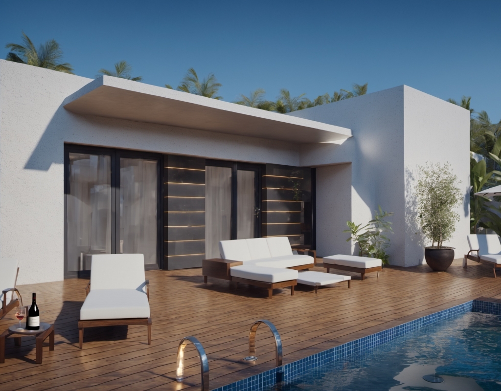 The exterior of this detached villa in Benijófar is designed to make the most of the Mediterranean climate. The property boasts a private garden, perfect for those who enjoy outdoor activities or simply want a green space to relax. Additionally, the terrace offers an ideal spot for al fresco dining or unwinding at the end of the day. One of the main attractions of this property is its private pool, providing an oasis of freshness and fun during the hot summer months. This outdoor space is designed to offer maximum comfort and privacy, allowing residents to enjoy their home in a natural and tranquil environment.