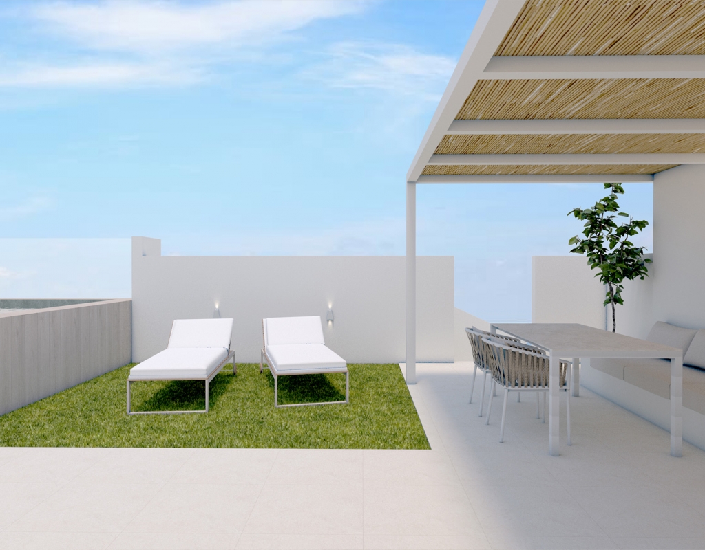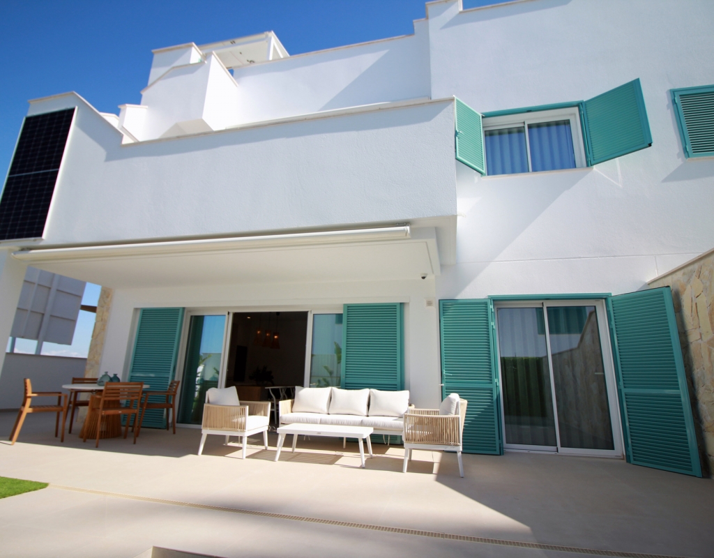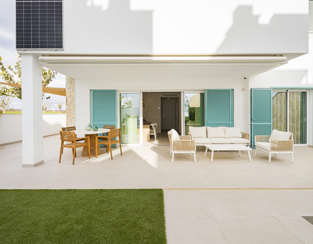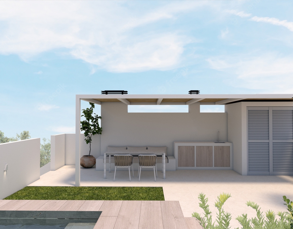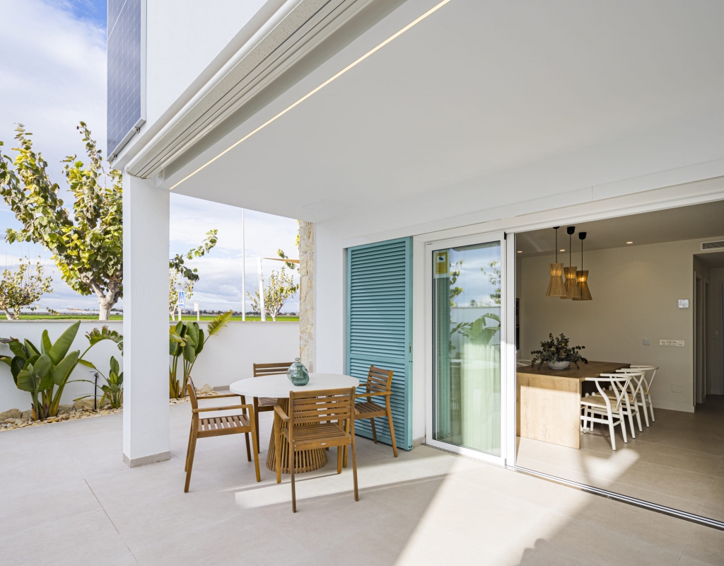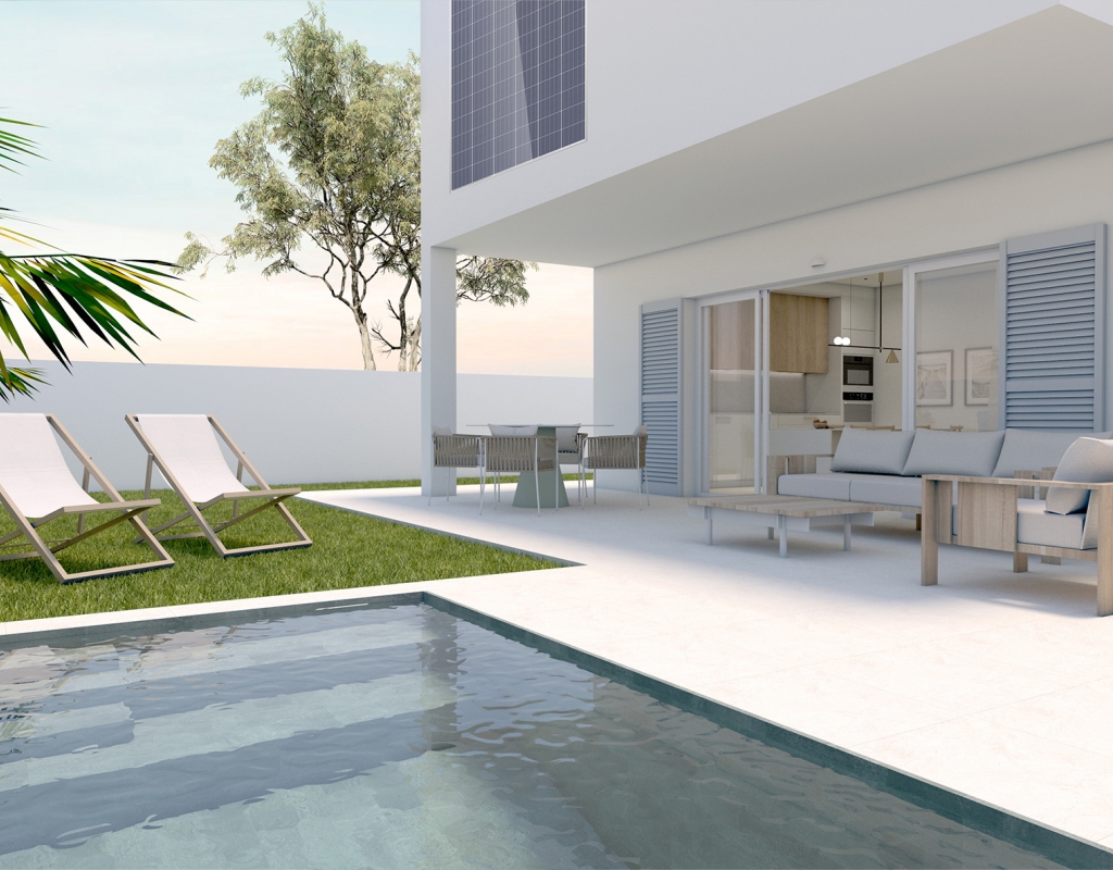 The outdoor spaces of these homes are designed to offer relaxation and enjoyment in the open air. Each property features a private garden, ideal for enjoying the Mediterranean climate. The terrace is perfect for outdoor dining or simply relaxing with a good book. Additionally, residents can enjoy a solarium, an additional space offering unobstructed views and the opportunity to sunbathe in total privacy. For those looking to cool off during hot summer days, each bungalow has a private pool, providing a personal oasis of tranquility.