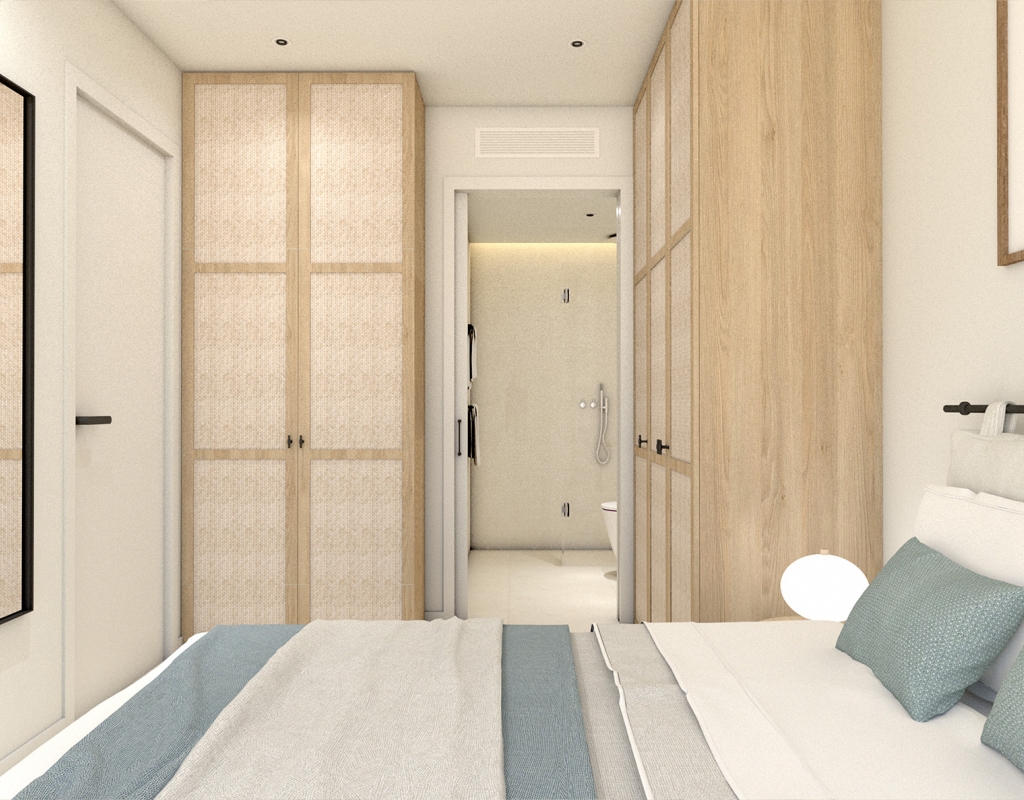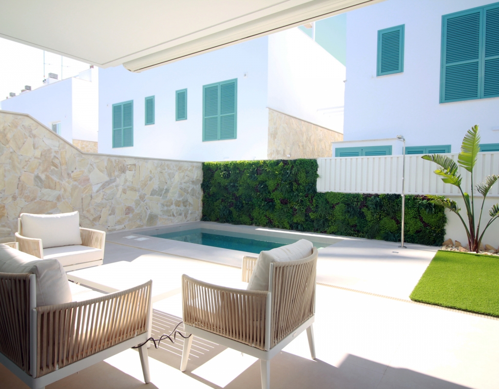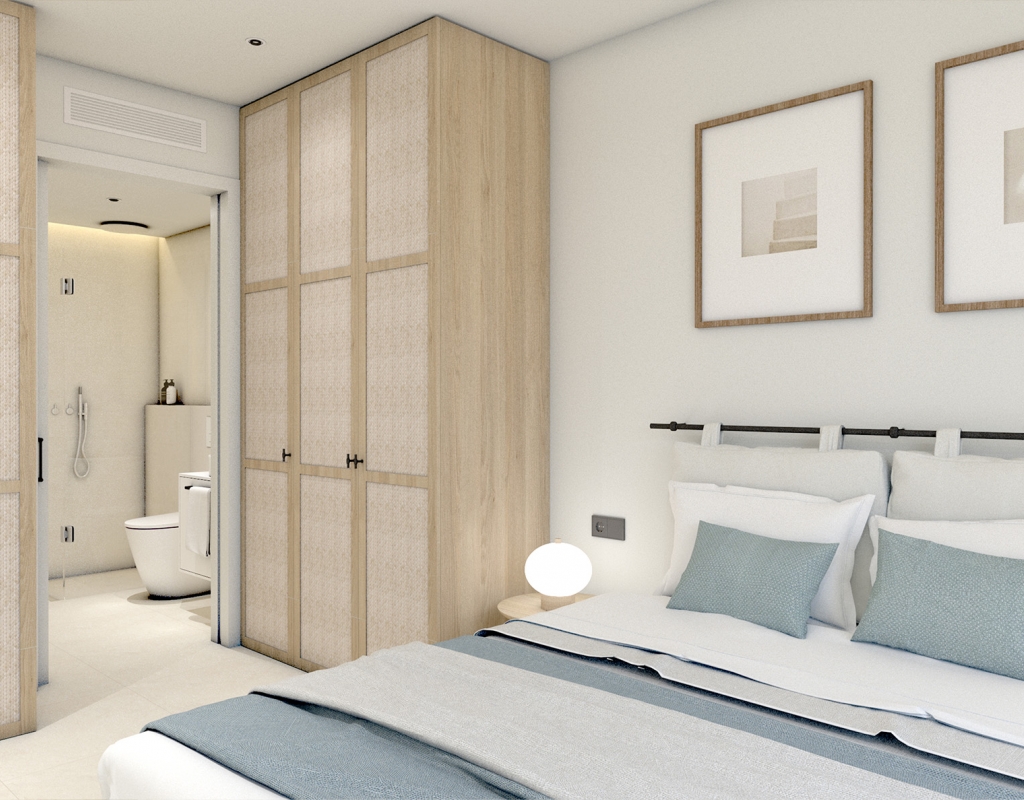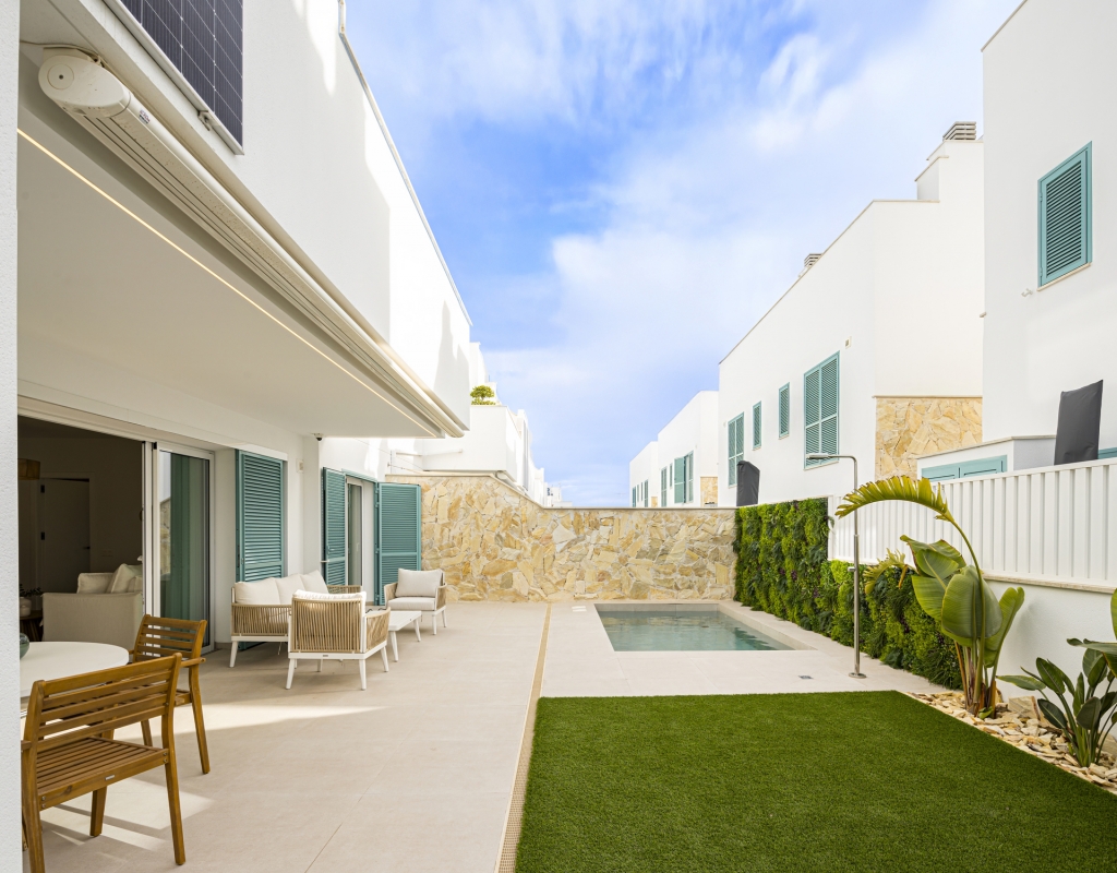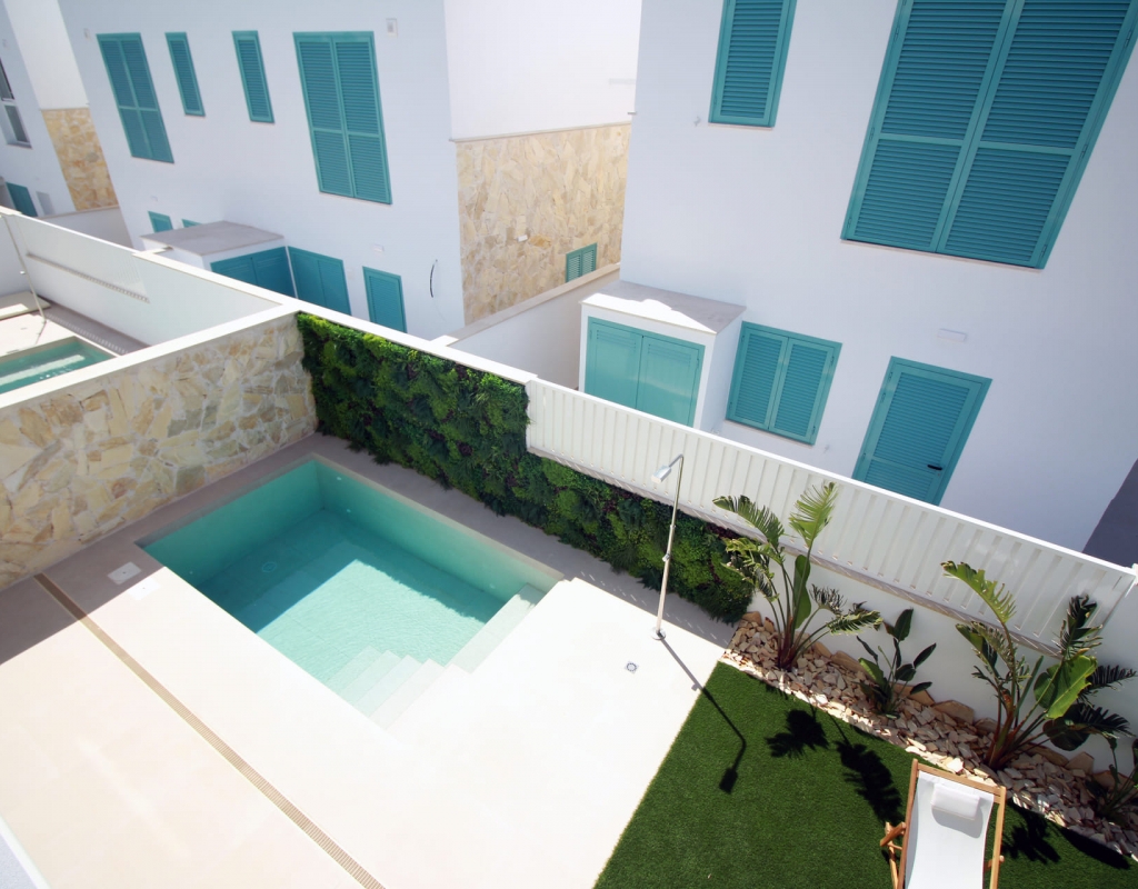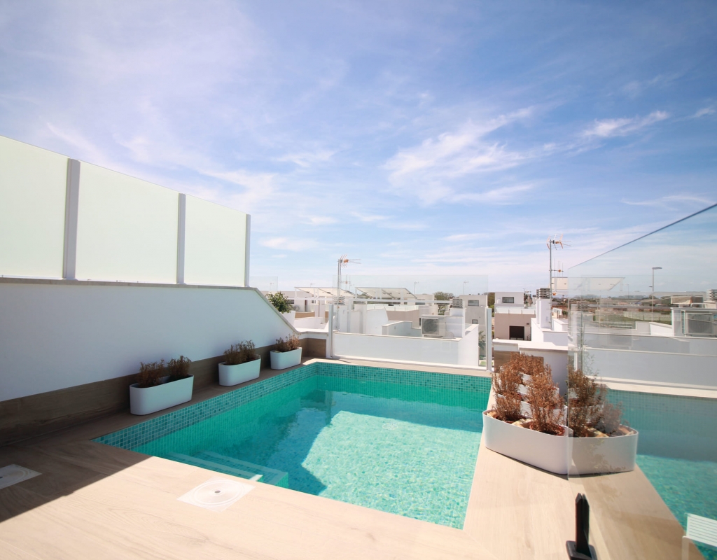 The outdoor spaces of these homes are designed to offer relaxation and enjoyment in the open air. Each property features a private garden, ideal for enjoying the Mediterranean climate. The terrace is perfect for outdoor dining or simply relaxing with a good book. Additionally, residents can enjoy a solarium, an additional space offering unobstructed views and the opportunity to sunbathe in total privacy. For those looking to cool off during hot summer days, each bungalow has a private pool, providing a personal oasis of tranquility.