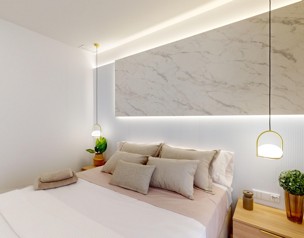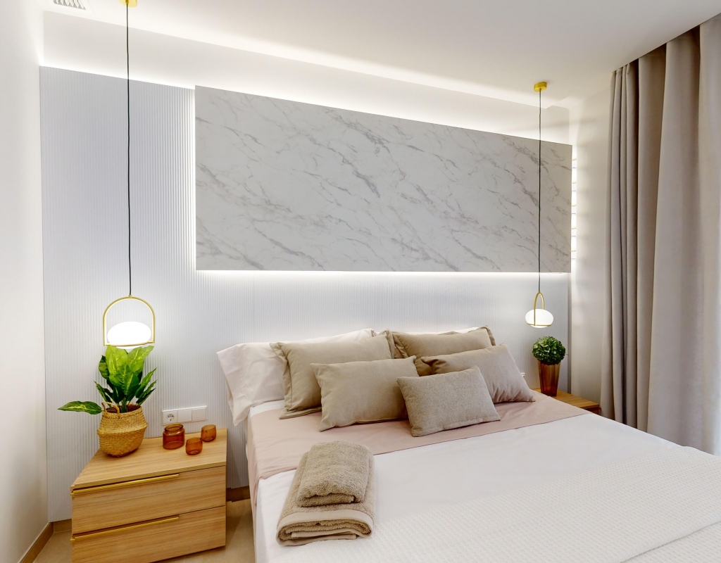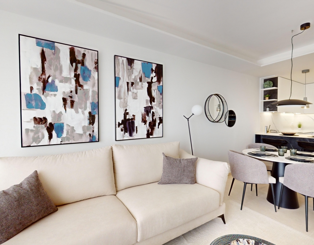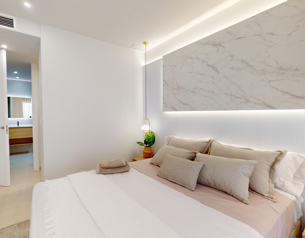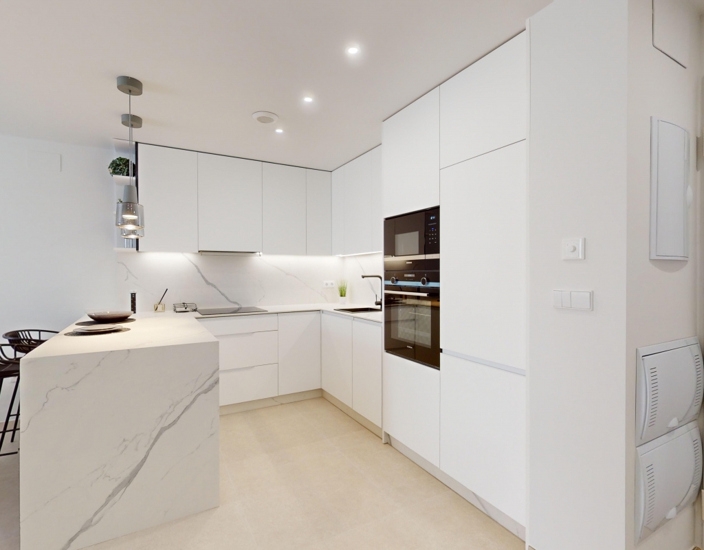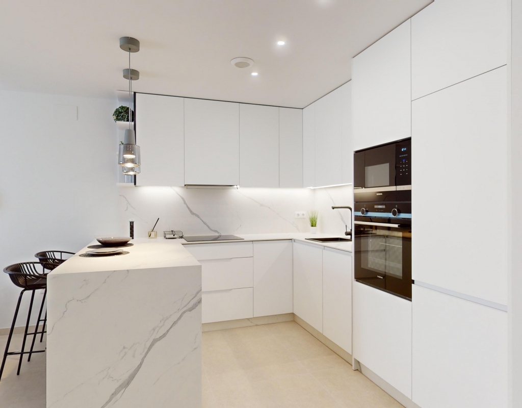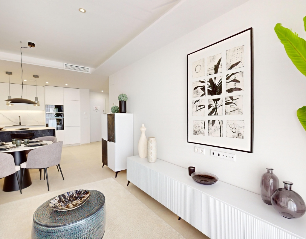The interiors of these homes in Cabo Roig are designed to offer maximum comfort and style. Ceramic floors provide a modern touch and are easy to maintain, while the included furniture ensures each space is ready to be lived in. The layout includes 2 or 3 bedrooms and 2 bathrooms, providing adequate space for families or couples. The kitchen is equipped with modern appliances, and the air conditioning system ensures a pleasant environment year-round. Additionally, each property features a video intercom, adding an extra level of security and convenience.