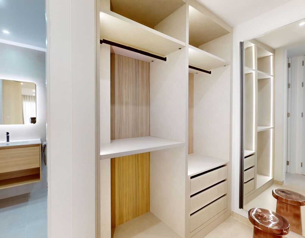 The outdoor areas of these properties in Cabo Roig are designed to maximize enjoyment of the Mediterranean climate. Each home features a terrace, perfect for outdoor relaxation, and some types include a private solarium. The presence of a pergola adds a touch of elegance and functionality, providing shade and style. Additionally, there is an option for electric vehicle charging, a feature that reflects a commitment to sustainability and innovation. The proximity to the sea, just 1.5 km, allows for enjoying views and sea breezes, enriching the living experience in this privileged setting.