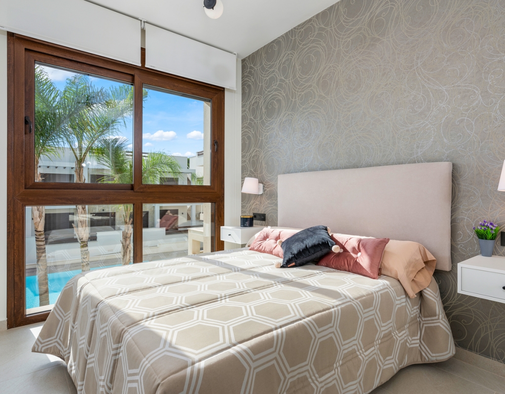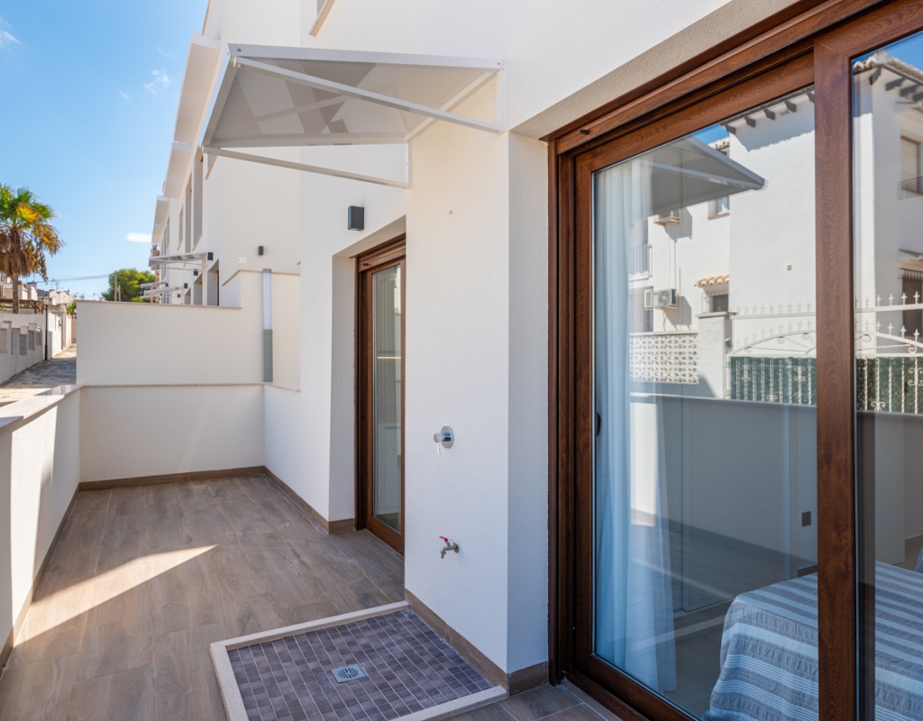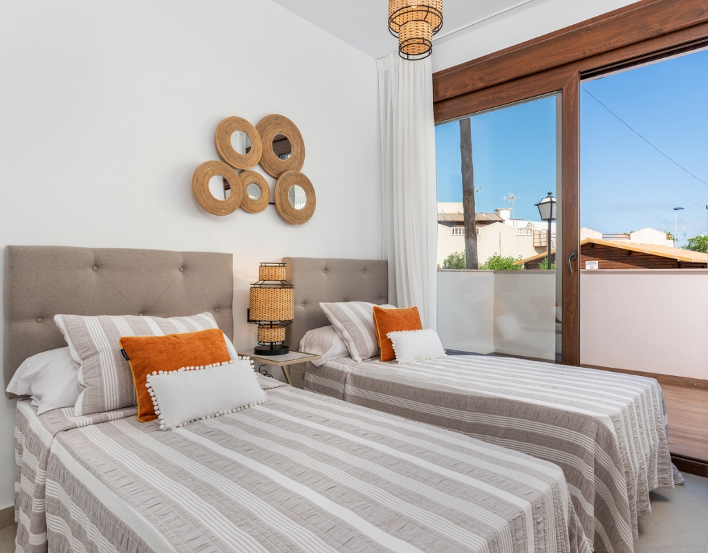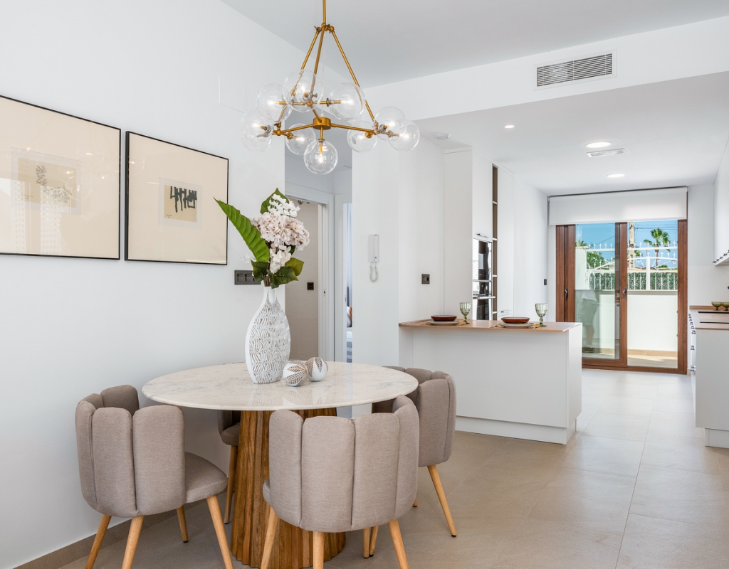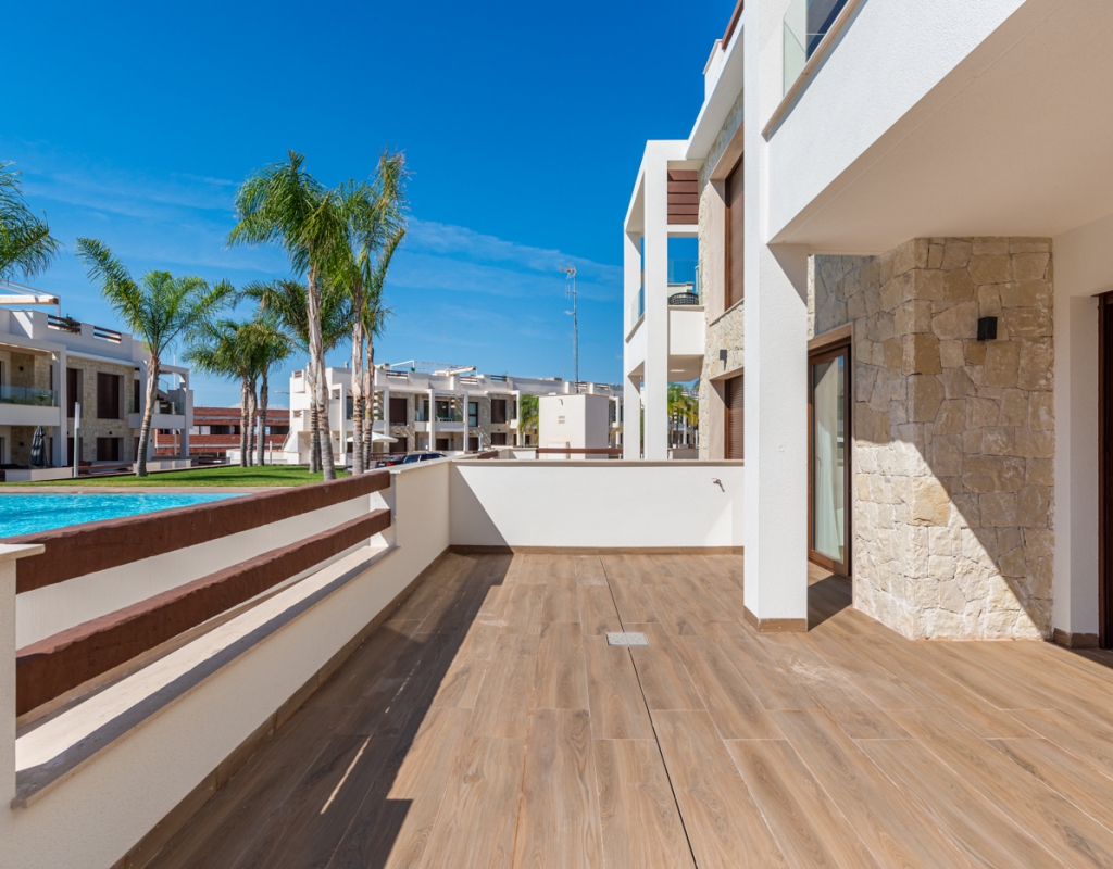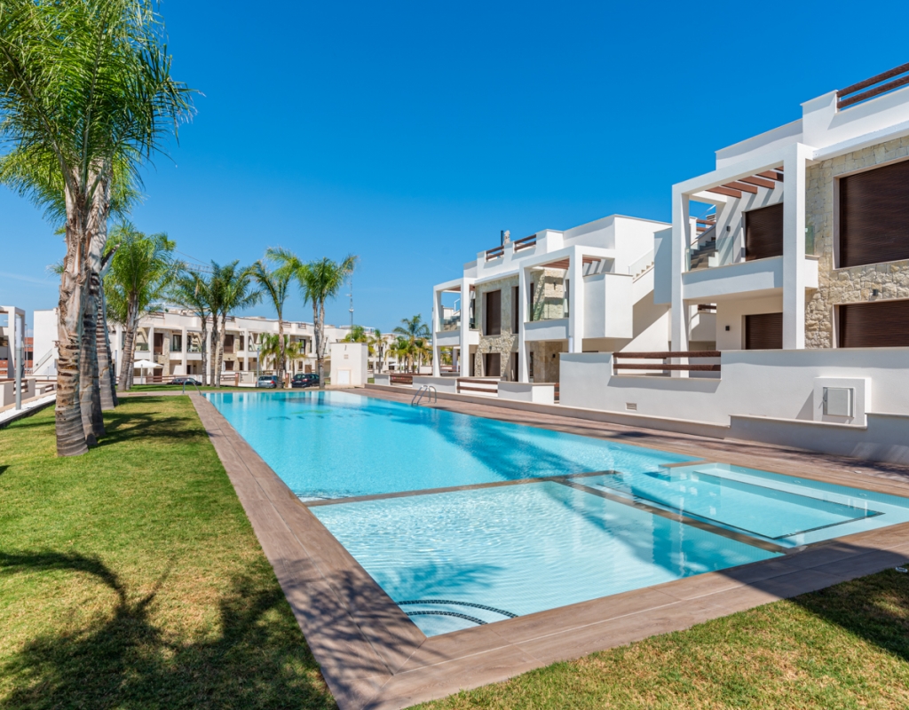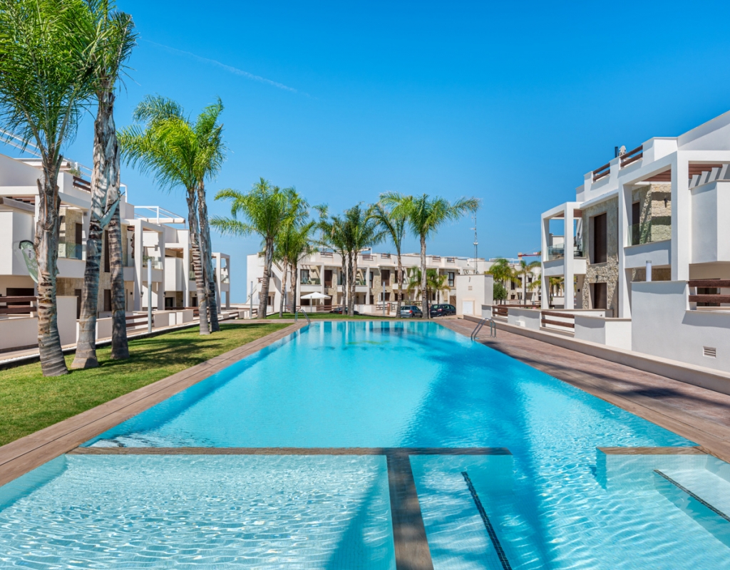 The outdoor spaces of these properties are designed to maximize enjoyment of the Mediterranean climate. Each home features a private terrace, ideal for relaxing outdoors. Additionally, the bungalows have a solarium, perfect for sunbathing in the privacy of your home. The presence of a pergola adds a touch of elegance and functionality, providing shade and style. The common areas include well-maintained gardens, offering a green and tranquil environment for walking or resting.