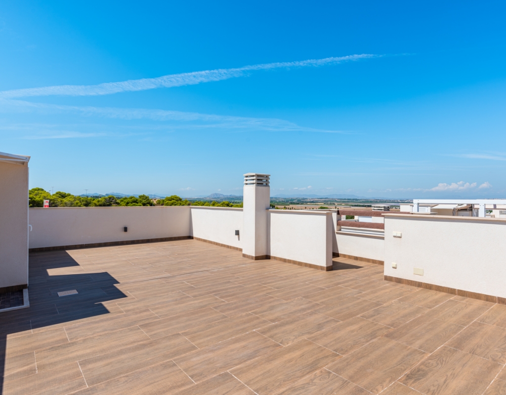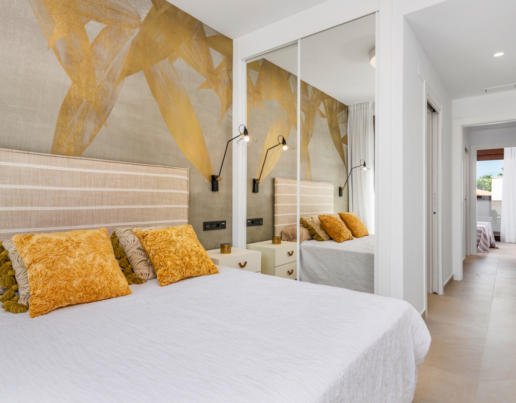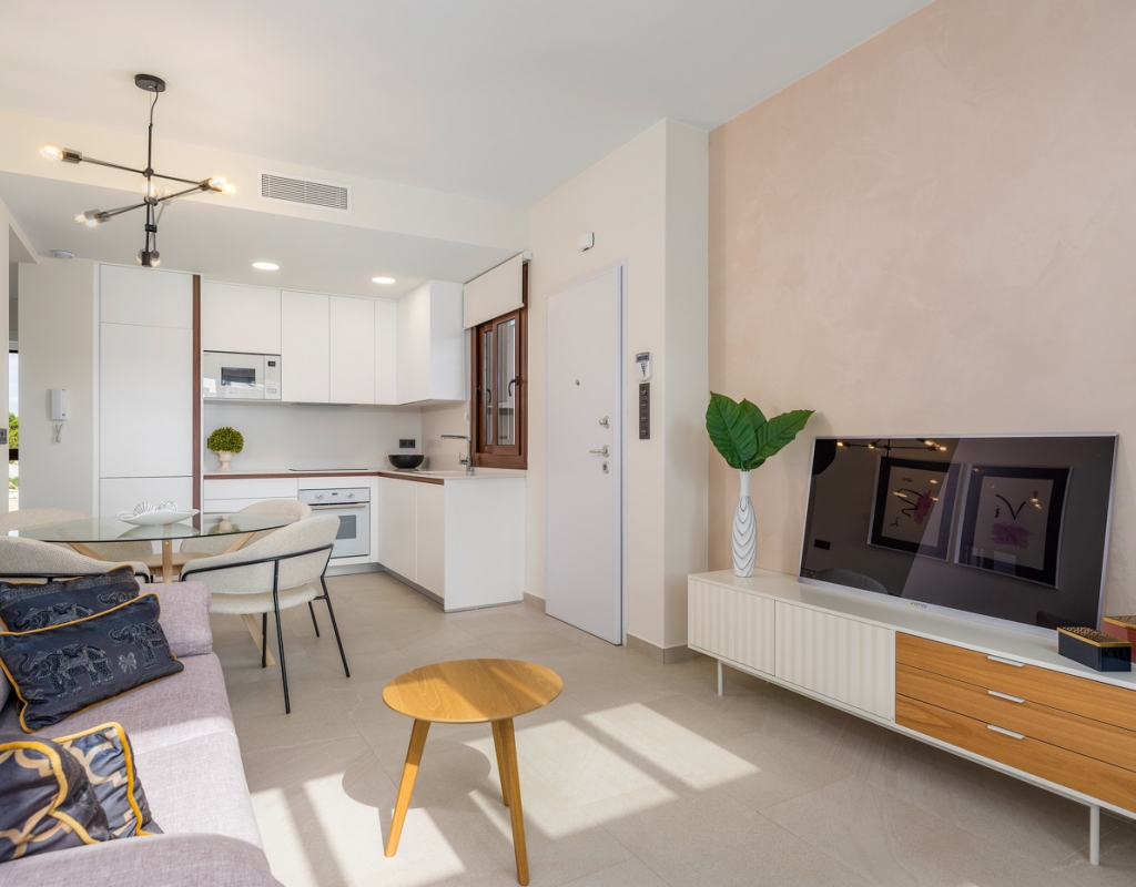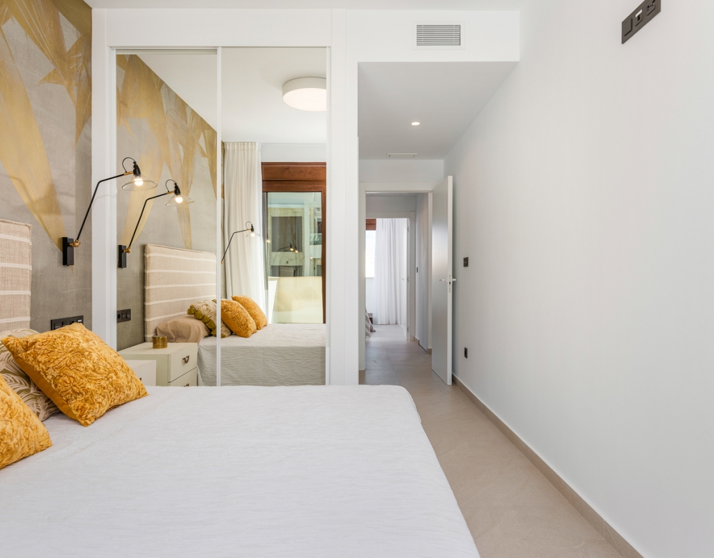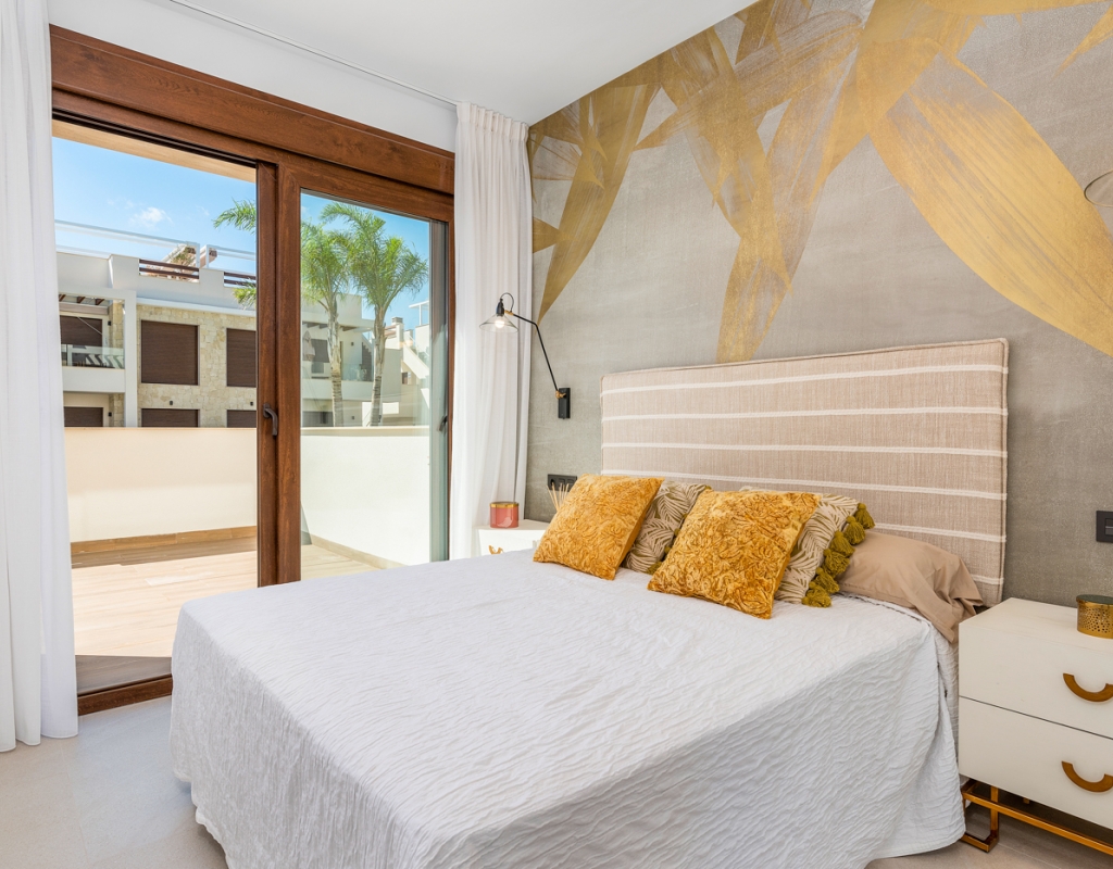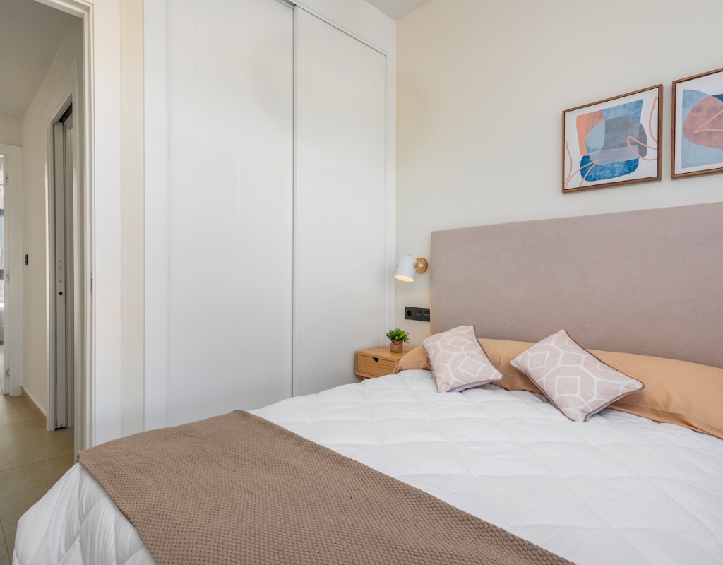 The outdoor spaces of these properties are designed to maximize enjoyment of the Mediterranean climate. Each home features a private terrace, ideal for relaxing outdoors. Additionally, the bungalows have a solarium, perfect for sunbathing in the privacy of your home. The presence of a pergola adds a touch of elegance and functionality, providing shade and style. The common areas include well-maintained gardens, offering a green and tranquil environment for walking or resting.