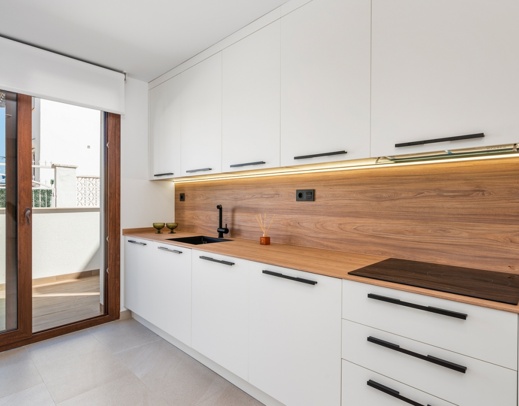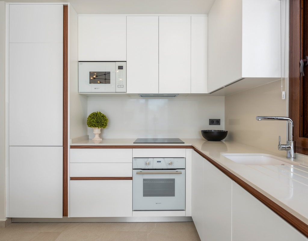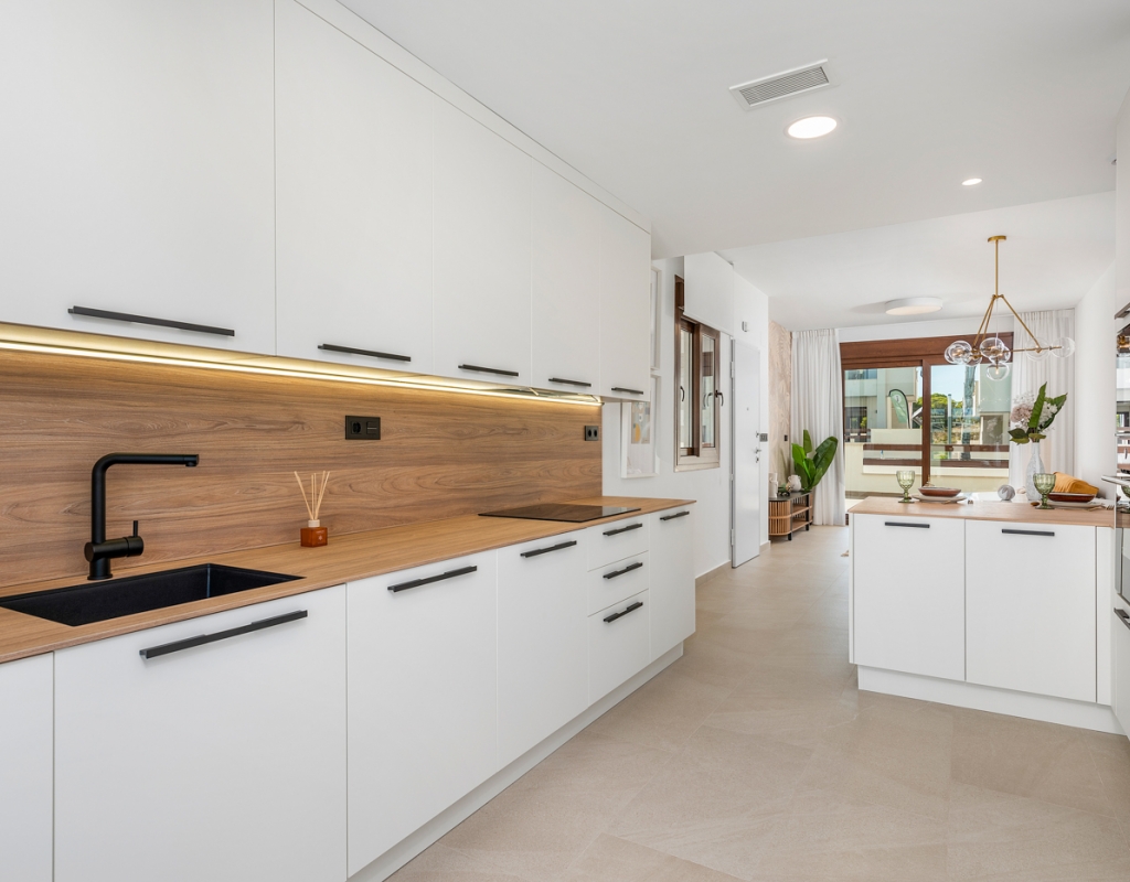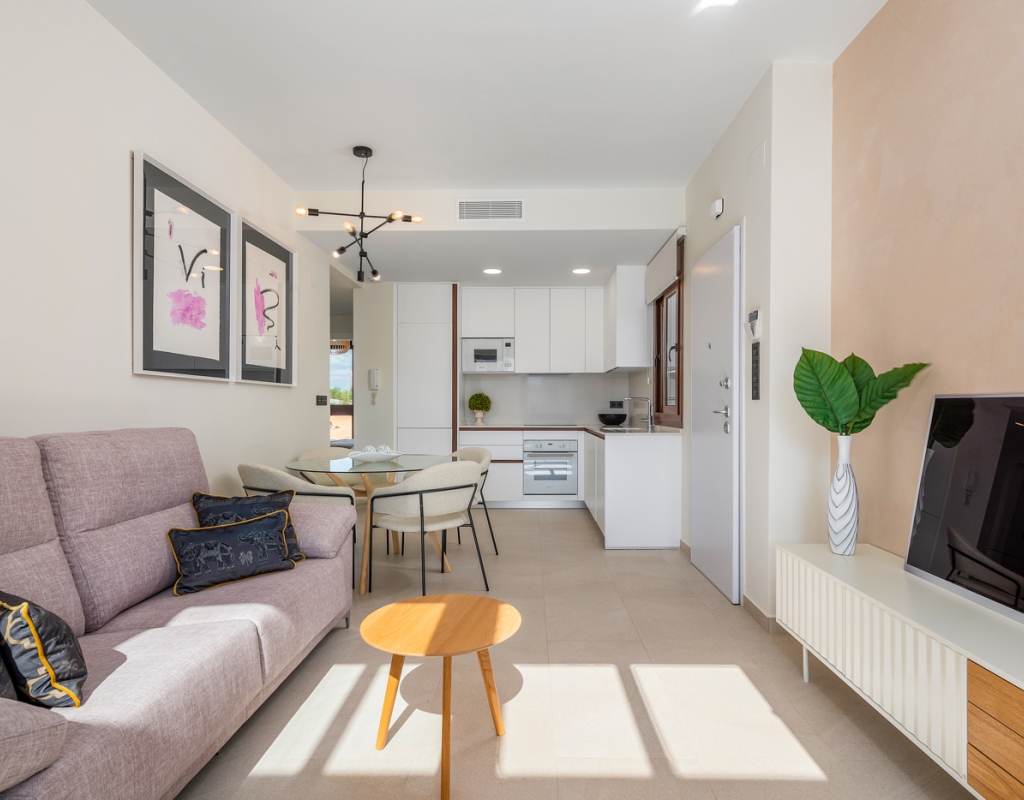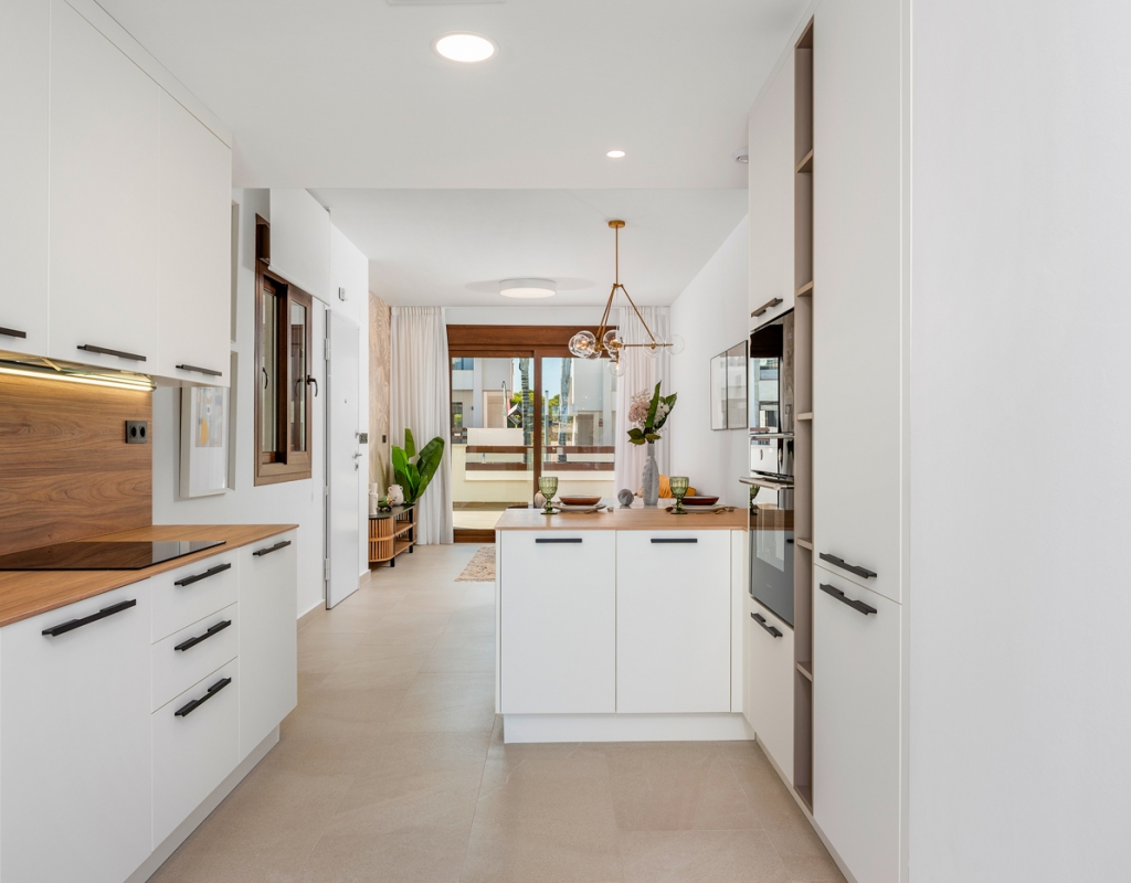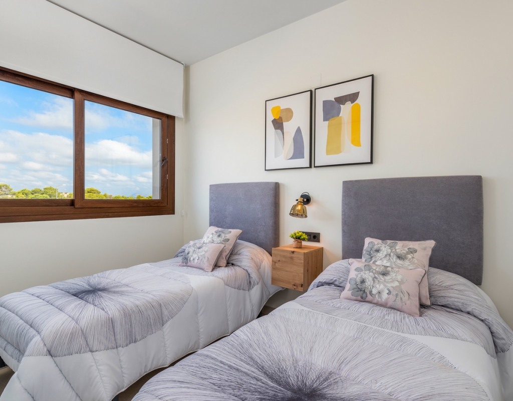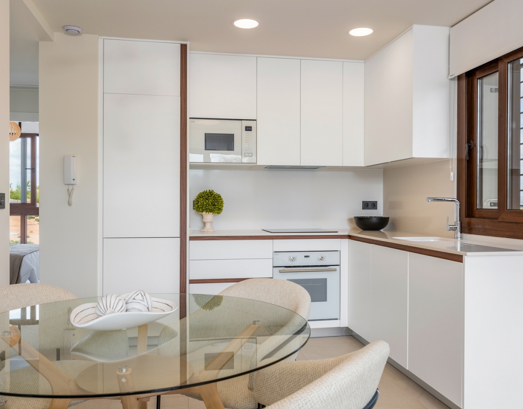 The outdoor spaces of these properties are designed to maximize enjoyment of the Mediterranean climate. Each home features a private terrace, ideal for relaxing outdoors. Additionally, the bungalows have a solarium, perfect for sunbathing in the privacy of your home. The presence of a pergola adds a touch of elegance and functionality, providing shade and style. The common areas include well-maintained gardens, offering a green and tranquil environment for walking or resting.