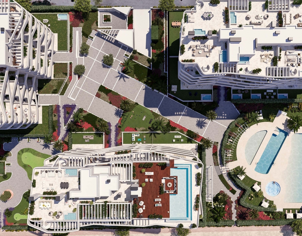 The exterior design of the homes is intended to offer maximum enjoyment of the Mediterranean climate. The properties feature private terraces, perfect for relaxing outdoors and enjoying the views. Additionally, some typologies include private gardens, providing extra space for outdoor activities or creating a personal oasis of greenery. The solariums available in certain units allow for maximum sun exposure throughout the year. The proximity to the sea, just 400 meters away, adds a special appeal, allowing for easy enjoyment of coastal walks and water activities.