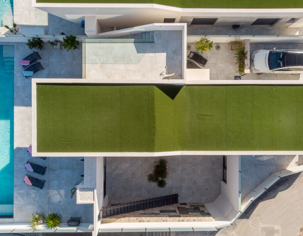 The exterior design of these villas in Rojales is intended to integrate the natural beauty of the surroundings with modern comfort. Each villa features a private garden, perfect for enjoying the Mediterranean climate. The spacious terraces offer additional outdoor space, ideal for relaxing or entertaining guests while enjoying the sea views. Additionally, the properties include a solarium, providing an elevated spot to further appreciate the surrounding landscape. The proximity to the sea, just 4.6 km away, allows for enjoying the sea breeze and coastal walks whenever desired.