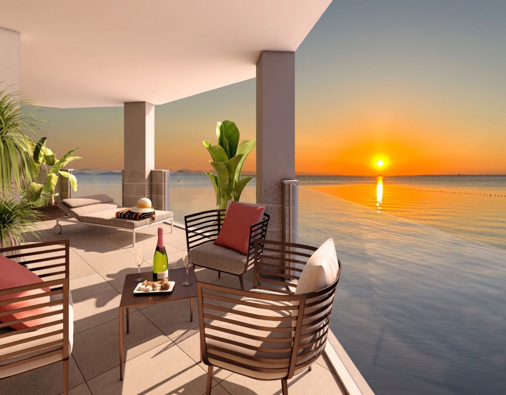 The exteriors of this residential complex in La Manga del Mar Menor are designed to offer an environment of tranquility and enjoyment. The residences feature private terraces, perfect for relaxing while overlooking the sea. Additionally, the penthouses have solariums, providing extra outdoor space to enjoy the Mediterranean climate. The communal garden areas add a touch of nature and freshness to the complex, creating a pleasant and welcoming atmosphere. The privileged location allows for sea views from various points of the complex, making every moment a unique experience.