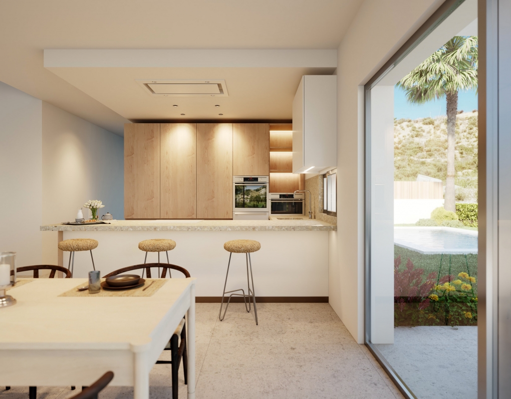The properties feature an exterior design that invites enjoyment of the Mediterranean climate. Each home has a private garden, perfect for creating a personal oasis of tranquility. The terrace, an ideal space for relaxing or sharing moments with friends and family, offers a versatile setting for various outdoor activities. Additionally, each property includes a private pool, providing a refreshing place to enjoy during the warm summer days. The inclusion of a private garage ensures convenience and security for vehicle parking.