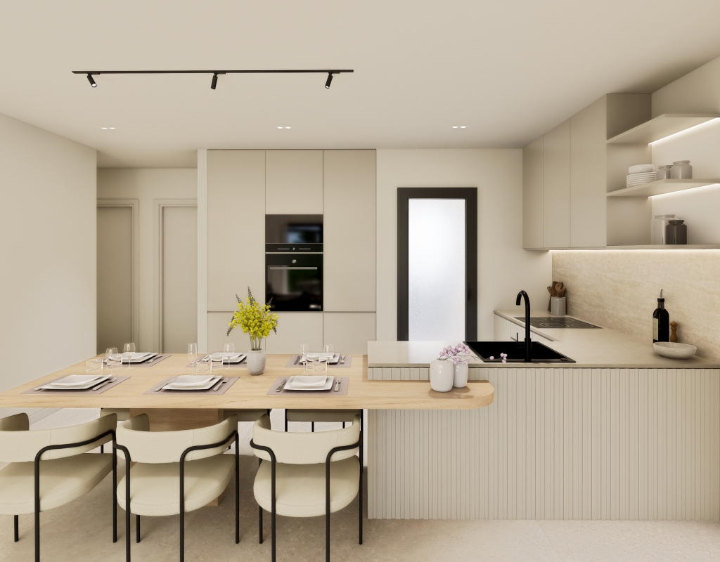 The interior of these homes is designed to offer comfort and functionality. With a layout that includes three bedrooms and two bathrooms, each space is optimized for maximum use. Porcelain tile floors add a modern and elegant touch, while electric shutters and integrated appliances make daily life easier. Built-in wardrobes provide efficient storage, maintaining order and aesthetics. Additionally, the pre-installation of air conditioning ensures the home is ready to maintain a pleasant temperature year-round. These details reflect a commitment to quality and comfort.