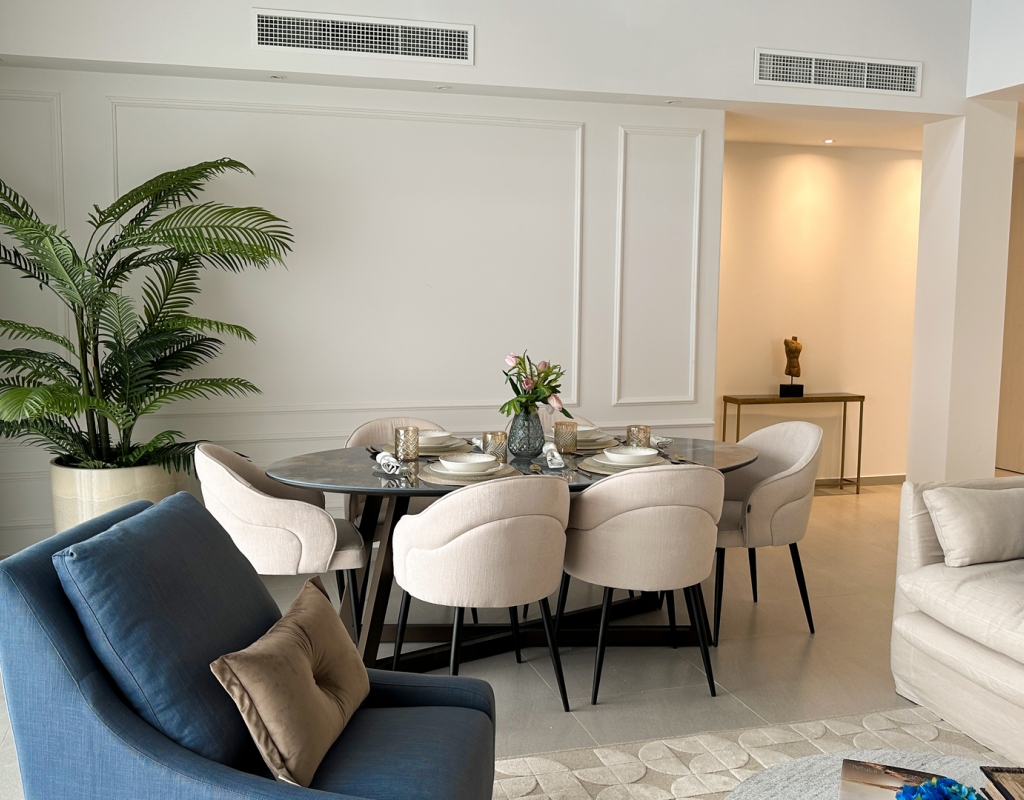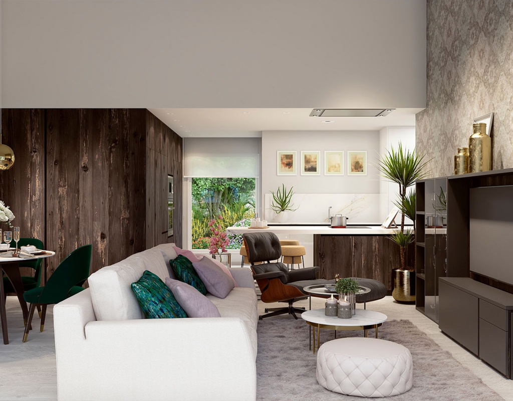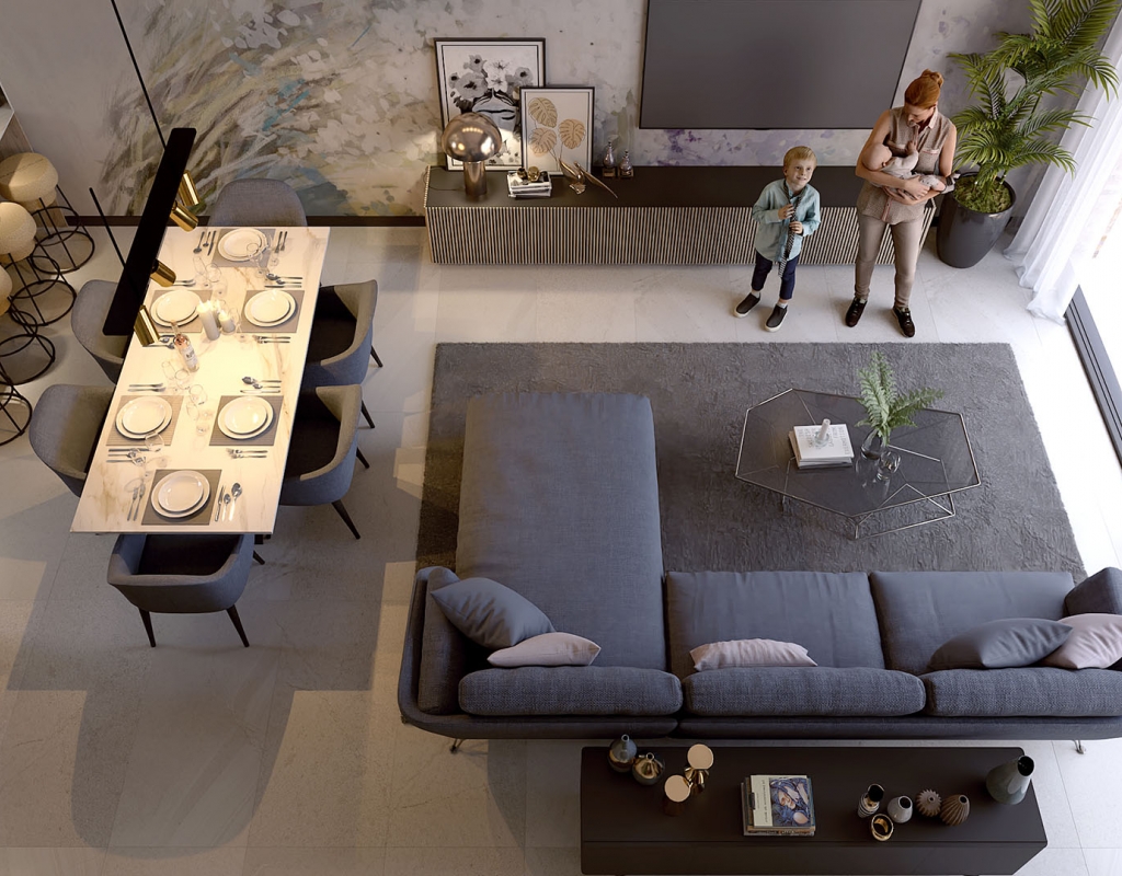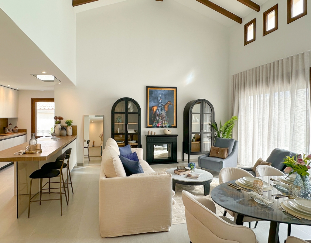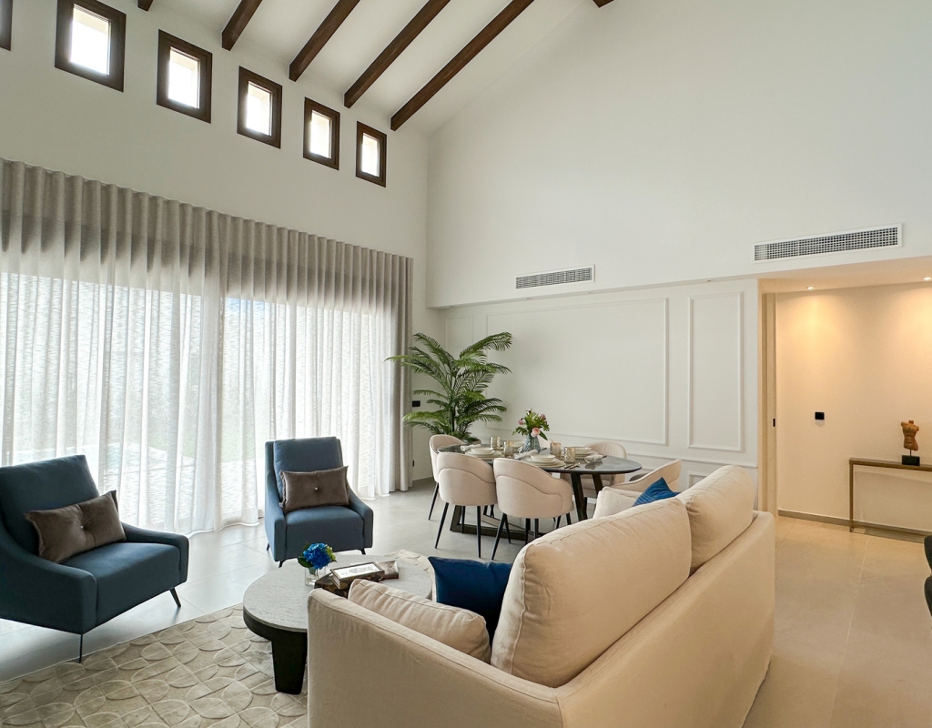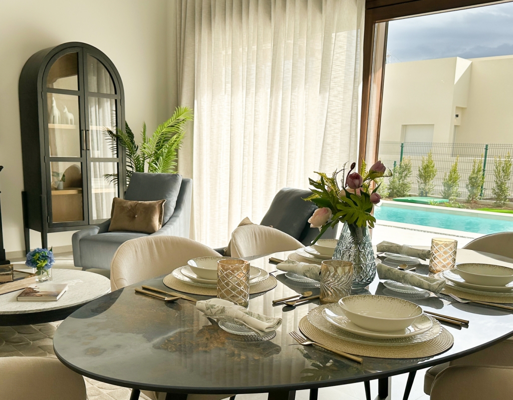 The interiors of the homes are designed to offer maximum comfort and modernity. The properties are available in 2 and 3-bedroom configurations, all with 2 bathrooms, ensuring ample space for families of different sizes. The interiors are equipped with air conditioning and underfloor heating, ensuring a comfortable environment year-round. Built-in wardrobes offer practical and elegant storage solutions. The kitchen comes fully equipped with modern appliances, and electric blinds add a touch of convenience. Additionally, the properties are furnished, facilitating immediate move-in. The ceramic flooring provides an elegant and easy-to-maintain finish.
