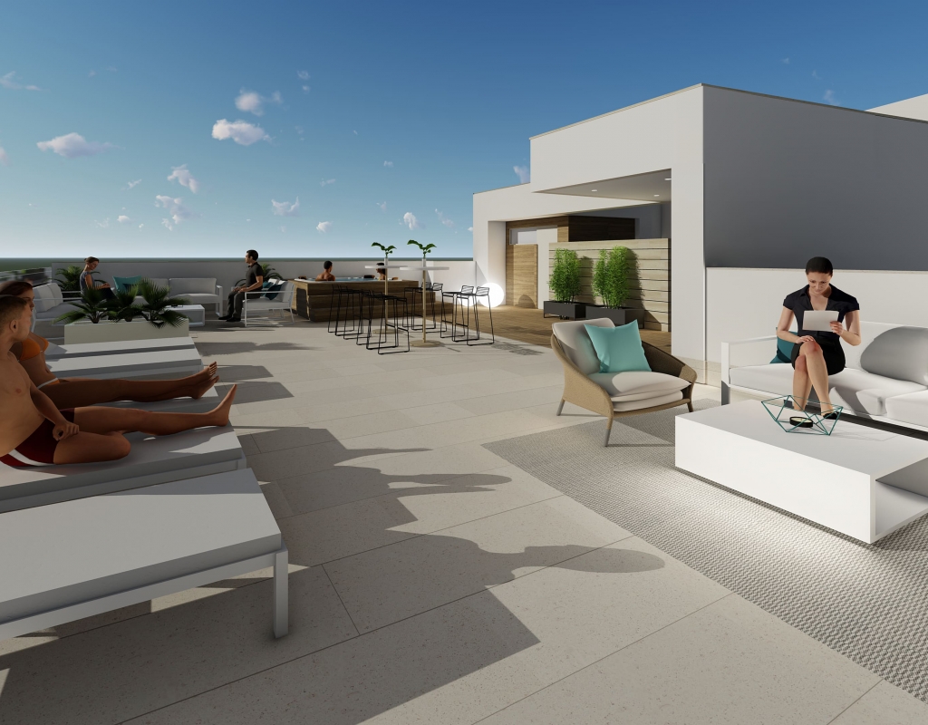 The residential offers attractive common areas including a communal jacuzzi, ideal for relaxing and socializing with neighbors. Additionally, the communal solarium provides a shared space to enjoy the sun and panoramic views of the area. These facilities are designed to enhance the residents' quality of life, offering leisure and relaxation spaces without needing to leave the complex.