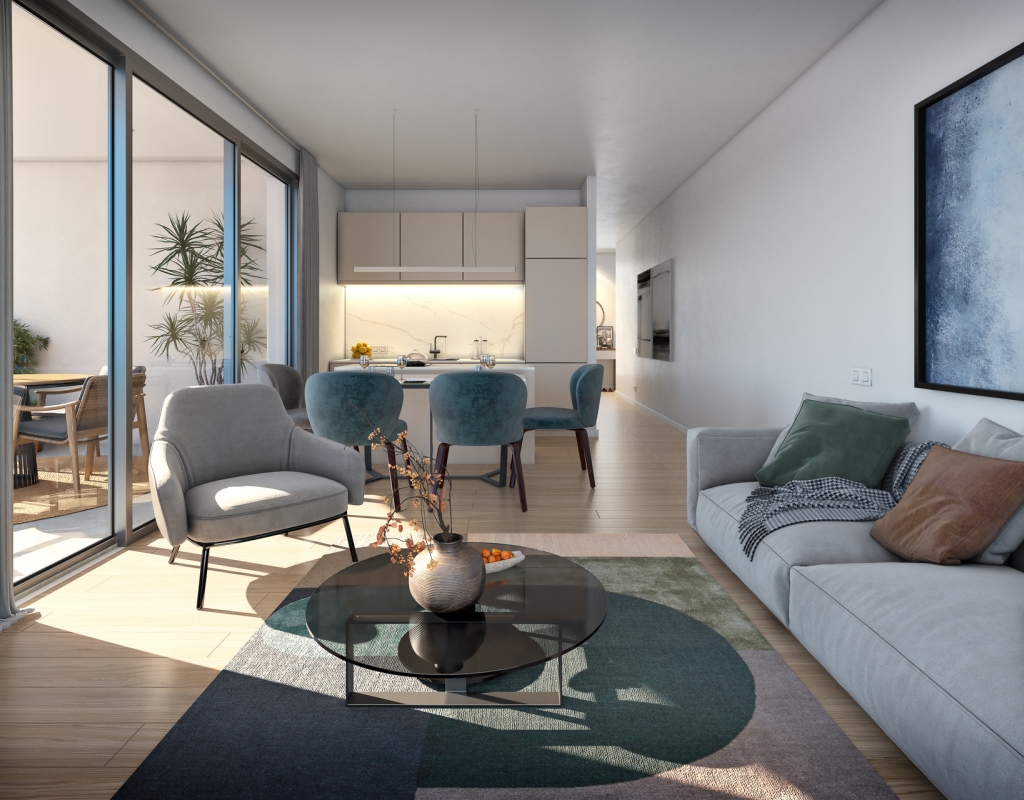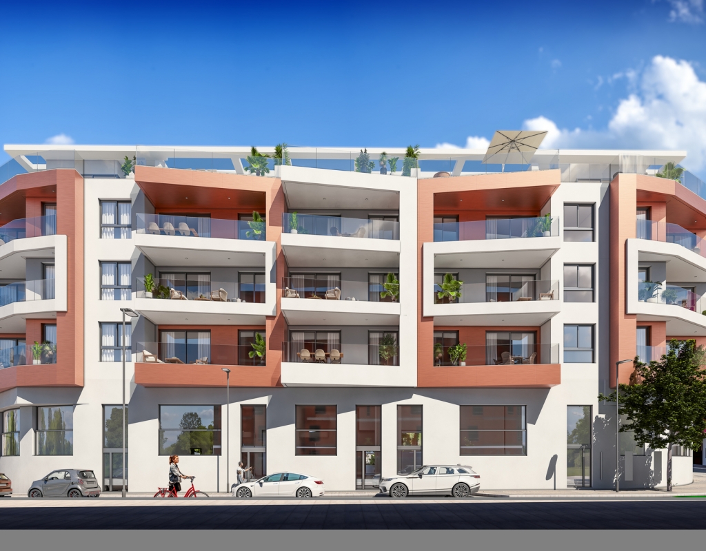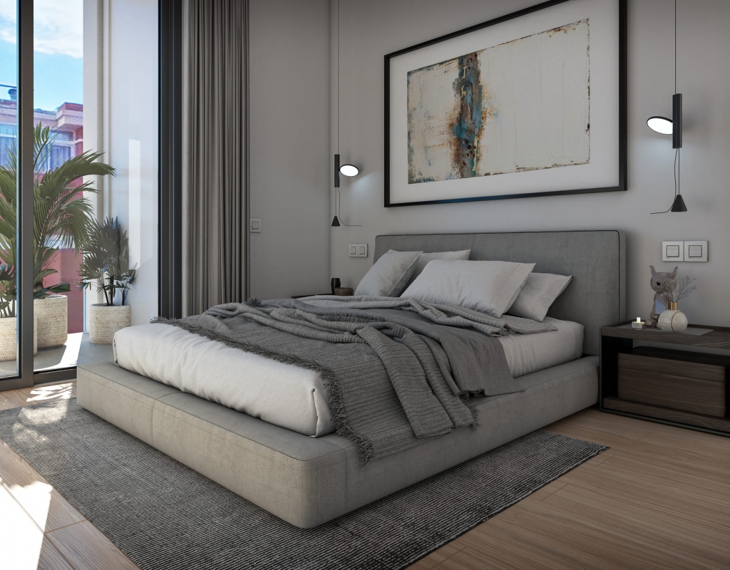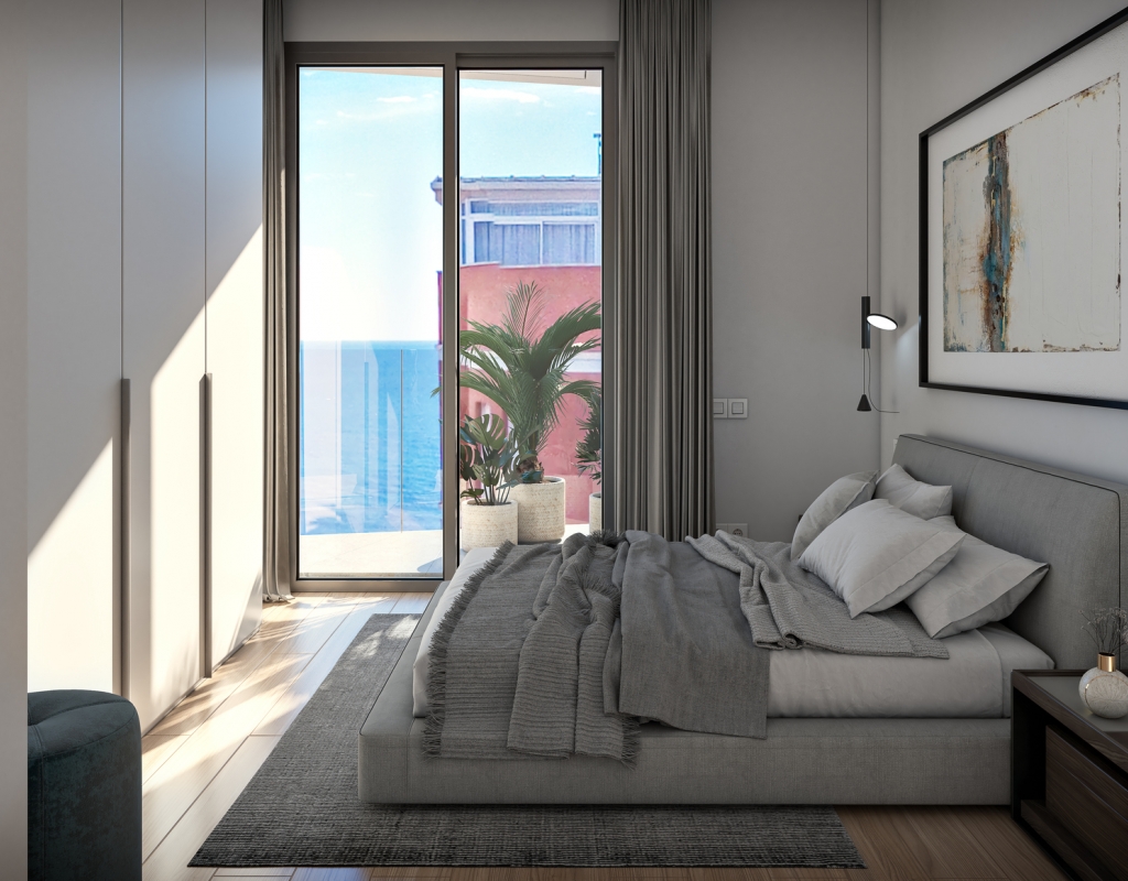 The interiors of the apartments and penthouses are designed to offer a modern and cozy atmosphere. The homes feature two bedrooms and two bathrooms, ensuring space and privacy for all family members. The flooring combines tiles and laminate, adding a touch of elegance and warmth. The kitchen is equipped with state-of-the-art appliances, facilitating daily tasks. Comfort is assured with the installation of air conditioning and electric blinds, while built-in wardrobes offer practical and efficient storage solutions. Security and comfort are enhanced with the inclusion of a video intercom.