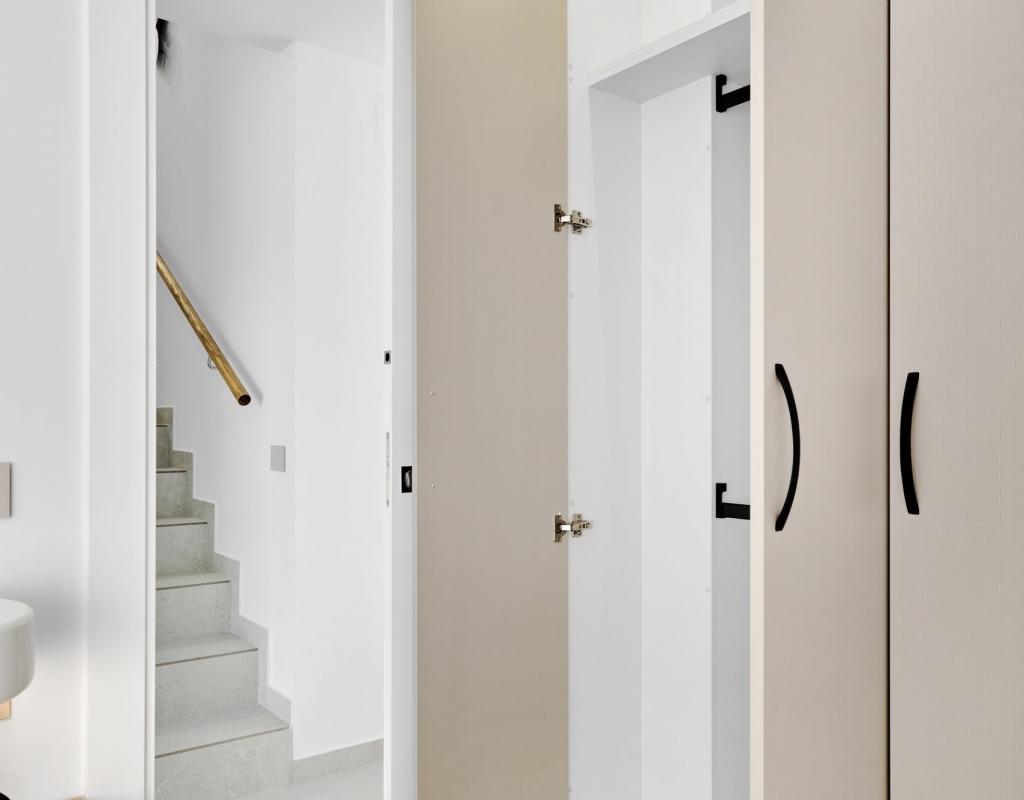 The interiors of these homes in San Miguel de Salinas are designed to offer maximum comfort and functionality. The properties feature three bedrooms and two bathrooms, providing a spacious and comfortable space for families or couples. The interiors are equipped with air conditioning and pre-installed air conditioning, ensuring a pleasant environment year-round. Electric shutters and built-in wardrobes add a touch of modernity and practicality. The kitchen is fully equipped with appliances, and the homes are delivered furnished, ready for move-in. The ceramic flooring adds an elegant and easy-to-maintain touch to the interiors.