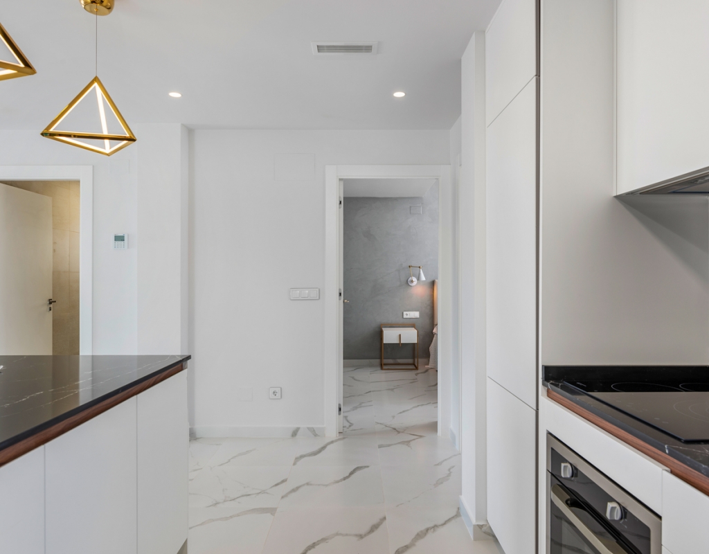 The outdoor areas of these properties are designed to maximize enjoyment of the Mediterranean climate. Each bungalow features a private garden, ideal for creating a personal green space or enjoying outdoor activities. The terraces offer a perfect place to relax and enjoy the surrounding views. Additionally, residents have the option to enjoy a solarium, an additional space that allows for maximum sun exposure throughout the year. For those looking to cool off, some bungalows include a private pool, providing a personal oasis of tranquility and fun.