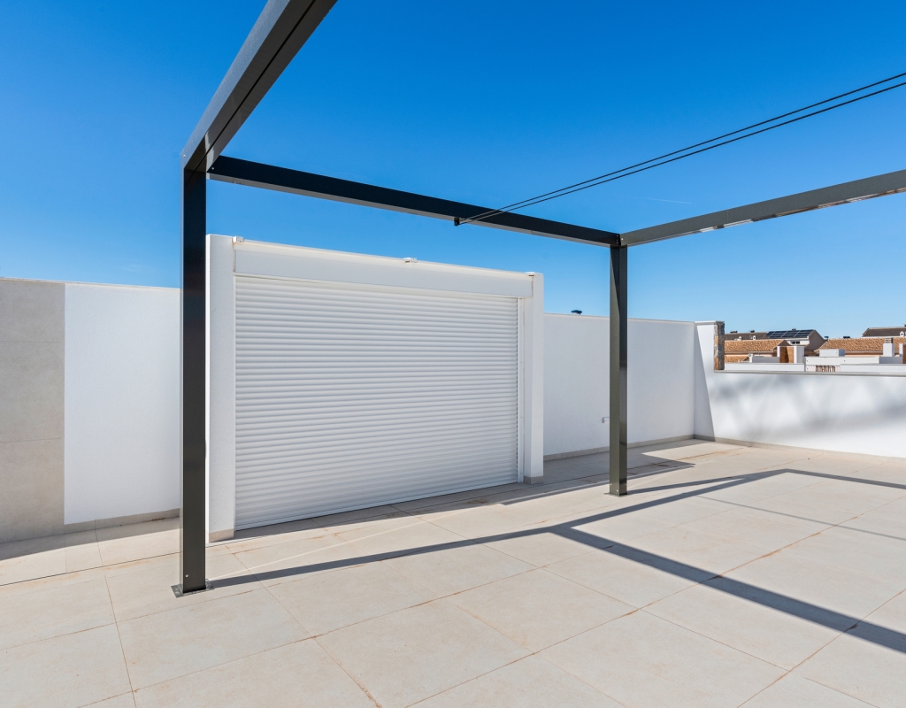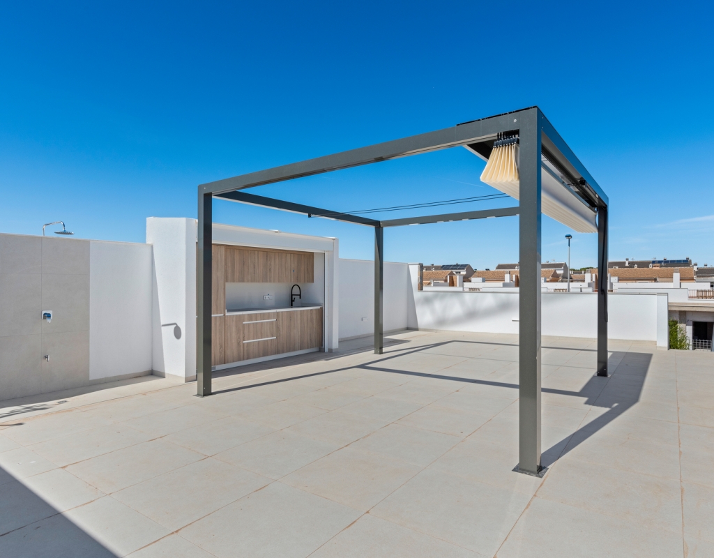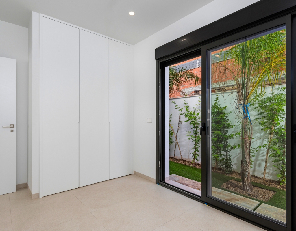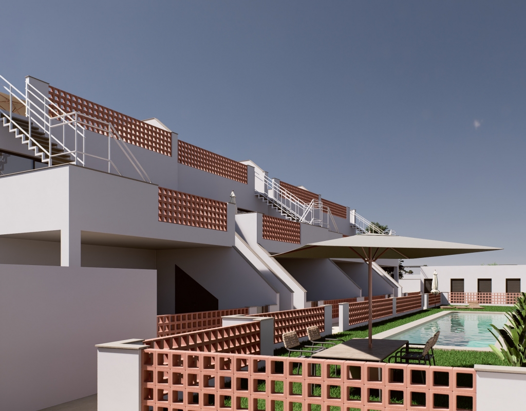 The exteriors of these properties are designed to maximize enjoyment of the Mediterranean climate. Each bungalow features a private garden, perfect for creating a personal green space or enjoying outdoor moments. The spacious terraces offer an ideal place to relax or share with friends and family, while the solarium provides additional space for sunbathing or enjoying the views. The community also features common garden areas, adding a touch of nature and freshness to the environment.