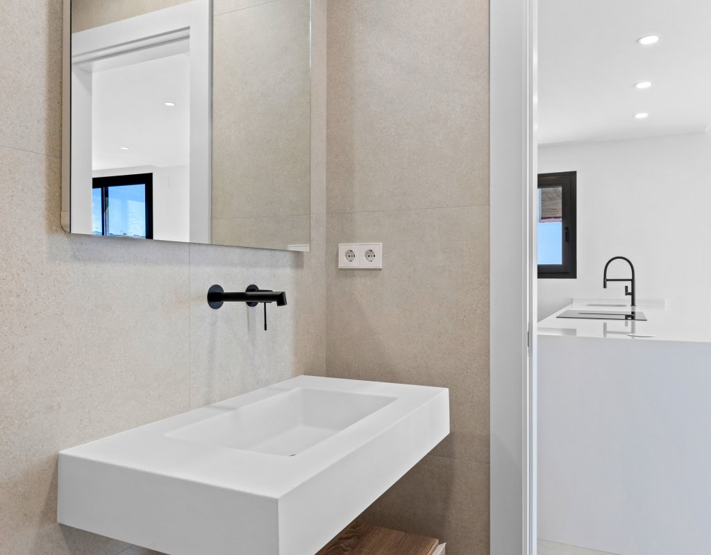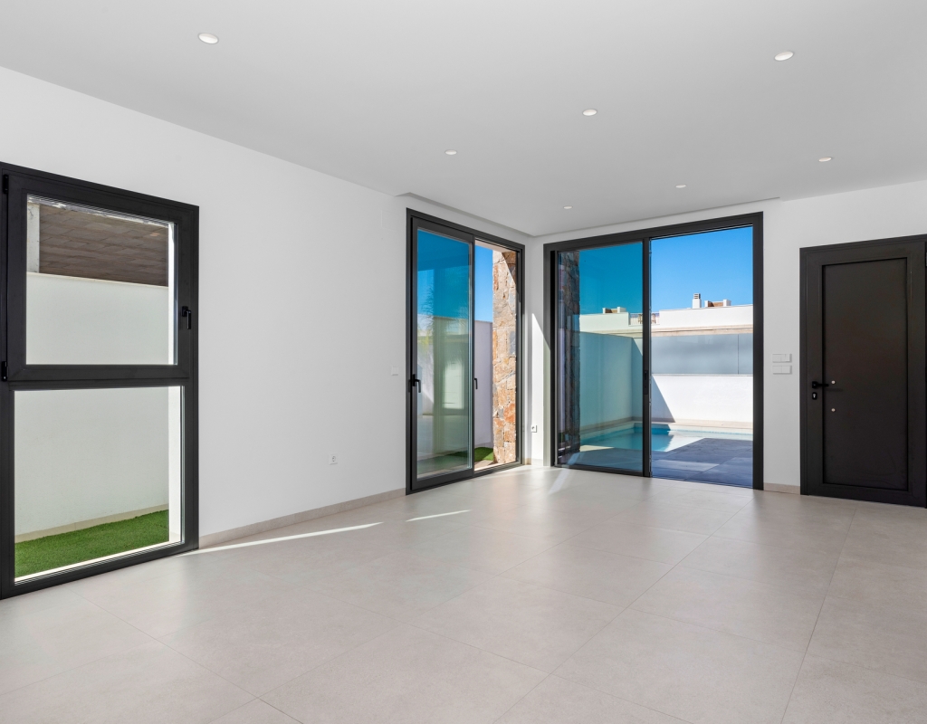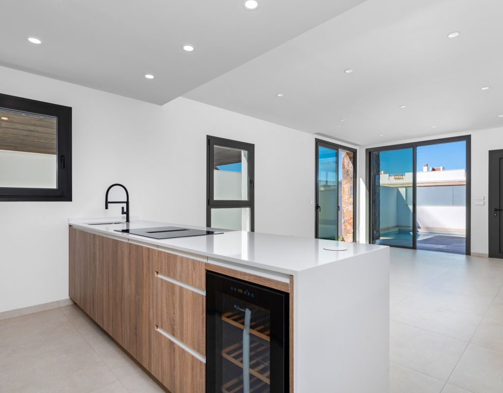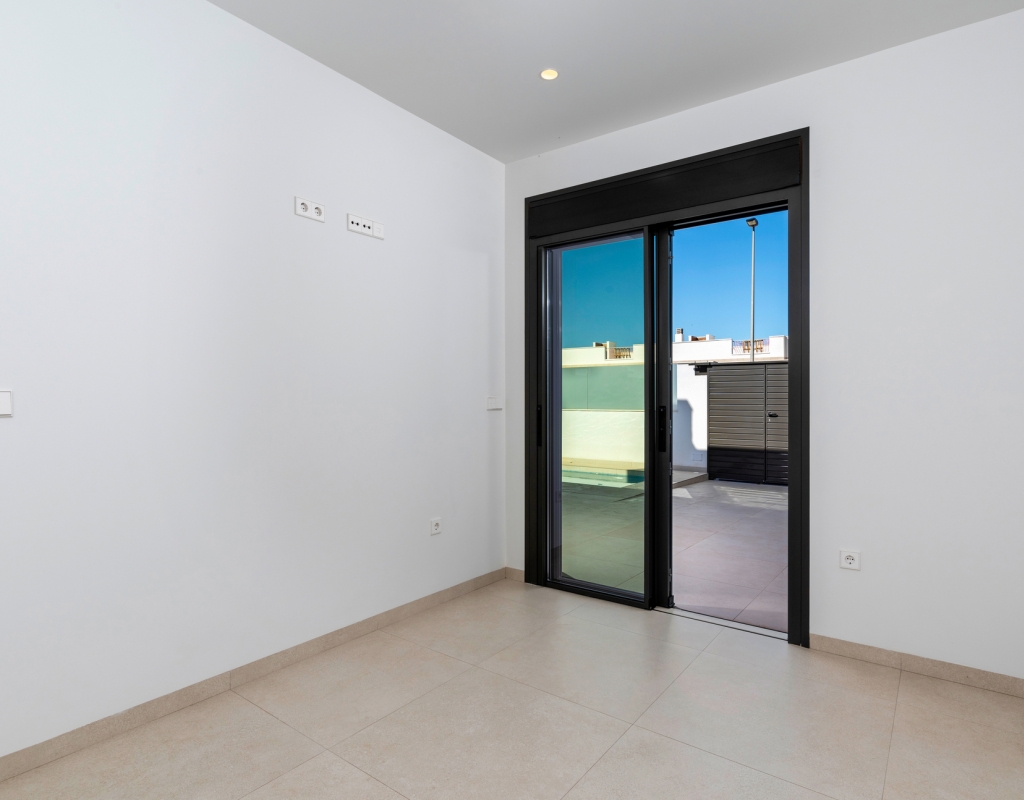 The exteriors of these properties are designed to maximize enjoyment of the Mediterranean climate. Each bungalow features a private garden, perfect for creating a personal green space or enjoying outdoor moments. The spacious terraces offer an ideal place to relax or share with friends and family, while the solarium provides additional space for sunbathing or enjoying the views. The community also features common garden areas, adding a touch of nature and freshness to the environment.