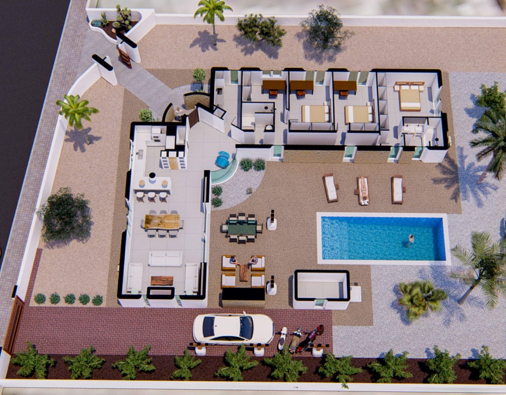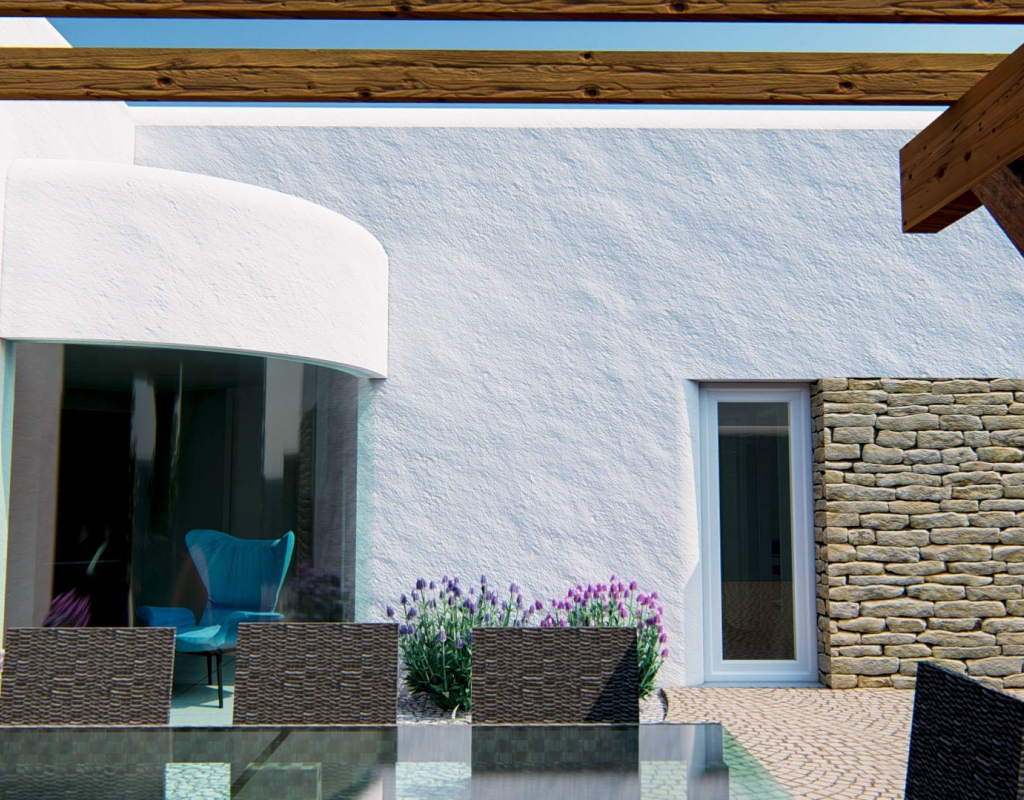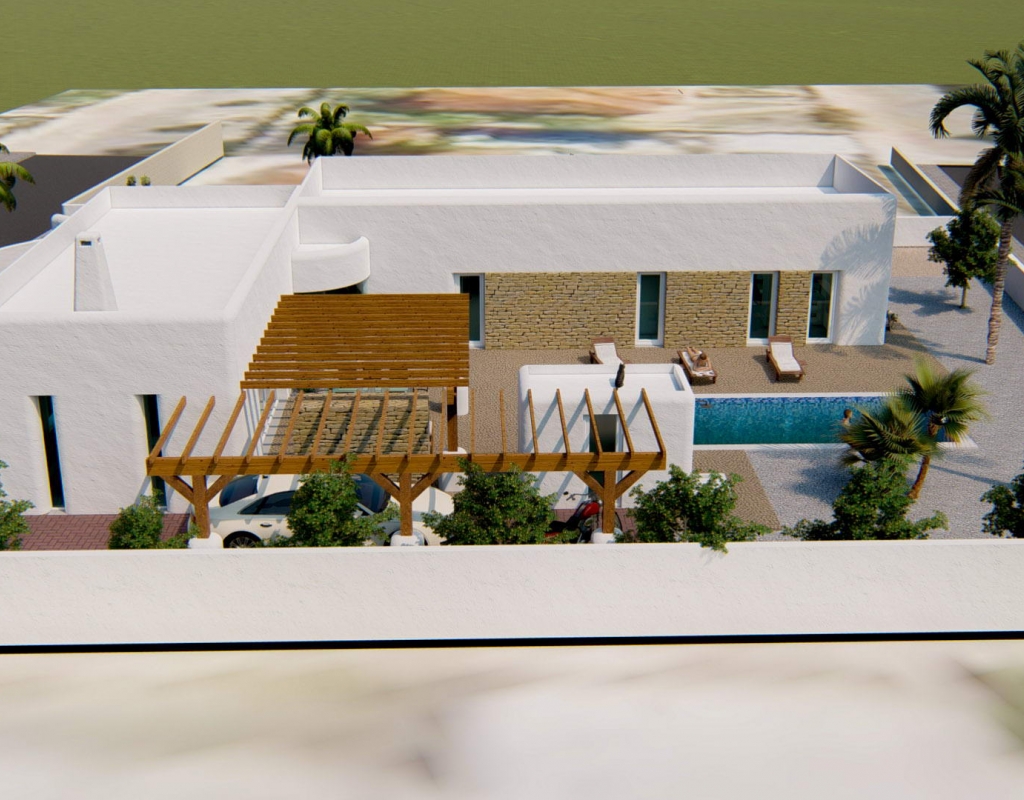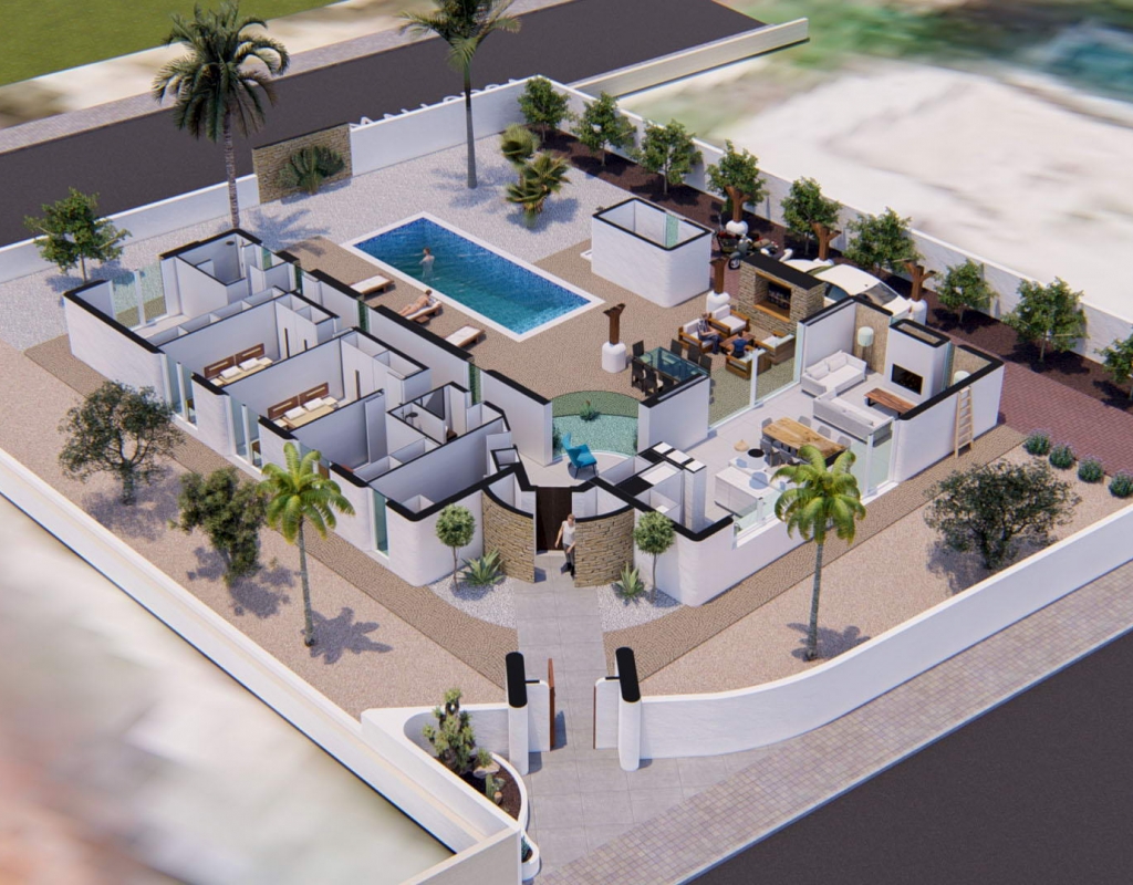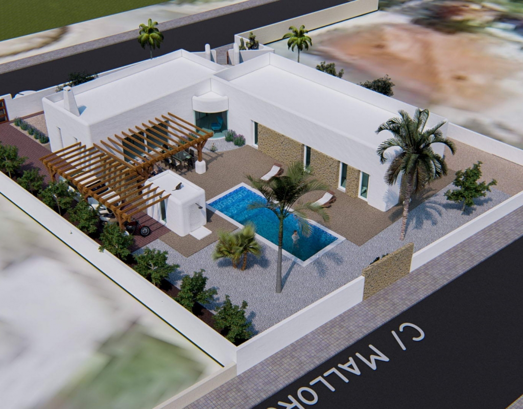 The interior of the villa is designed with attention to detail, offering comfort and style. It features three bedrooms, perfect for accommodating the whole family, and two well-equipped bathrooms. The ceramic floors add a modern touch and are easy to maintain. The property is equipped with air conditioning, ensuring a pleasant environment throughout the year. Appliances are included, making daily life easier. Electric blinds and the video intercom add an extra level of comfort and security. Built-in wardrobes offer ample storage space, keeping the home organized and clutter-free.