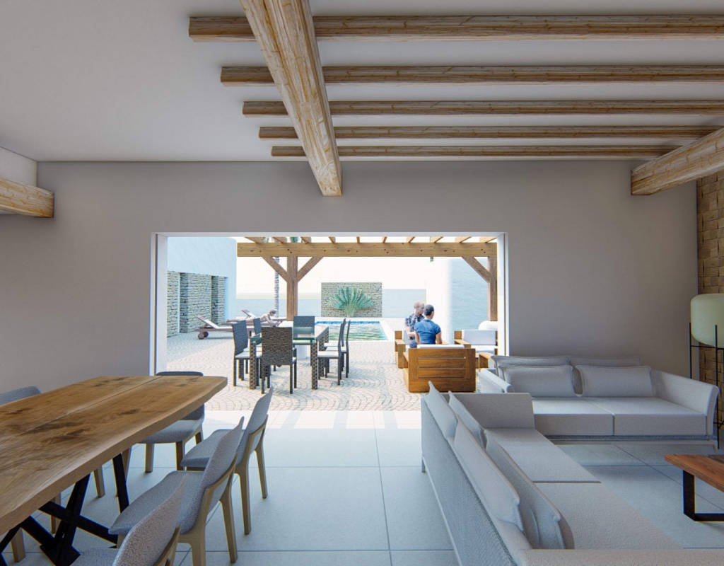 The exterior of this detached villa in Alfaz del Pi is designed to maximize enjoyment of the Mediterranean climate. It features a beautiful garden, ideal for relaxing or enjoying outdoor activities. The terrace is a perfect space for al fresco dining or simply enjoying the views and natural surroundings. Additionally, the property includes a private pool, offering a personal oasis for cooling off during warm summer days. The pergola adds a touch of elegance and provides shade, creating a welcoming outdoor atmosphere.