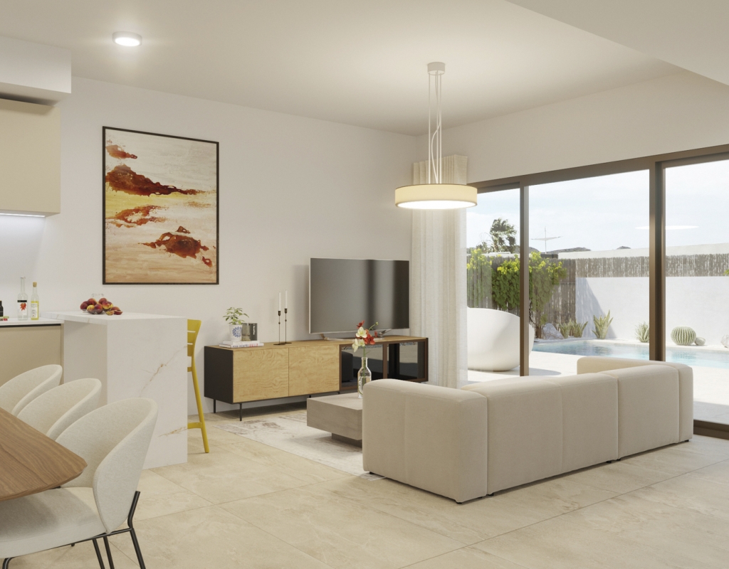 The interior of these independent homes in La Rellana is designed to offer maximum comfort and functionality. The porcelain tile floors add a touch of elegance and are easy to maintain. The homes are equipped with modern appliances, making daily tasks easier. Integrated home automation allows for efficient and convenient control of various aspects of the home. Electric shutters add an extra level of comfort and security. Built-in wardrobes in the bedrooms provide ample storage space, maintaining the home's order and aesthetics.
