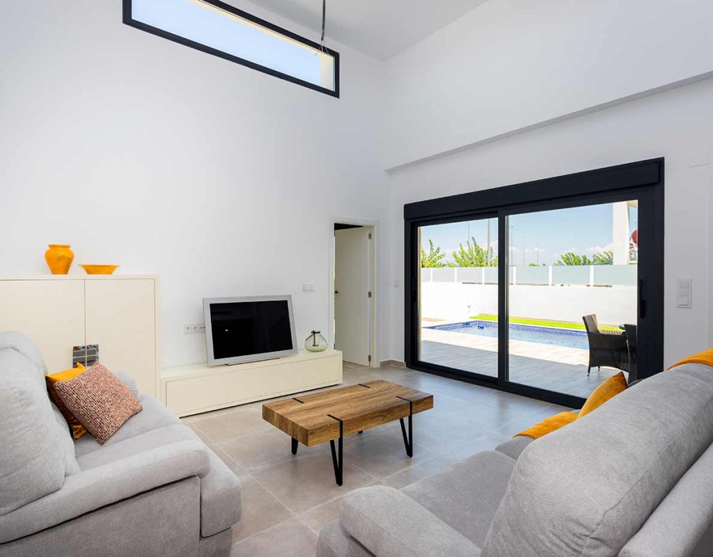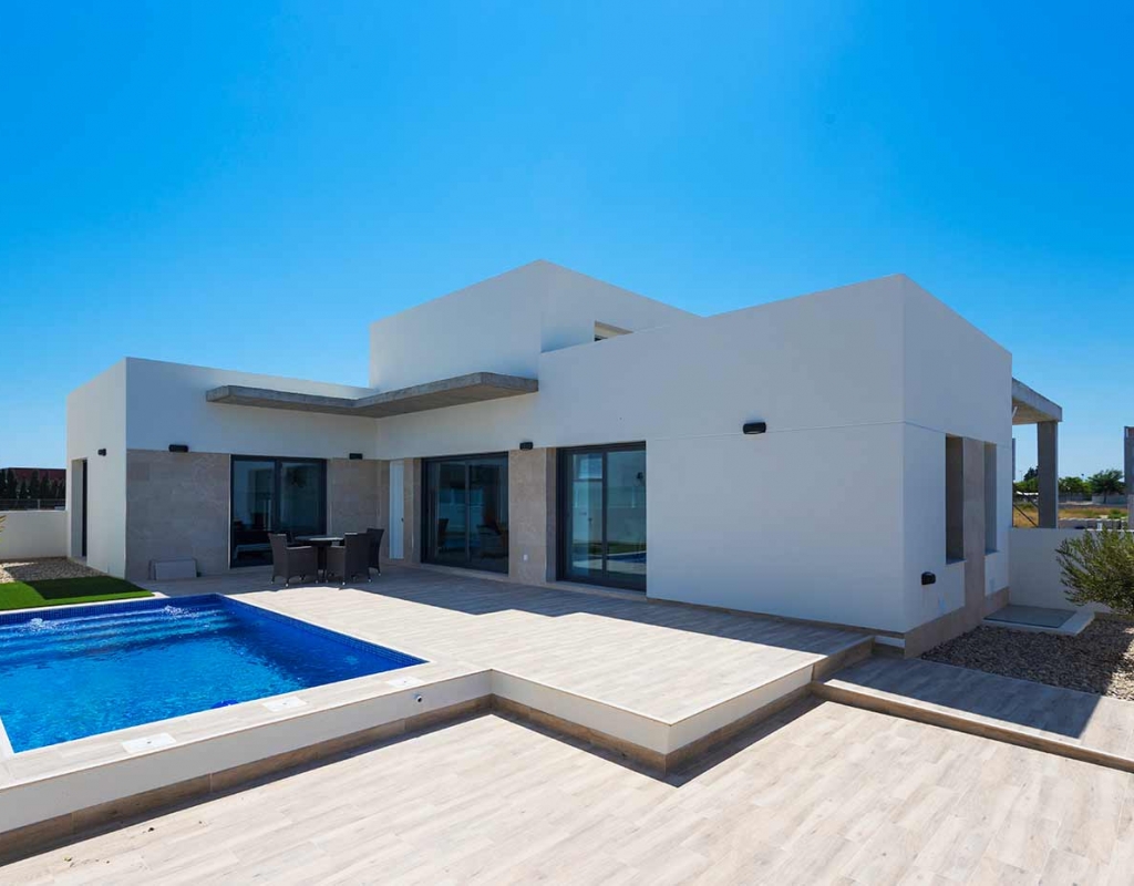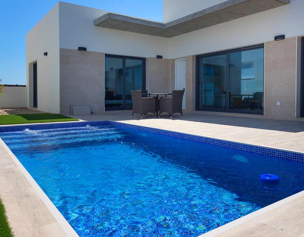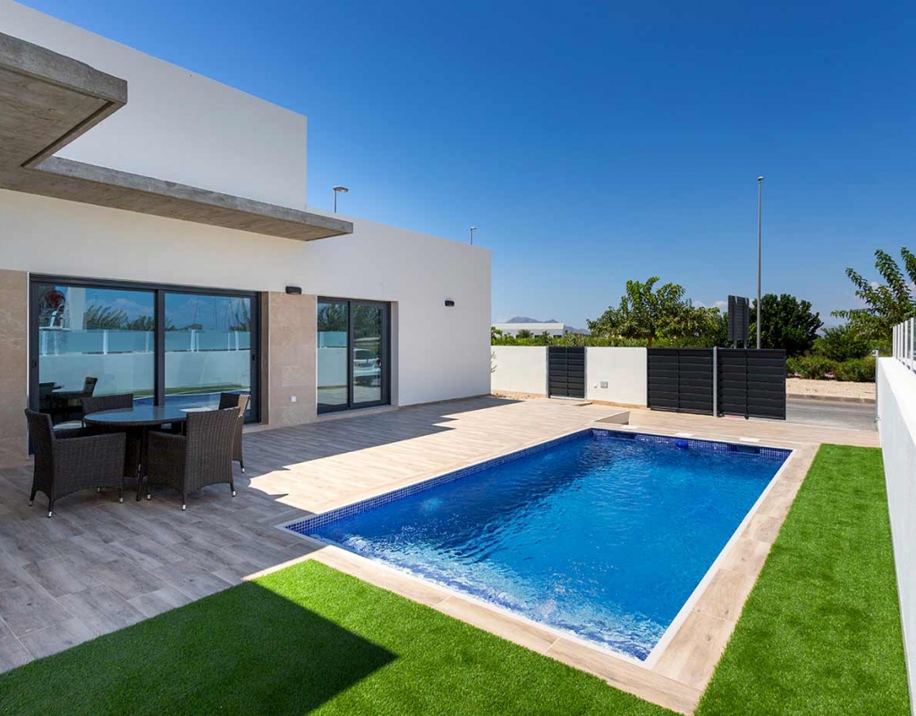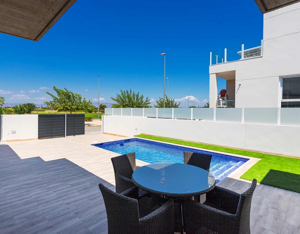 Newly built villas on one level in the new part of Daya Nueva. Only a few minutes walk to the centre of the village. The property consists of 3 bedrooms, 2 bathrooms and a private pool of 18m2. Living/dining room with double height ceiling, open plan kitchen, natural light and option for solarium. The master bedroom has walk in wardrobe option and en suite bathrooms.