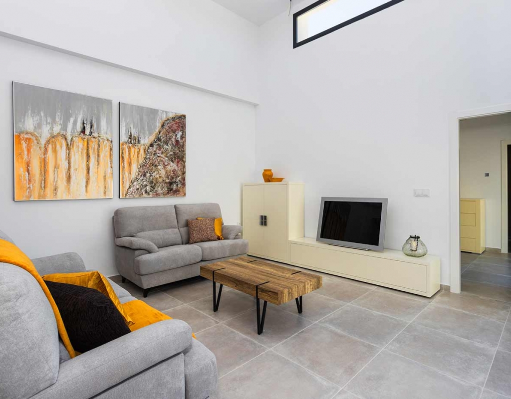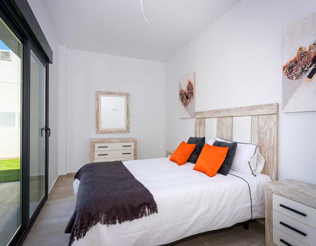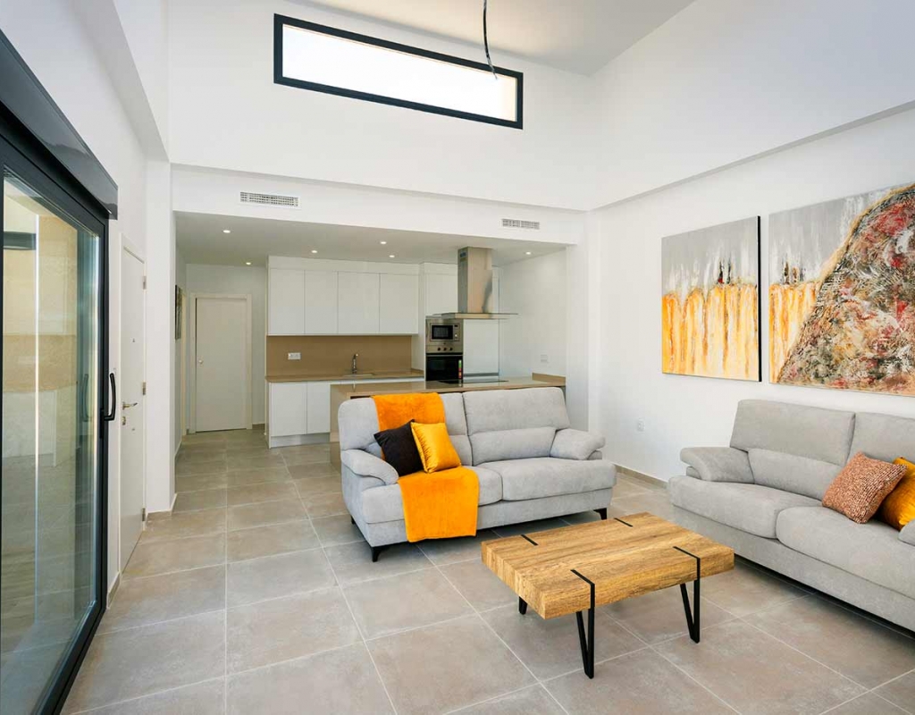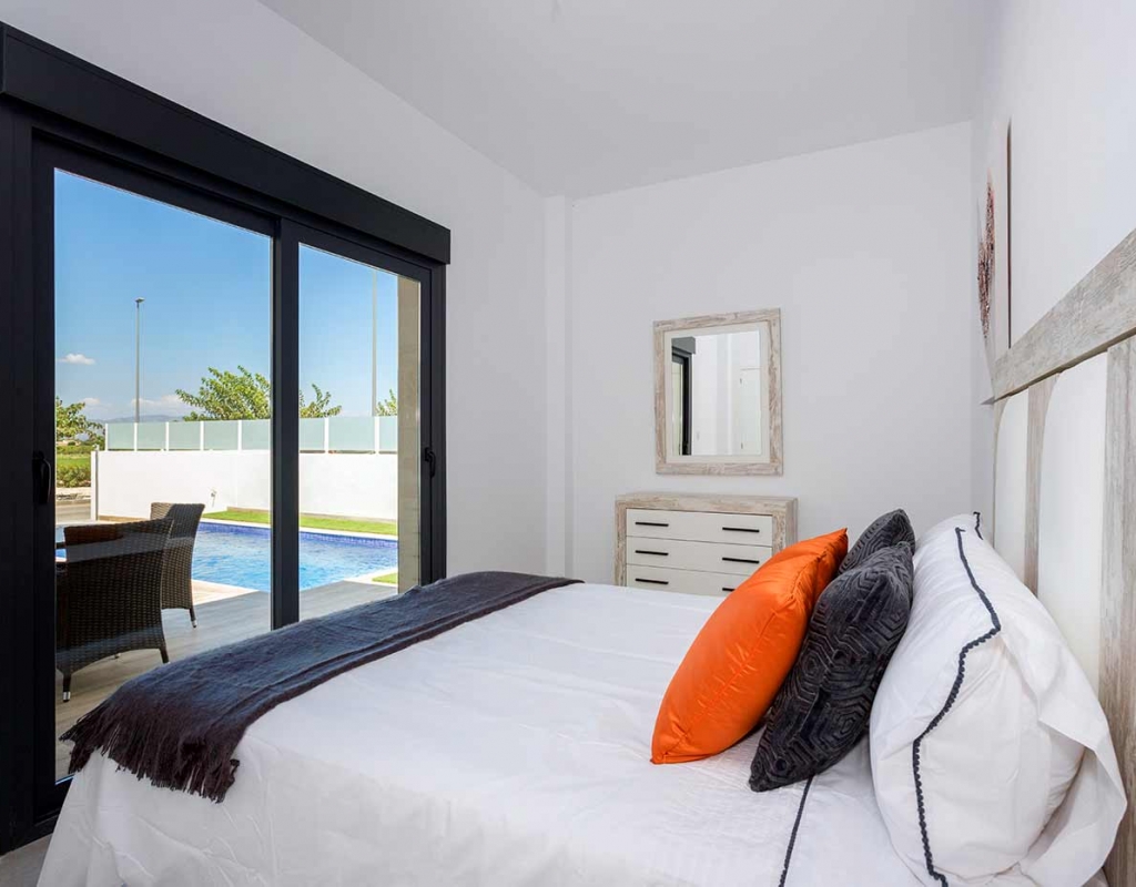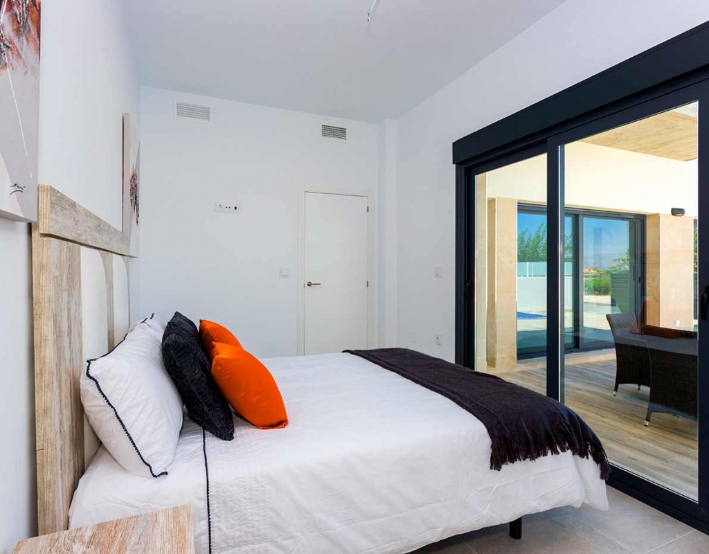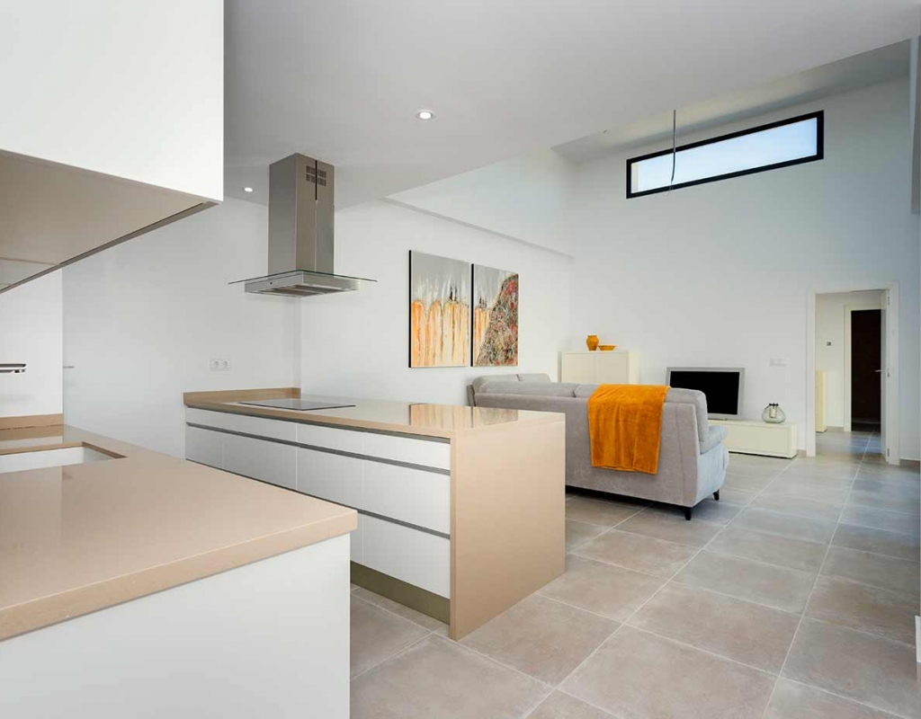 Newly built villas on one level in the new part of Daya Nueva. Only a few minutes walk to the centre of the village. The property consists of 3 bedrooms, 2 bathrooms and a private pool of 18m2. Living/dining room with double height ceiling, open plan kitchen, natural light and option for solarium. The master bedroom has walk in wardrobe option and en suite bathrooms.