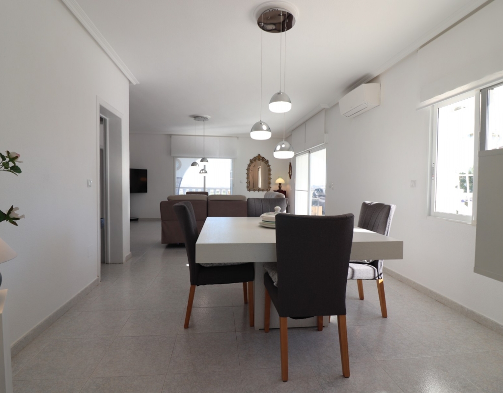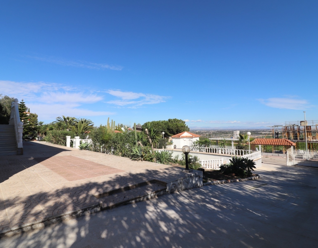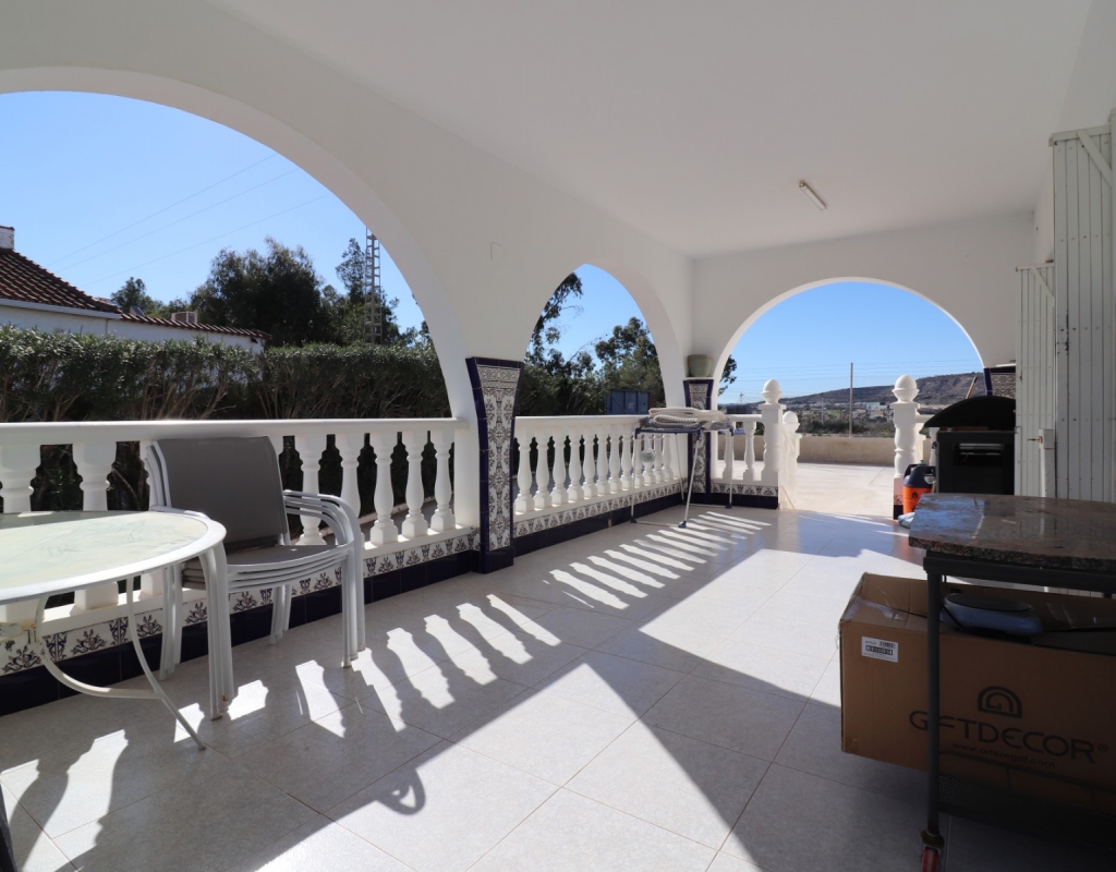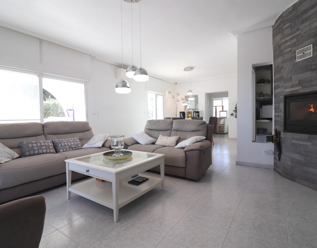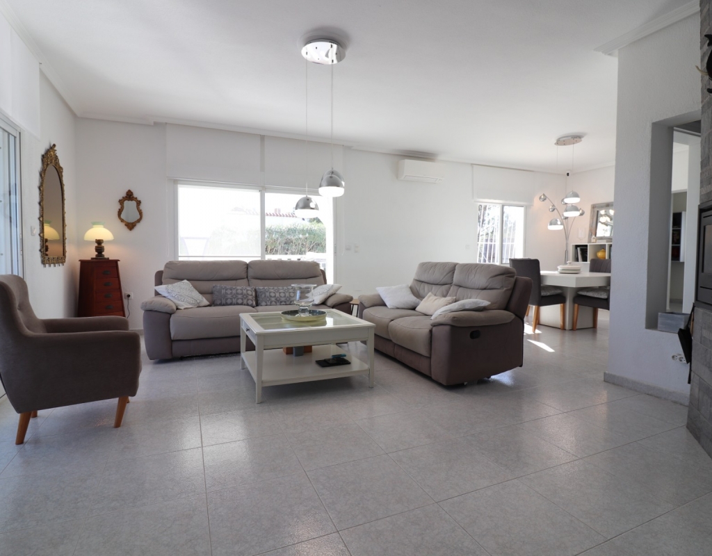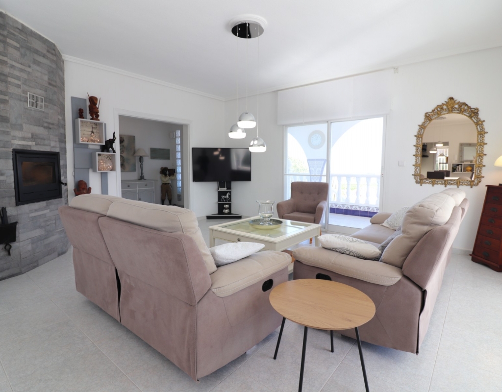 This Spacious, Four Bedroom, Detached Villa in Lomas de la Juliana is located in a prominent position close to La Finca 5* Hotel, Spa and Golf Resort, with bars and restaurants nearby, and Algorfa village just a couple of minutes’ drive away. Towns of Almoradí and Benijofar, with major amenities, are within 5–10 minutes, while the beautiful beaches of the Costa Blanca South can be reached in 15–20 minutes. Set on an impressive 1,355m2 plot, this 215m2 single-level villa is beautifully presented and offers a generous open plan lovely presented living space. The hallway leads through a square arch into the lounge, featuring a feature wall with an inset log burner and two sets of double sliding glazed doors with electric blinds opening onto a covered terrace. There is a dining area, a separate fully fitted kitchen with door to the rear garden, and a utility room. The villa comprises four double bedrooms, all with built-in wardrobes, including a master with en suite shower room, plus a family bathroom. Vast views across the surrounding countryside can be enjoyed from the best part of the home. The landscaped plot includes an outside shower, private 12 x 6 swimming pool (in need of attention), plenty of off road parking, a carport, and a garage for two cars. Additional features include air con units in three rooms, an irrigation system, an outside kitchen, and a store room. This exceptional villa offers spacious, comfortable living with excellent outdoor areas, ideal for enjoying the Mediterranean lifestyle in the sought-after Lomas de la Juliana area of the Costa Blanca South.