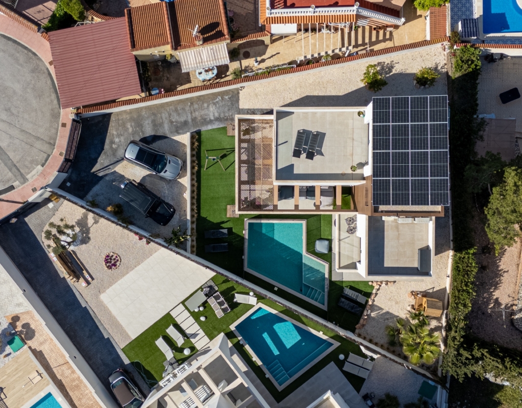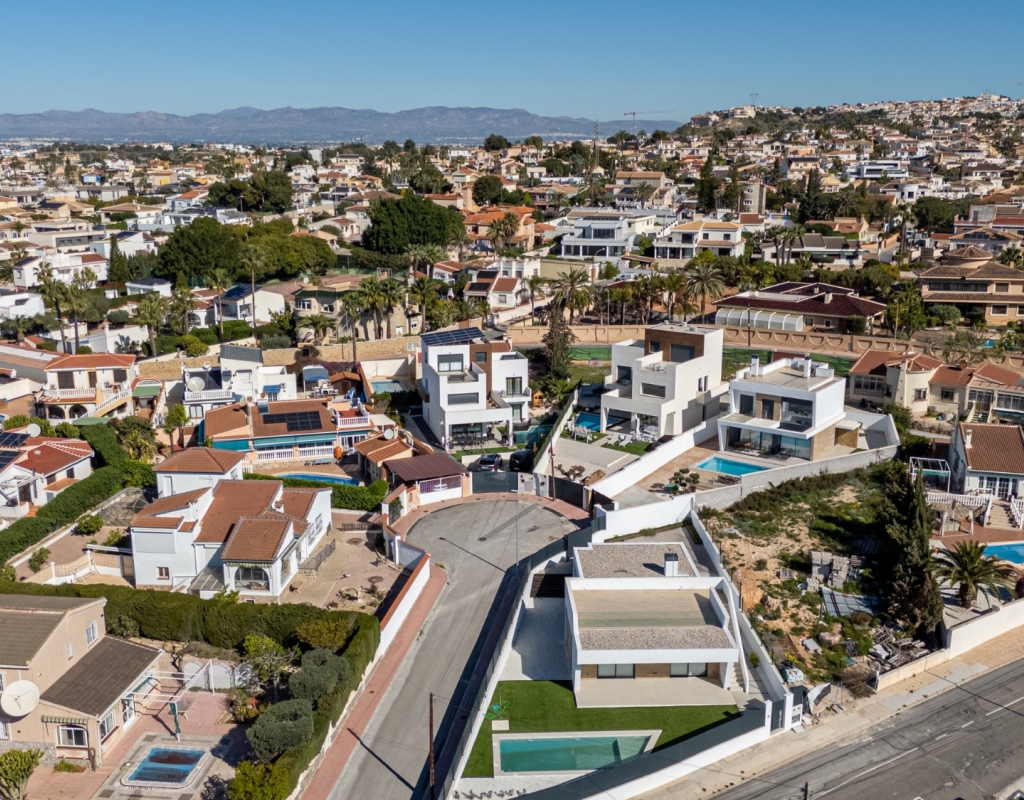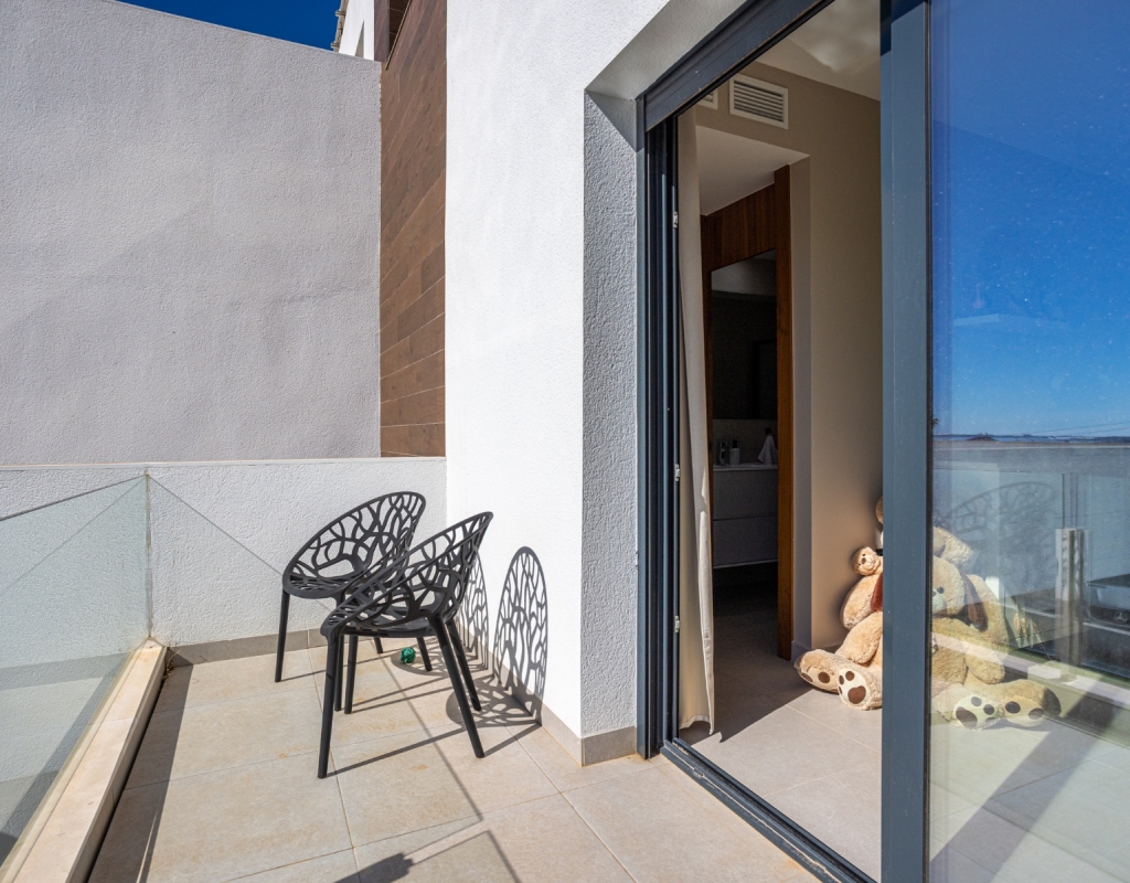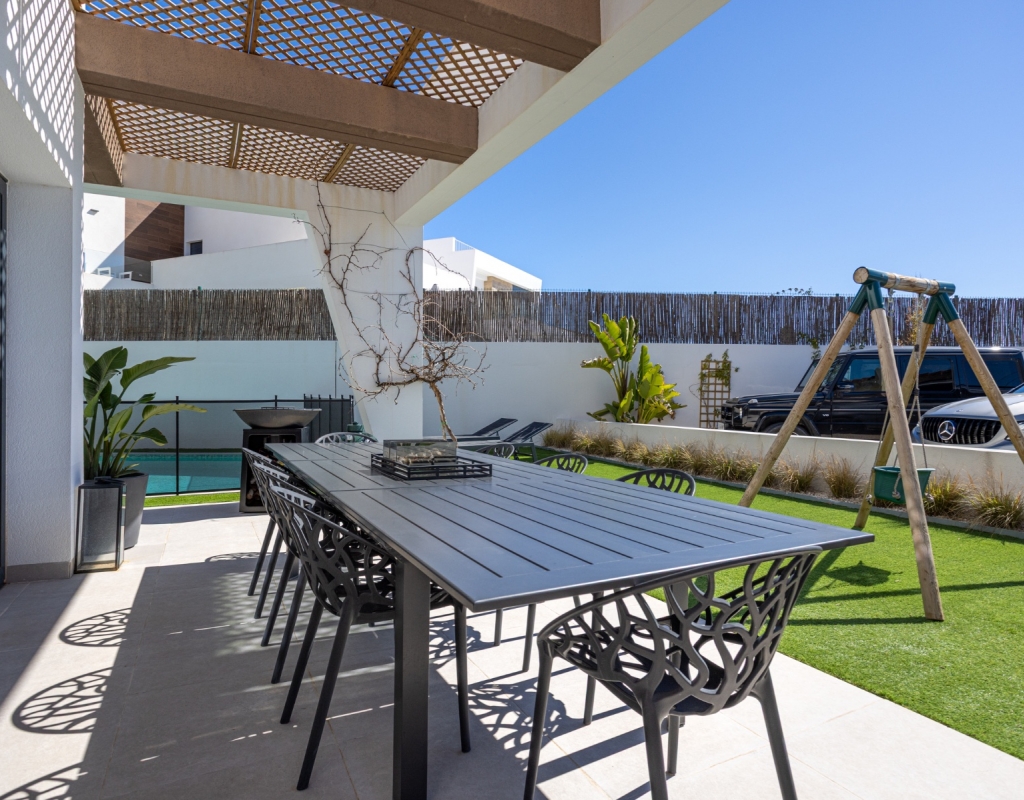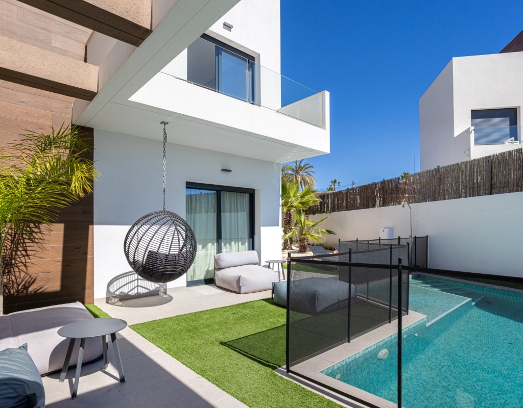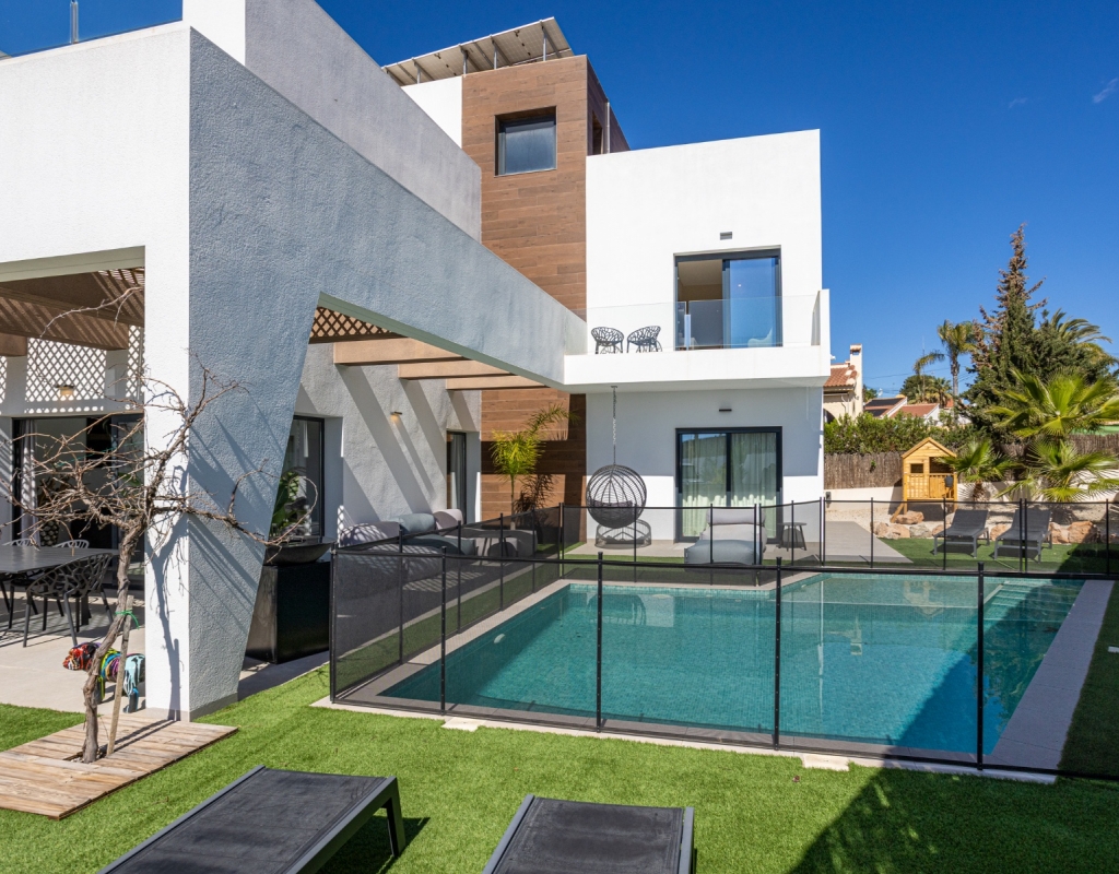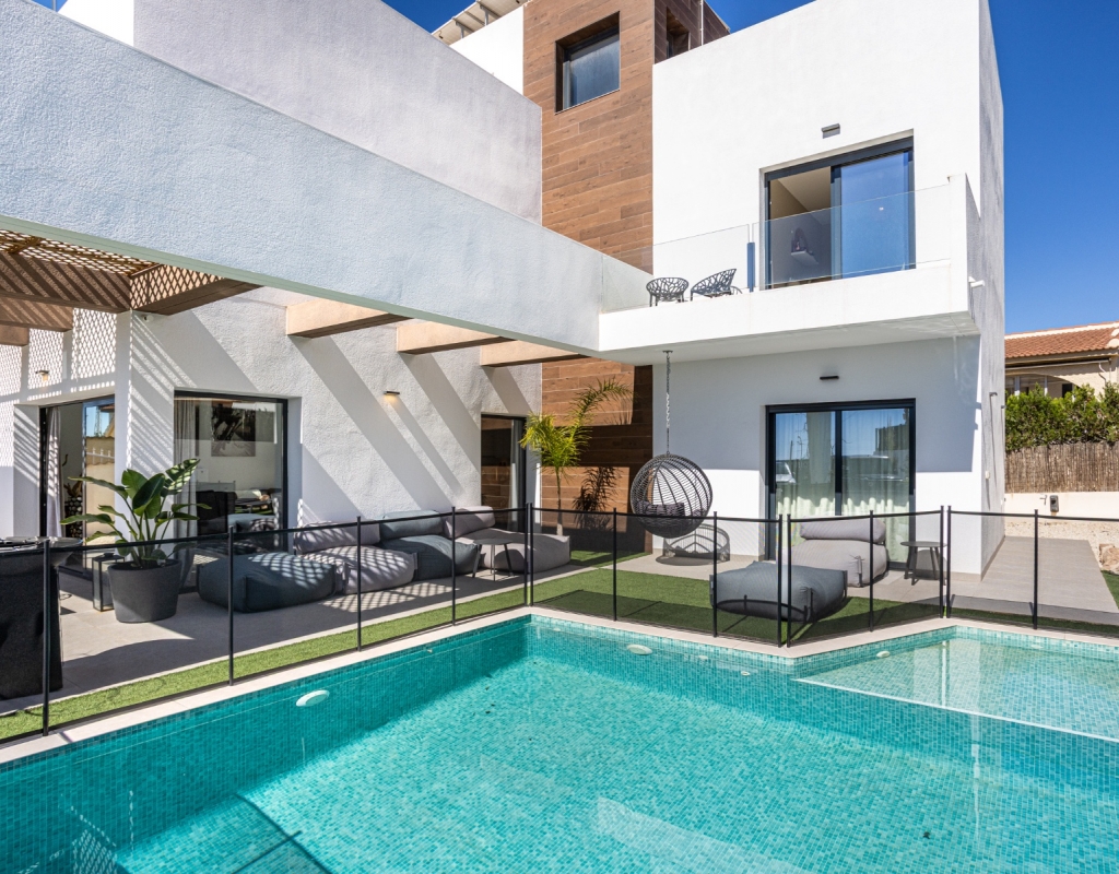 Contemporary 4-Bedroom Villa with Private Pool in Central Ciudad Quesada This modern south-facing villa offers elegant design, spacious living areas, and a superb location in the heart of Ciudad Quesada. Built in 2020 and maintained in excellent condition, it combines contemporary styling with practical comfort, making it an ideal home for families, full-time living, or luxury holidays. Key Features Contemporary detached villa built in 20204 bedrooms & 3 modern bathrooms153 m² build size on a 533 m² private plotPrivate saltwater swimming pool - L-shaped, approximately 7 x 4 meters Off-road parkingOpen-plan kitchen with quality appliancesSouth orientation for all-day sunSolarium with panoramic viewsLaundry/utility room & storage roomAir conditioning - hot and coldUnderfloor heating in bathroomsSolar panelsEnergy rating: BWalking distance to shops, cafés & services (300 m) Property Description This beautifully designed villa offers a bright and contemporary layout across three levels, maximising natural light and functional living. On the main floor, the spacious open-plan living area connects effortlessly to the kitchen and dining zone, creating a warm and airy atmosphere. Large windows frame views of the pool and garden, while an adjoining utility room adds extra convenience. A stylish guest bedroom and full bathroom complete this level. The first floor hosts two generously sized bedrooms, each with its own en-suite bathroom. One suite includes a walk-in wardrobe, while the other opens onto a private balcony overlooking the garden and pool. The top level offers a versatile fourth room—ideal as a home office, studio, or guest space—along with two impressive terraces. From here, you can enjoy far-reaching views over Ciudad Quesada, the surrounding landscape, the salt lakes, and even the distant Mediterranean. The exterior spaces are thoughtfully designed for easy maintenance and year-round enjoyment, including multiple terraces, a sunbathing area, and a private saltwater pool. The plot also provides secure parking on the gated driveway. Location & Lifestyle Situated in a quiet cul-de-sac near the very centre of Ciudad Quesada, this villa offers one of the most convenient and desirable positions in the area. All essential amenities—supermarkets, cafés, shops, pharmacies, restaurants—are reachable within a short walk of just 300 metres. The town offers a lively international community and a wealth of leisure activities, including golf at La Marquesa, mini golf, aqua park, bowling, cycling routes, and nature walks. Private Norwegian and British schools are also located nearby, adding to the area’s appeal for international families. Beaches of Guardamar del Segura: 9 km (approx. 10 minutes by car)Alicante Airport: 38 km (approx. 35 minutes)La Marquesa Golf: 4 kmShops & amenities: 300 m This central yet peaceful setting makes the property ideal for both permanent living and high-value rental investment. Additional Details Double-glazed windows for energy efficiencySaltwater pool with easy-maintenance designMultiple terraces for dining, lounging, and entertainingSolarium with panoramic and partial sea viewsLaundry/utility room for added practicalityHigh-quality flooring and contemporary finishesSouth orientation maximising natural light Next steps Contact us today to book your private viewing of this stunning property in a perfect location to experience just what this villa has to offer.