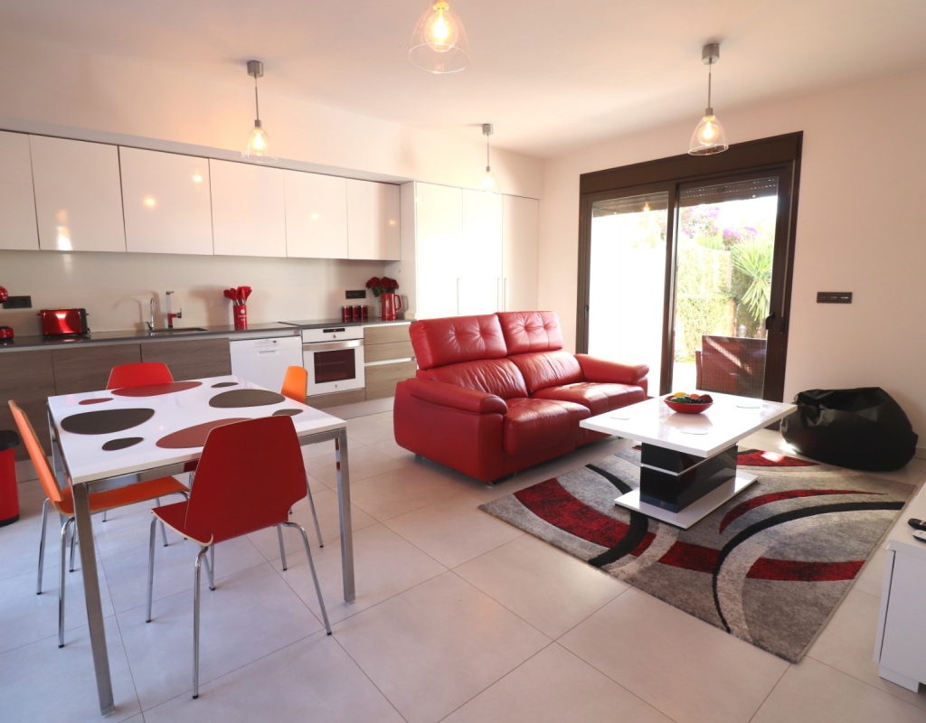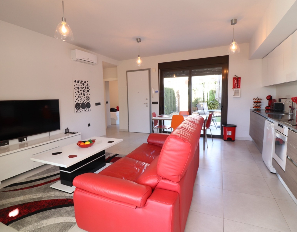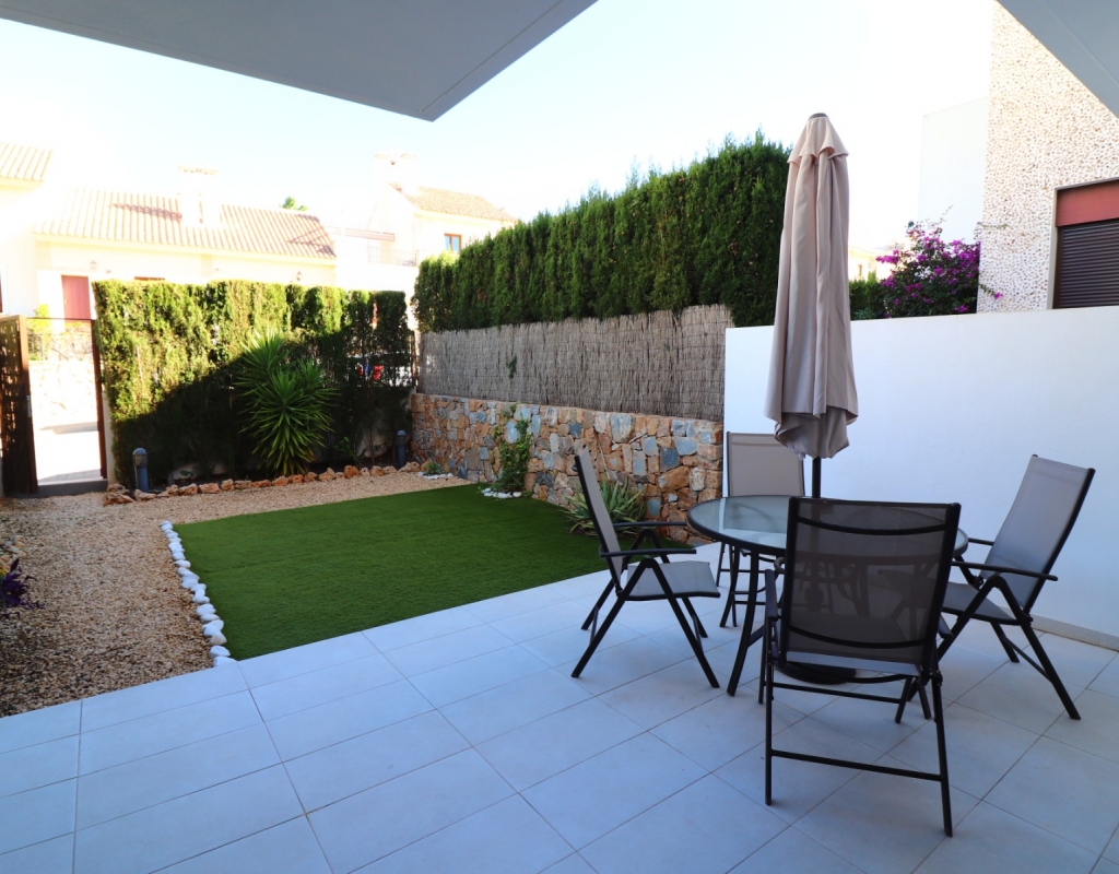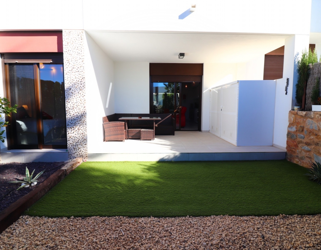 This West Facing, Two Bedroom, Ground Floor Apartment in La Finca 5* Hotel, Spa & Golf Resort is located within one of the most prestigious areas of the Costa Blanca South. Bars, shops and restaurants are just a 15 minute walk away, while Algorfa village is a 5 minute drive. The towns of Almoradí and Benijófar can be reached in around 10 minutes, and a selection of beaches along the coast, along with Orihuela Costa are just 20 minutes away. The property boasts a bright and spacious open plan living area with double sliding glazed doors leading out to the rear garden and covered terrace, plus another set of glazed doors opening to the front garden, which also benefits from a partly covered terrace — perfect for outdoor dining or relaxing. The modern fitted kitchen is sleek and functional, complementing the contemporary style throughout. There are two double bedrooms, both with built-in wardrobes and direct access to the garden, along with two modern shower rooms, one of which is en suite to the master bedroom. The gardens are thoughtfully designed with a mix of tiling, pebbled areas, astro turf, and attractive fern borders providing privacy. Additional features include air conditioning, an irrigation system, and access to a beautifully presented communal pool. A superbly situated and well-appointed home in the exclusive La Finca Resort — ideal for holidays, investment, or full-time living on the Costa Blanca South.