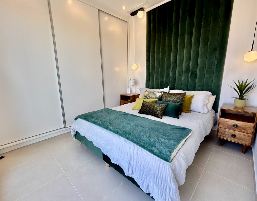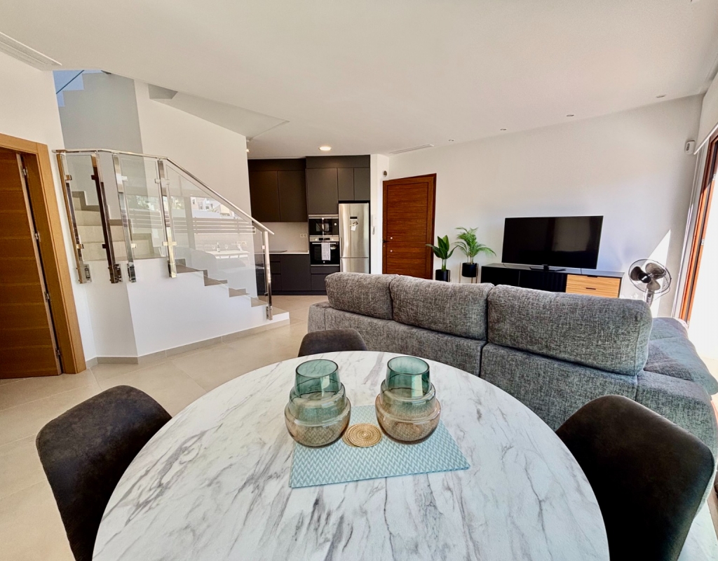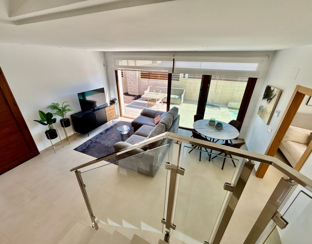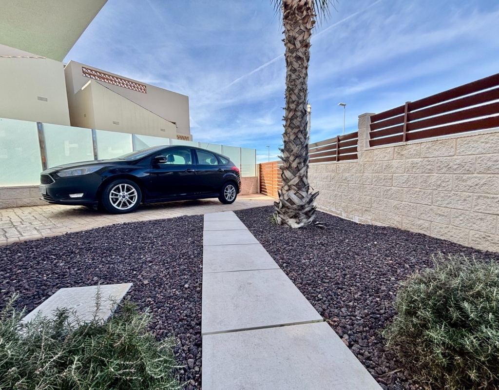 This Very modern, Three Bedroom, Detached Villa in Benijofar is located just a few minutes’ walk from the nearest shops, bars and restaurants, with the stunning beaches of the Costa Blanca South only a 12 minute drive away. This contemporary 131m² villa, set on a 226m² plot, features a bright lounge/dining room with air conditioning that opens through double glazed sliding doors to the garden — perfect for enjoying your morning coffee or evening meals in the summer. The open-plan fully fitted kitchen is complemented by a separate utility room. All three double bedrooms include built-in wardrobes and air conditioning, with all three benefiting from en-suite bathrooms/ shower rooms. One ground floor bedroom opens directly to the garden, while a first floor bedroom has sliding doors leading out to a private solarium. A ground floor toilet provides additional convenience. The property also offers a private swimming pool, a low-maintenance garden with irrigation system and a private solarium with views over the private garden, private pool and town. Off-street parking completes this stylish and modern home. A fantastic opportunity for a holiday home, rental investment or permanent living in a central yet peaceful location on the Costa Blanca South.