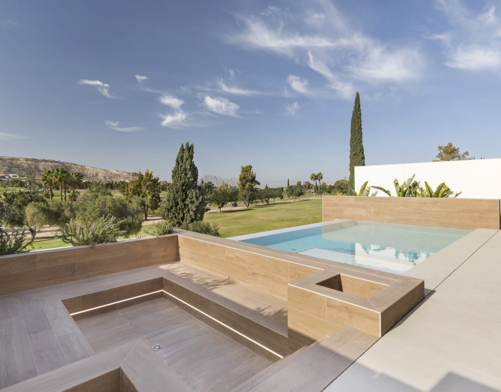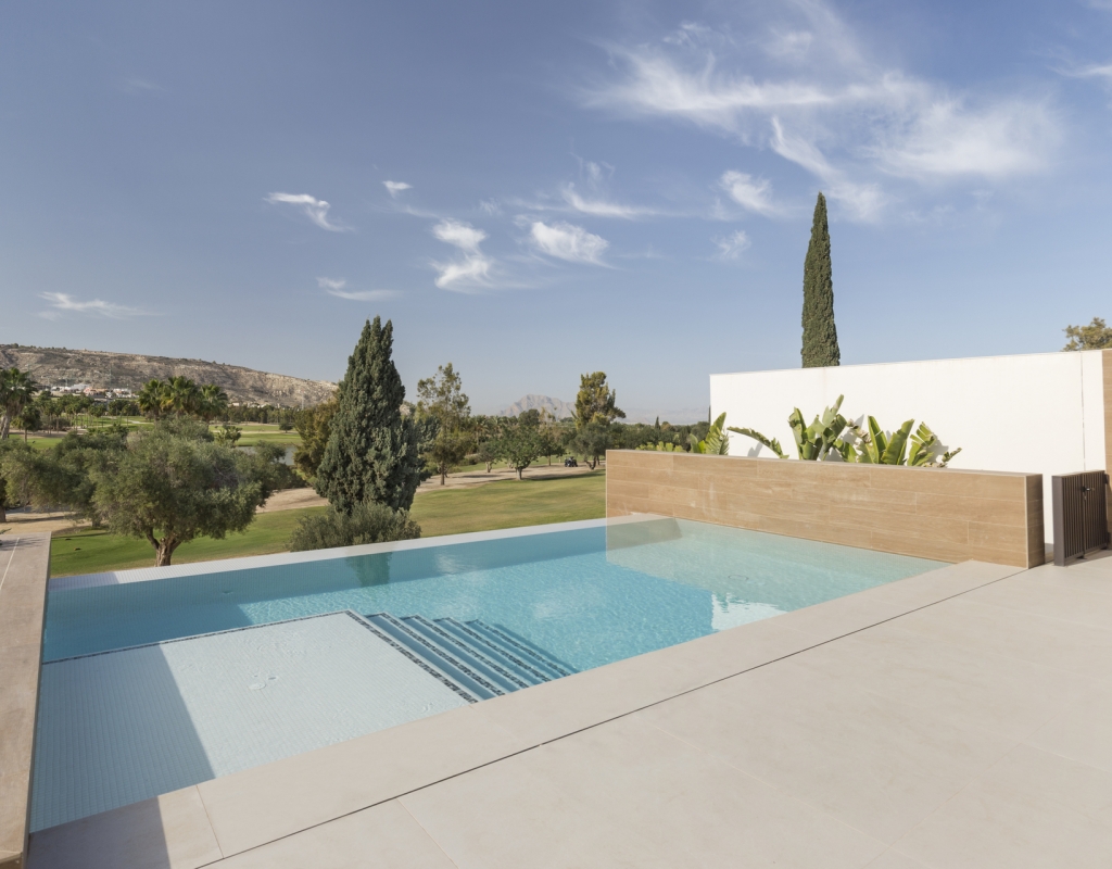 The exterior design of these villas in Algorfa stands out for its elegance and functionality. Each property includes a private garden, perfect for enjoying the Mediterranean climate and hosting outdoor gatherings. Additionally, the villas feature a terrace that offers additional space for leisure and relaxation. The presence of a solarium allows for panoramic views and moments of relaxation under the sun. For added convenience, each villa comes with a private garage, ensuring easy and secure access to the home. The proximity to the golf course, just 100 meters away, adds significant value to the location, offering a green and well-maintained environment.