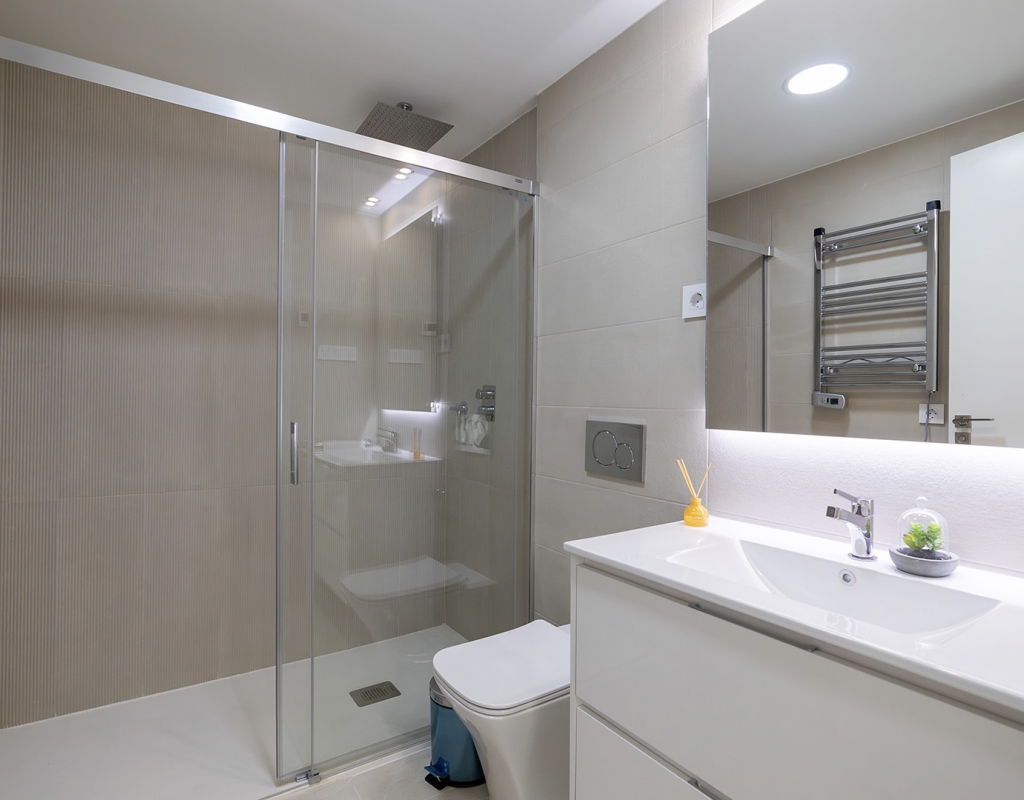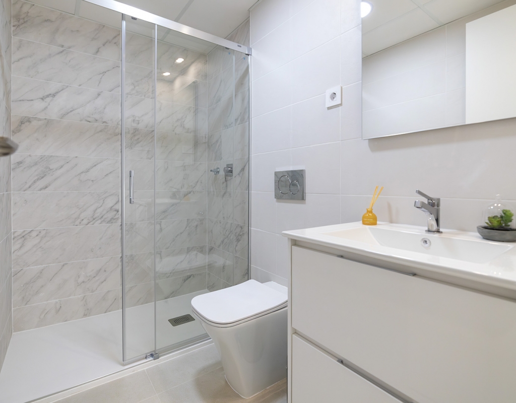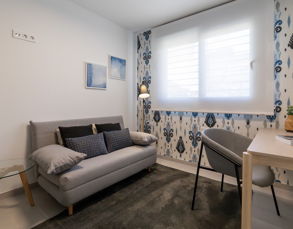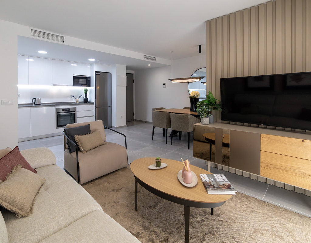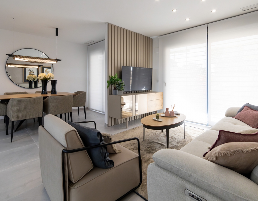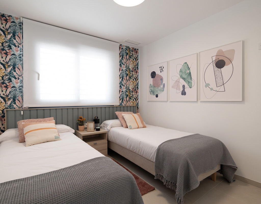 The interior design of the properties in this Torrevieja residential is crafted to offer maximum comfort and functionality. With three bedrooms and two bathrooms, each space is carefully arranged to optimize space usage. Porcelain stoneware floors add a modern and elegant touch, while built-in wardrobes provide practical and aesthetic storage solutions. The homes are designed to make the most of natural light, creating a warm and bright atmosphere. The combination of quality materials and contemporary design ensures that each home is a haven of tranquility and style.