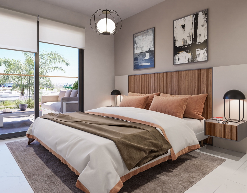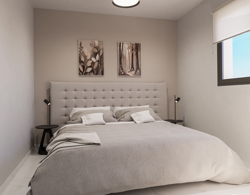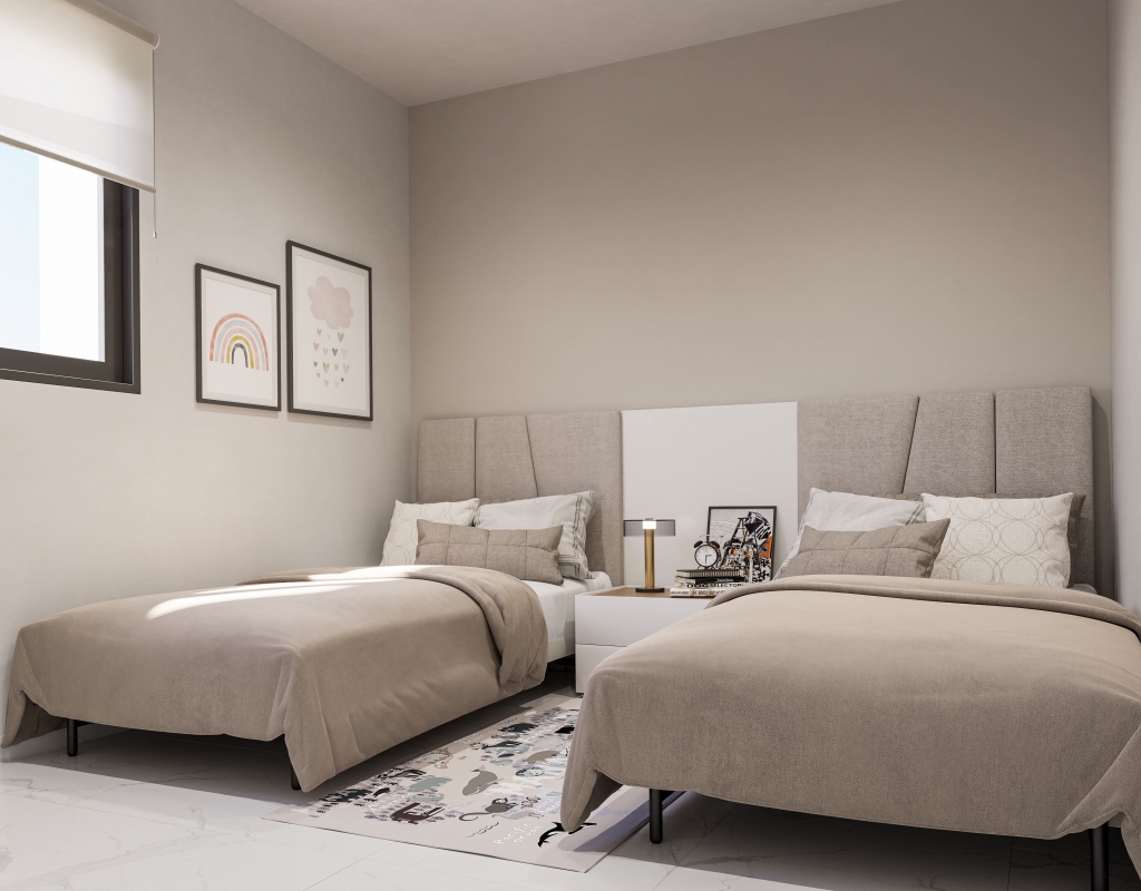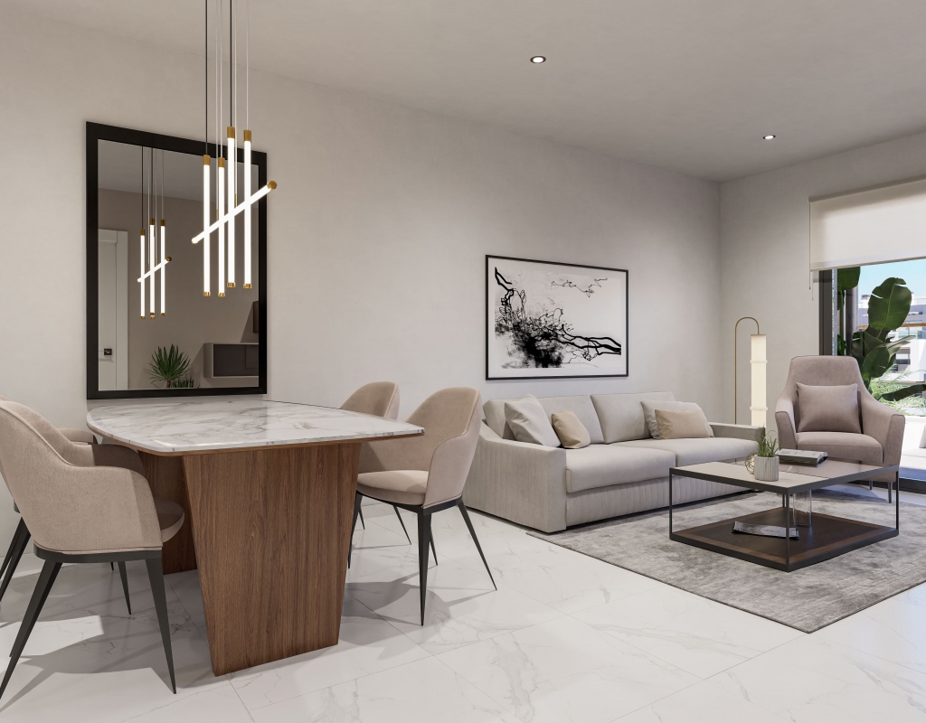 The interior of these townhouses in Torrevieja is designed to offer a modern and welcoming atmosphere. Ceramic floors add a touch of elegance and are easy to maintain, ideal for today's lifestyle. The layout of three bedrooms and three bathrooms ensures privacy and comfort for all family members. The kitchen is equipped with high-end appliances, making daily tasks easier and allowing you to enjoy cooking as a pleasant experience. Air conditioning and underfloor heating ensure a comfortable temperature throughout the year, adapting to the needs of each season. Built-in wardrobes offer efficient storage solutions, keeping the space tidy and functional. Every detail has been carefully considered to create a home that combines style and comfort.